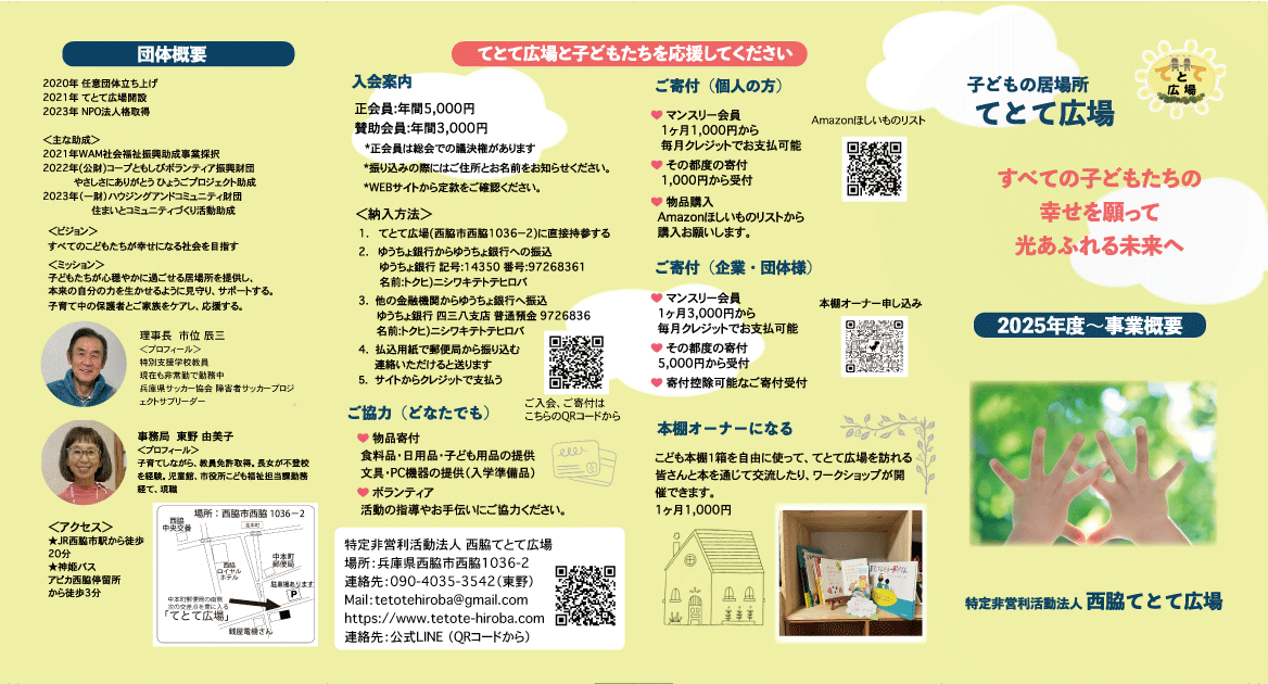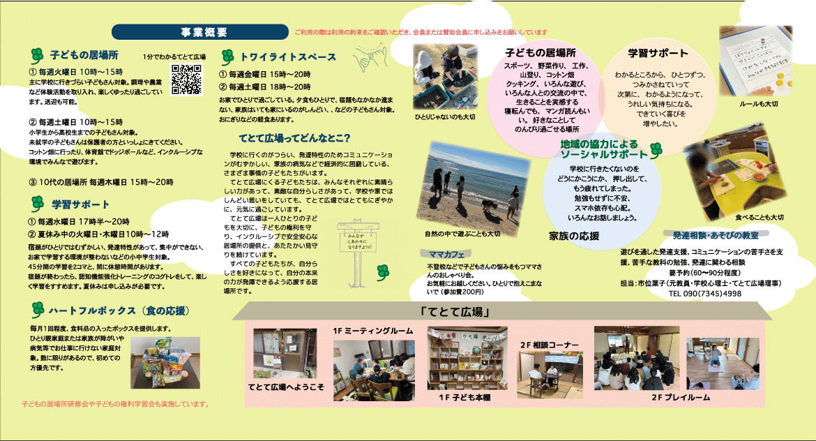 2021年 生きづらさを抱えた子どもとその家族のサポートを目的に、子どもの居場所「てとて広場」を開設。てとて広場にて、学習サポート、発達・教育相談、学校に行きづらい子どもの保護者の広場事業を行う。 2022年 夜間の子どもの居場所、大人の居場所、障がい者対象のパソコン講座を行う。 2023年 NPO法人認証 高校生以上の若者広場を始める。 |