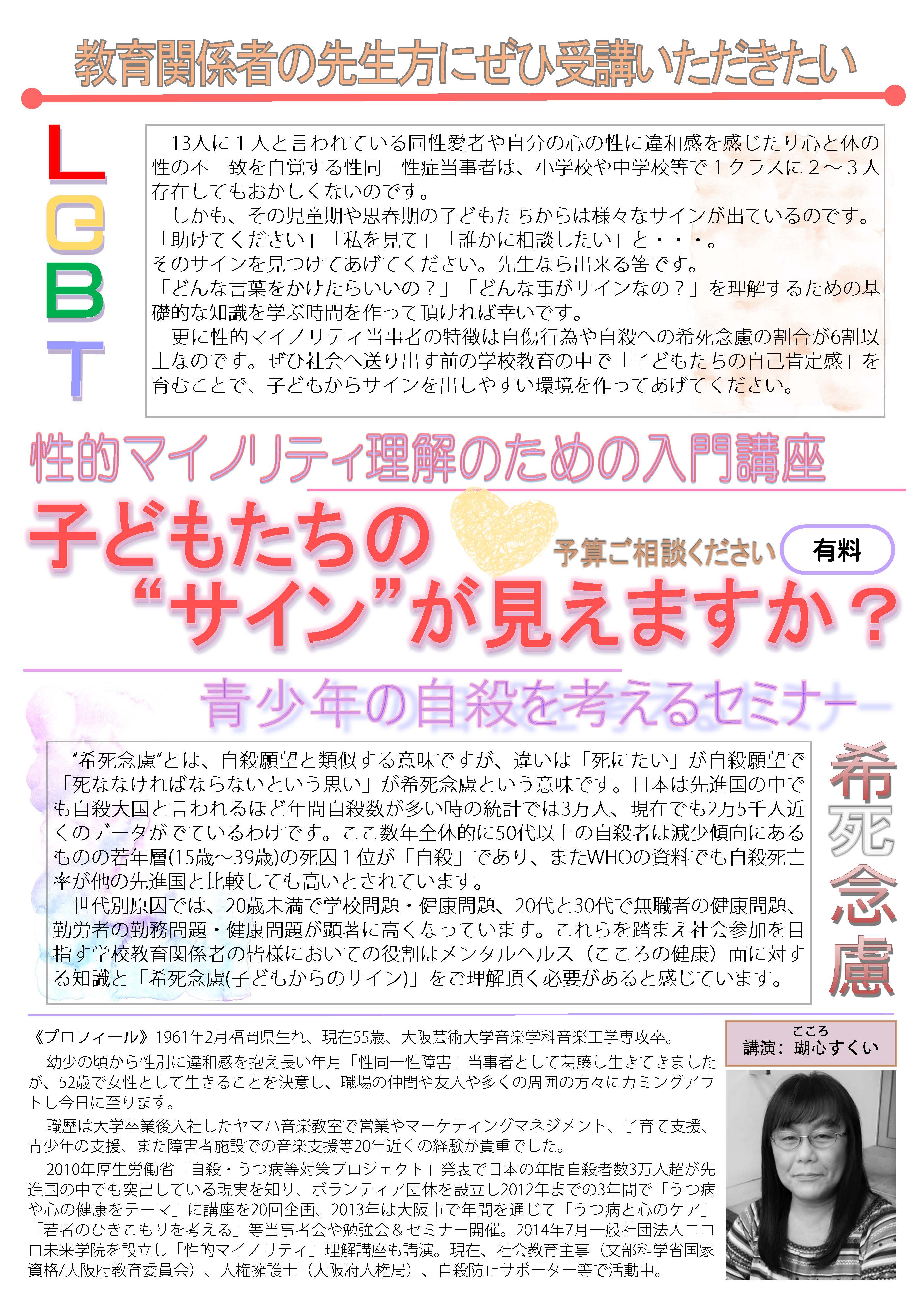 2013年3月からはココロ未来学院をボランティア団体として大阪市社会福祉協議会に登録し活動を行政や地域やNPOとの連携に重点を置き、街づくり活動として大阪市住之江区の街づくりラウンドテーブルに参加し、地域イベント「国際支援チャリティー」「大阪市阪堺電車の界隈活性策ちん電バル」へのスタッフ参加等行っています。 2013年10月からは更にココロ未来学院で活動をする中で『うつ病と心のケア』『若者のひきこもり』『シングルマザーの心のケア』『入門、性同一性障がい』等の勉強会や人権無料相談等の活動を経ながら、多くの講座やワークショップの場を持ちつつ、2014年7月にココロ未来学院を一般社団法人にし活動範囲を広げました。 2015年11月に設立した「こころ未来社会学国際共生研究所」で2016年1月には「NGO国際青少年こころネットワーク」を創設、11月には不登校支援フリースクールを設立予定です。 |