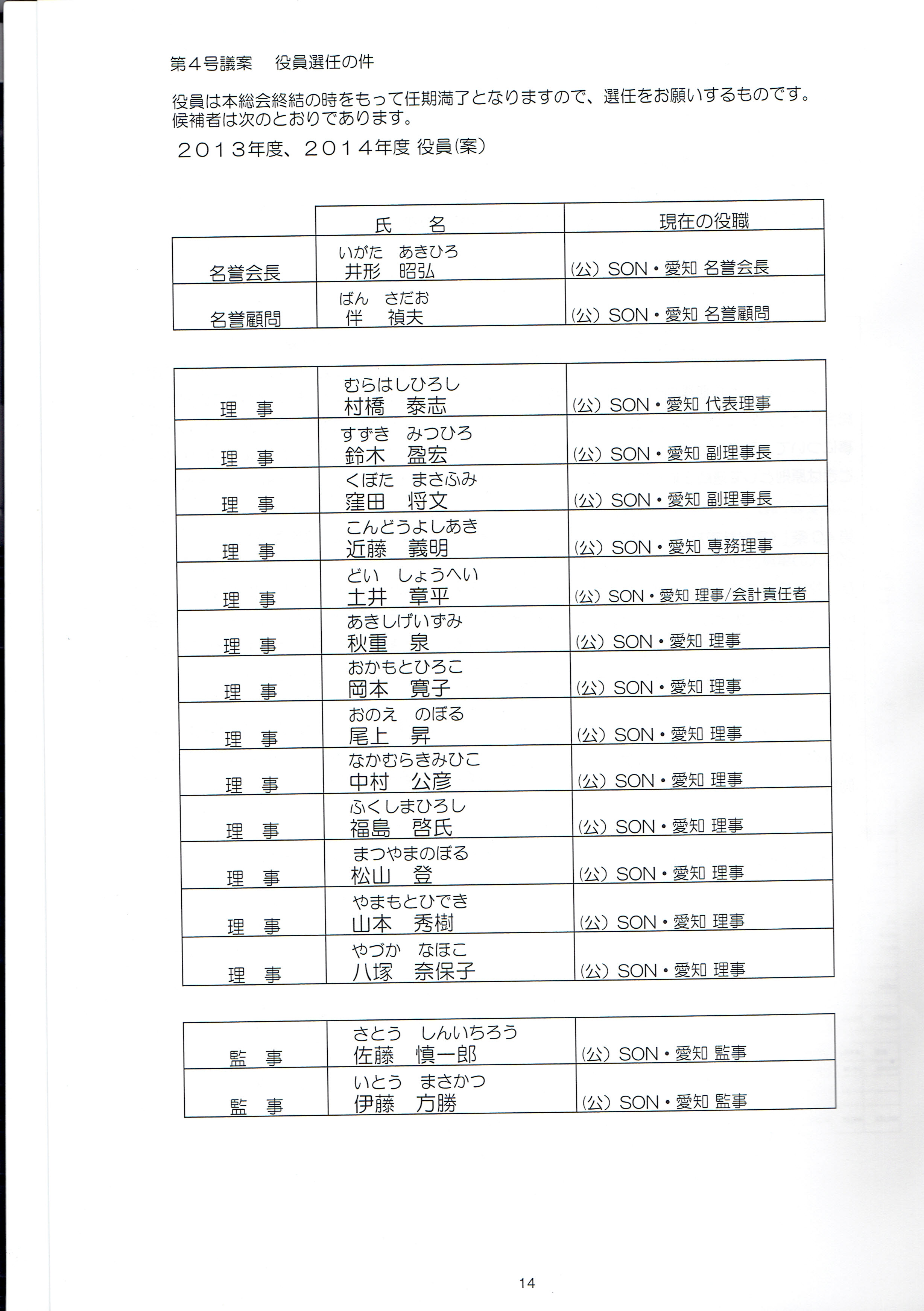 第1回水泳プログラム 開催 2000 第1回サッカープログラム 開催 スペシャルオリンピックス日本•愛知 設立 2001 第1回ボウリングプログラム 開催 日本山岳会東海支部による登山 開催 堀田祭り 参加 第1回陸上プログラム 開催 スペシャルサンクスパーティー 2002 SO日本/夏季ナショナルゲームin東京 参加 2003 第1回スキープログラム 開催 第1回スケートプログラム 開催 第1回フロアホッケープログラム 開催 第1回バスケットボールプログラム 開催 2004 SO日本/冬季ナショナルゲームin長野 参加 トーチラン(10月~12月)セントレアライン等 2005 2005年スペシャル冬季世界大会 参加 SO東日本/バスケットボール競技会 参加 第1回フライングディスクプログラム 開催 創立5周年記念式典・祝賀会 2006 SO冬季大会メモリアル・フロアホッケー大会 参加 第1回テニスプログラム 開催 第1回ゴルフプログラム 開催 第1回ソフトボールプログラム 開催 SON夏季ナショナルゲームin熊本 参加 SON東京第1回冬季地区競技会(スケート)参加 2007 第1回名古屋グランパスエイト&SON・愛知 サッカーイベント 開催 第1回バトミントンプログラム 開催 第1回ALPs in 愛知 開催 第1回アスリートニュース発刊 2008 SO日本/冬季ナショナルゲームin 山形 参加 SON長野 夏季地区大会 参加 三重陸上競技会 参加 2008年第1回SON東海・北信越ブロックボウリング競技会 お相撲と美味しいちゃんこ体験ツアー 開催 2009 第1回キンダーフィットネス開催 スペシャルオリンピックス日本•愛知 解散 (6月30日) 一般社団法人 スペシャルオリンピックス日本•愛知 設立(7月1日) 2010 10周年記念イベント実施(10月17日) SON/夏季ナショナルゲーム in 大阪 参加 10周年記念式典&サンクスパーティー(12月12日) 2011 公益社団法人 スペシャルオリンピックス日本・愛知 認定(9月1日) SO/夏季世界大会 in アテネ 参加 2012 SO日本/冬季ナショナルゲームin福島 参加 第2回ジョギング大会 開催 第6回SON愛知 夏季地区大会 開催 2013 第3回ジョギングフェスティバル 開催 SON・熊本 全国水泳競技大会 参加 第7回SON・愛知 夏季地区大会 開催 代表者の略歴 あゆの風法律事務所 所長弁護士、 愛知県公安委員長、日本弁護士会副会長、中京大学法科大学院 教授などを歴任 |