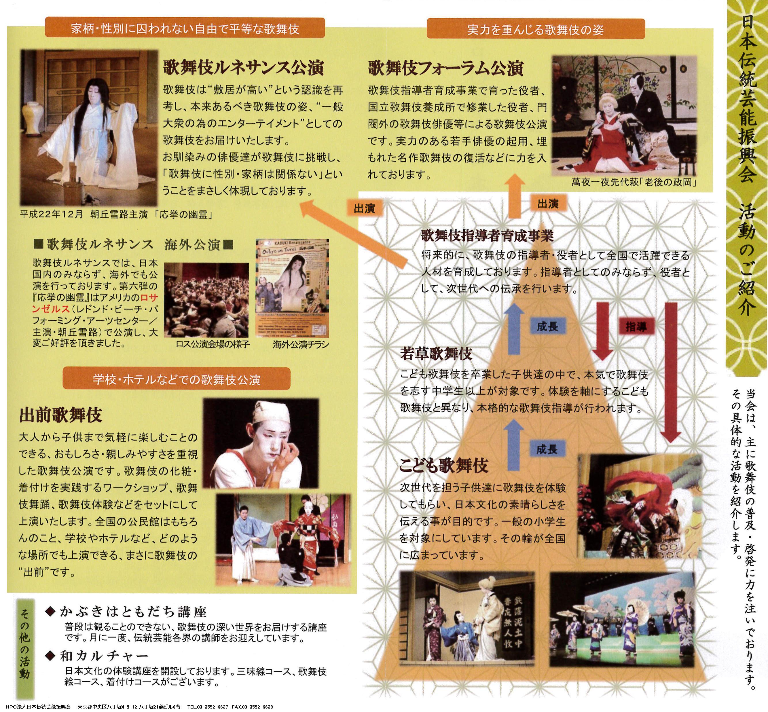 全国にて低料金で行う、歌舞伎普及を目的とした、門閥外の俳優による歌舞伎公演(歌舞伎の化粧、衣裳等のワークショップ付き) 【平成元年~継続 かぶきはともだち講座 ※柝の会時代の活動含む】 歌舞伎に親しみやすさを感じてもらうための市民講座。平成23年8月「松本幸四郎対談」、10月「歌舞伎の化粧講座」など。 【平成17年~継続 こども歌舞伎育成事業】 小学2年生~6年生までの一般のこども達が歌舞伎の訓練を受け、年2回公演を行う。 【平成21年~継続 若草歌舞伎事業】 こども歌舞伎にて経験を積んだ者が更に芸を磨くため、中学生~高校生が所属している。こども歌舞伎同様、年2回公演を行う。 【平成20年~21年 歌舞伎ルネサンス公演(6回)】 「歌舞伎は誰でも演じることができる」をテーマに、朝丘雪路、伊吹五郎などを迎開催した公演。 【海外歌舞伎公演事業】 平成17年 ドイツ招聘公演 平成19年 中国公演 平成22年 アメリカ公演 平成24年 シンガポール・マレーシア公演 |