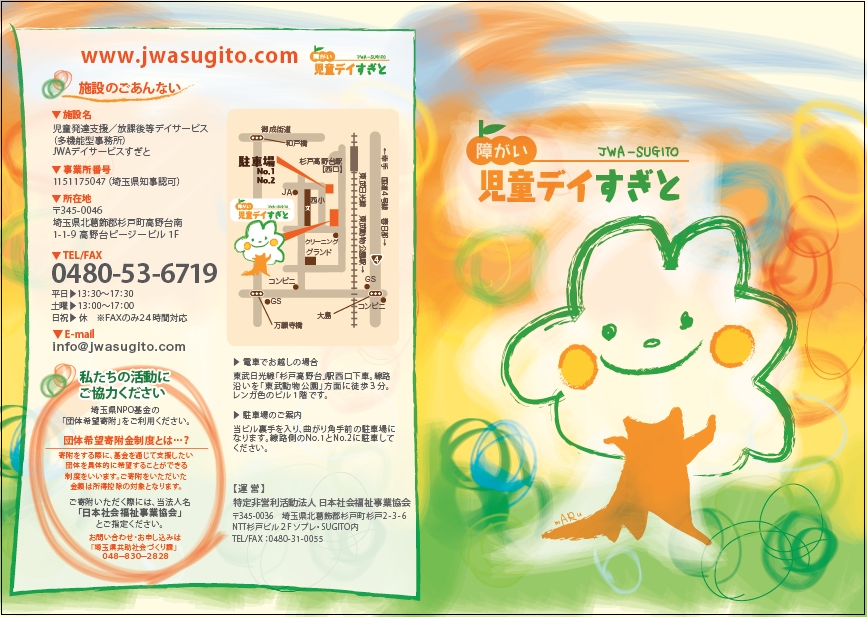 1.障害児童放課後等デイサービス並びに児童発達支援事業所開設・運営 施設名:児童デイすぎと・いちばん星 2.アートワークショップ開催(協力:エンドウキヨシ) 3.日光歴史街道まちづくりBOOK制作(調査・取材・制作) 4.障害児童放課後等デイサービス並びに児童発達支援事業所開設・運営 施設名:児童デイすぎと・ちいさな木 |