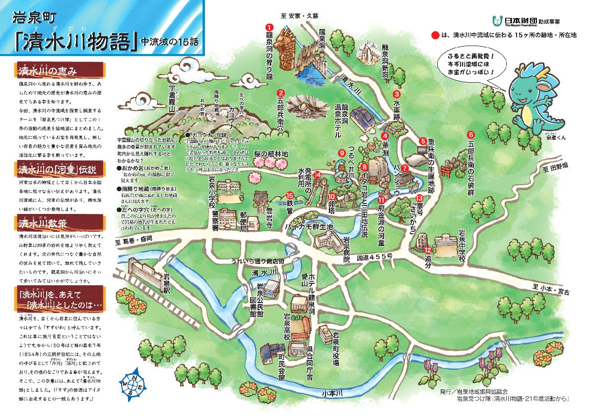 日本三大鍾乳洞に数えられる龍泉洞から流れる清水川を訪ね歩き、昔から伝わる言い伝えや伝説、石碑や跡地を掘り起こそうと、結成された有志「岩泉見つけ隊」の1年間の探索活動の成果を絵地図にまとめた。