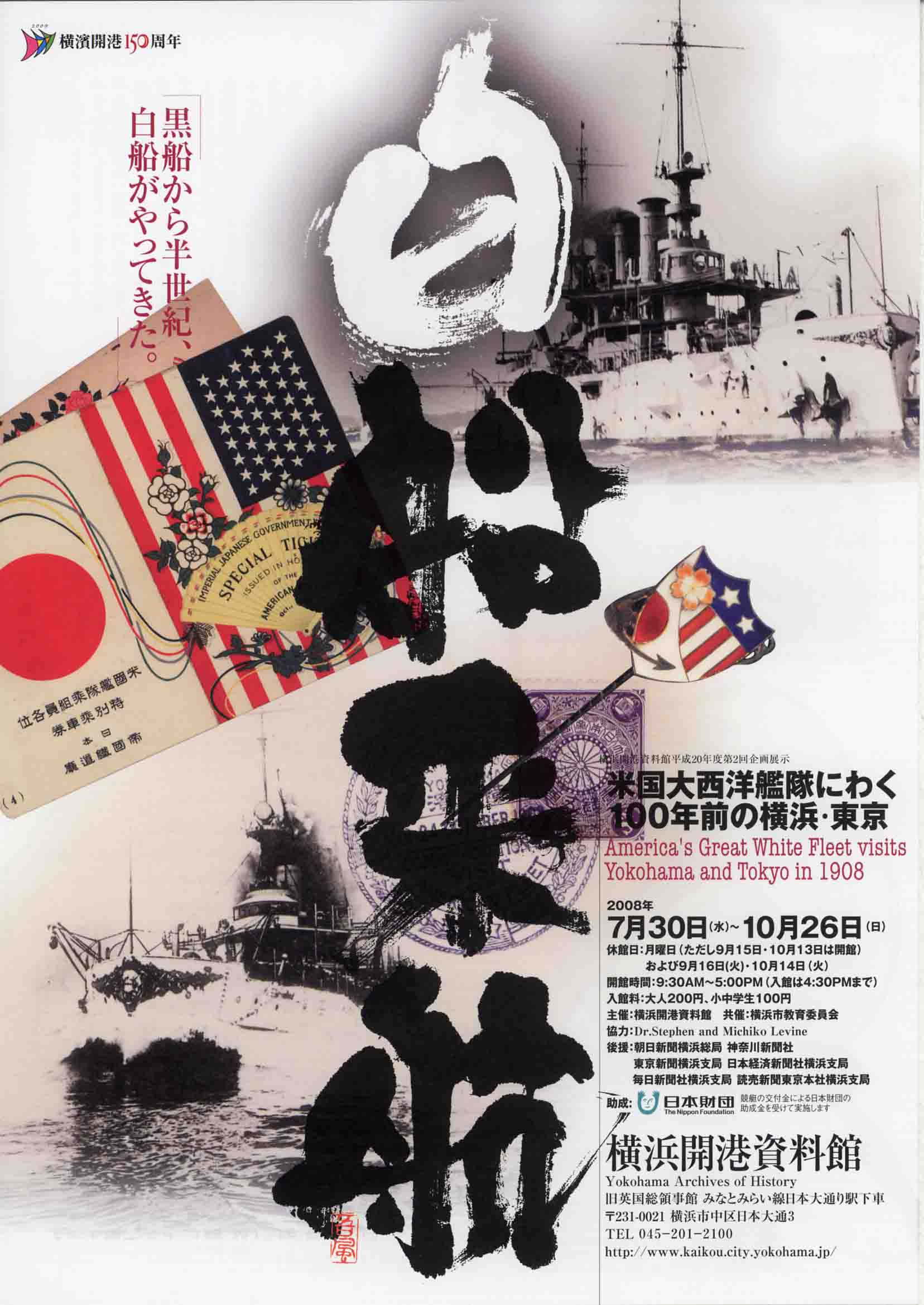 1 展示会期など (1)展示期間:2008年7月30日(水)~10月26日(日) (2)主催:横浜開港資料館 (3)開催場所:横浜開港資料館 (4)共催:横浜市教育委員会 (5)助成:日本財団 (6)協力:Dr.Stephen and Michiko Levine (7)後援:朝日新聞横浜総局/ 神奈川新聞社/ 東京新聞横浜支局/ 日本経済新聞社横浜支局毎日新聞社横浜支局/ 読売新聞東京本社横浜支局 2 展示趣旨 日米関係史の中で、横浜が舞台となった大きな出来事が三つあります。一つ目は幕末のペリー来航、三つ目は第二次世界大戦後のマッカーサーの進駐。今回の展示でとりあげるのは、その間に起こった二つ目の出来事、スペリー提督率いる白船来航です。 1908年(明治41)10月、船体を白く塗りかえた米国大西洋艦隊の「白船」が、世界一周の途中で横浜に来航しました。日露戦争に勝利した日本は、満州での利権や太平洋での影響力などをめぐり、アメリカとの対立を深めていました。白船の派遣は、日本にアメリカの海軍力を誇示し、軍事的圧力をかけることが一つの目的でした。 しかし、横浜にやってきた白船を待ち受けていたのは、政府や横浜・東京の人びとの歓迎の嵐でした。日米開戦かとまで囁かれた欧米メディアの予想を大きく裏切る大歓迎によって、アメリカの世論が好転し、両国の緊張がとかれたのです。 白船来航は日米両国が国家をあげて挑んだビックイベントでした。この劇的な出来事から今年でちょうど100年。本展示では、白船来航にわいた横浜・東京の様子や、メディアの反応などについて、白船来航関係資料をあつめたレヴィーン・コレクションを中心に構成し、対立と友好が織りなす日米関係史の一頁を紹介します。 3 展示構成 プロローグ 艦隊の軌跡・100年前の市街 -- Prologue (1) 大西洋艦隊、世界周航へ -- Embarkation of the Fleet's world Cruise (2) 艦隊の横浜到着 -- Fleet's arrival in Yokohama (3) 横浜での交歓 -- Welcoming the Fleet's members at the pier (4) 歓迎の横浜市街 -- City views of Yokohama's welcome (5) 提督の入京 -- Fleet commander's welcome in Tokyo (6) 歓迎の東京市街 -- City views of Tokyo's welcome (7) メディアの反応と影響 -- Media's response to events (8) 歓迎のあかし 記念絵葉書と記念品 -- Picture postcards and other memorabilia (9) エピローグ 黒船と白船・開港150年へ – Epilogue 4 展示資料点数 約200点(うちレヴィーン・コレクション170点あまり) 5 来館者数(会期77日間) 17,334人 |