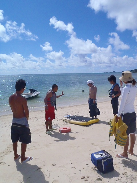 朝10時より12時半まで、PWC(水上バイク)レスキュー体験勉強会を行いました。NPO法人ウォーターリスクマネジメント協会のカリキュラムが中心です。 久米島イーフビーチにて、ホテルスタッフ3名、タンデムフライトサービスlele(パラグライダーショップ)から2名、日本災害救助推進協議会代表の計6名がお集まり頂きました。 |