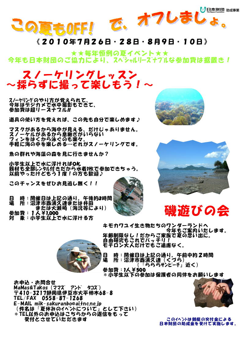 2010年夏に開催した「磯遊びの会」及び「スノーケリングレッスン」の参加者募集チラシ