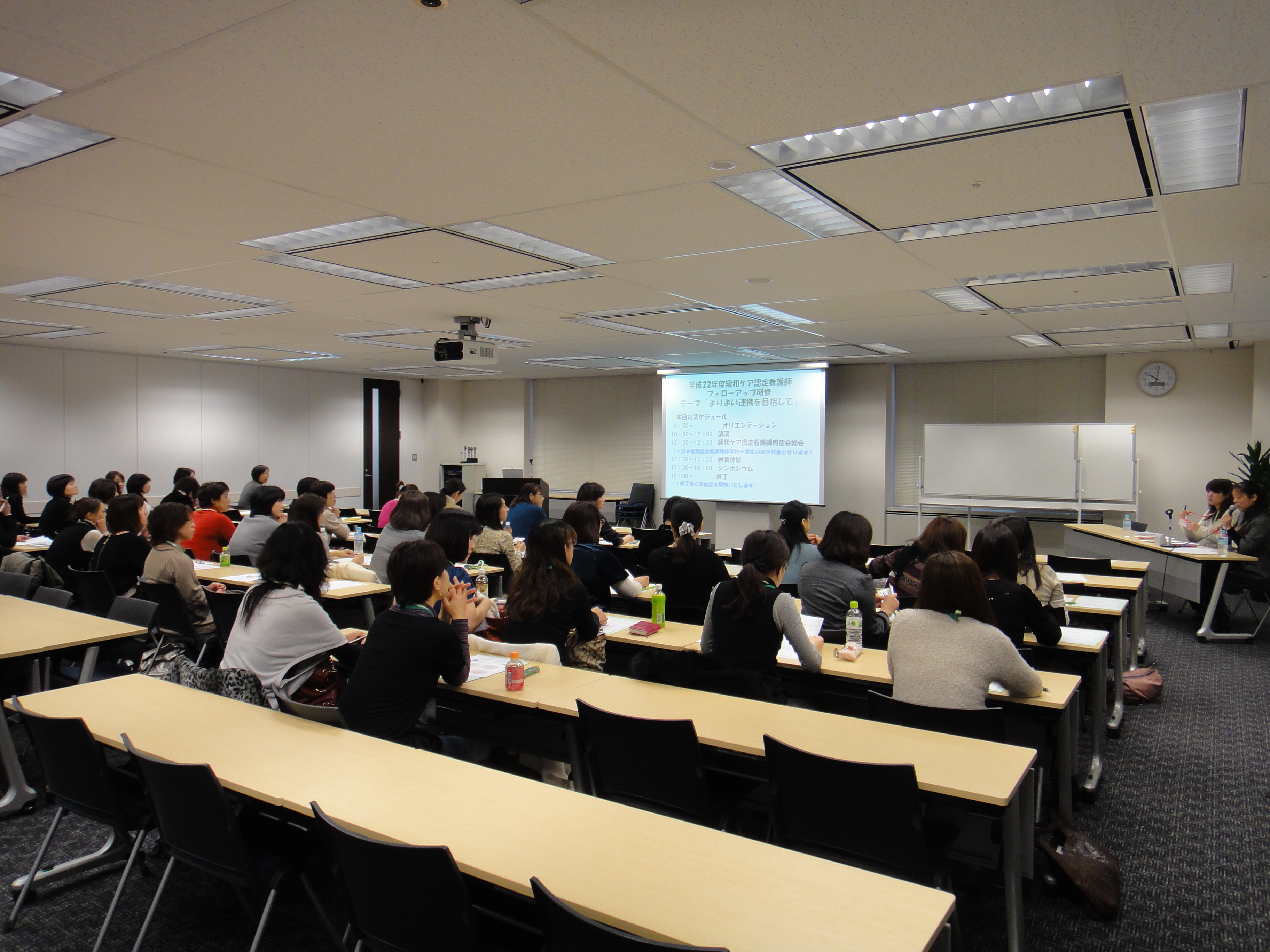 【日時】2010年12月11日(土) 10:00-16:00 【場所】大手町ファーストスクエアカンファレンス RoomA 【研修テーマ】よりよい連携を目指して 【研修内容】講義「在宅で過ごすがん患者と家族を支援する看護師の役割」 講師:角田直枝先生(茨城県立中央病院 看護局長) シンポジウム「よりよい連携を目指して」 シンポジスト:木下ゆみ先生(杏林大学医学部付属病院) 吉井朋代先生(セントケア訪問看護ステーションあい) 福地智巴先生(静岡県立静岡がんセンター) 【参加者】社団法人日本看護協会認定緩和ケア認定看護師68名 【参加者の評価】講義、シンポジウムともに臨床看護実践に沿った内容であったのでわかりやすいと評価を受けました。受講者が研修で学んだ内容をすぐに自分の知識・技術に活かせるという評価もありました。 |