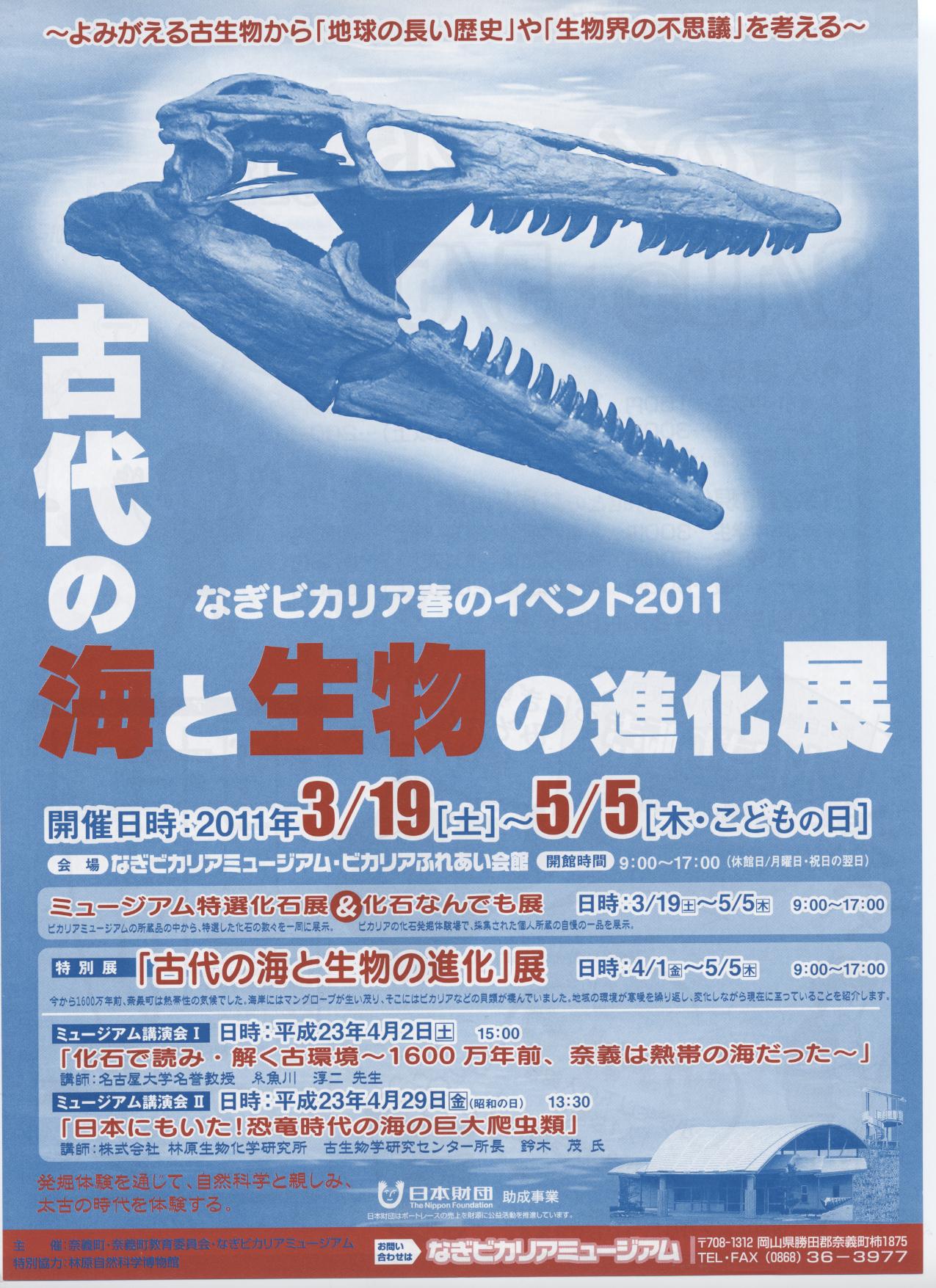 なぎビカリア春のイベント2011「古代の海と生物の進化」展 日時:3月19日(土)~5月5日(木) 9:00~17:00 ミュージアム講演会 (1) 「化石で読み・解く古環境~1600万年前、奈義は熱帯の海だっ た~」(終了) ミュージアム講演会 (2) 「日本にもいた!恐竜時代の海の巨大爬虫類」 講師:(株)林原生物化学研究所 古生物学研修センター所長 鈴木茂氏 事業内容:イベントに関するポスター、チラシ、パンフレット等の印刷 標本展示ケースの購入、その他 |