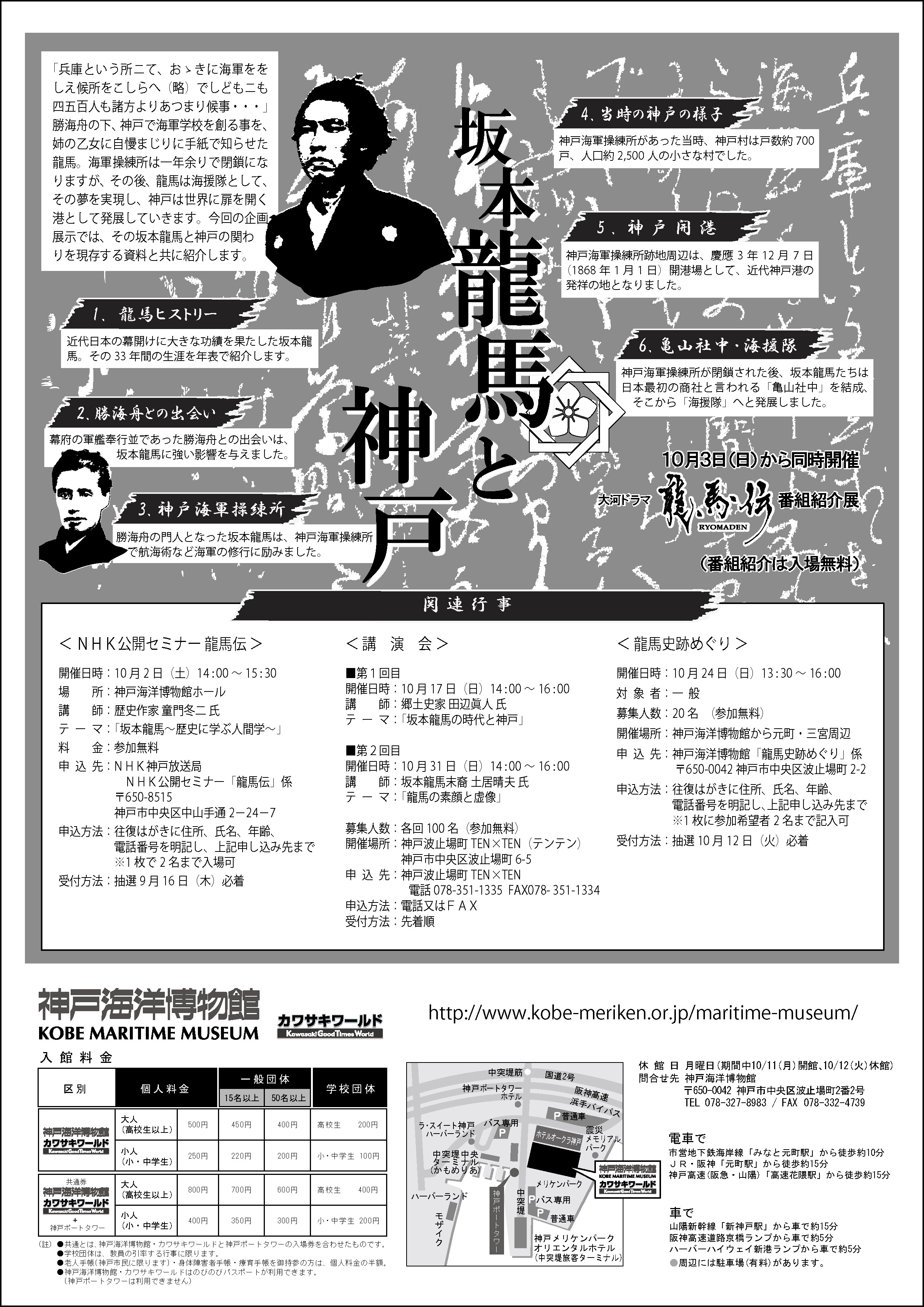 神戸海洋博物館において、平成22年10月2日(土)から同年11月23日(火)まで開催した海と船の企画展「ミナト神戸の原点を探る~坂本龍馬と神戸~」の広報用チラシ裏面。A4版表4色、裏1色刷り、15,000枚製作。