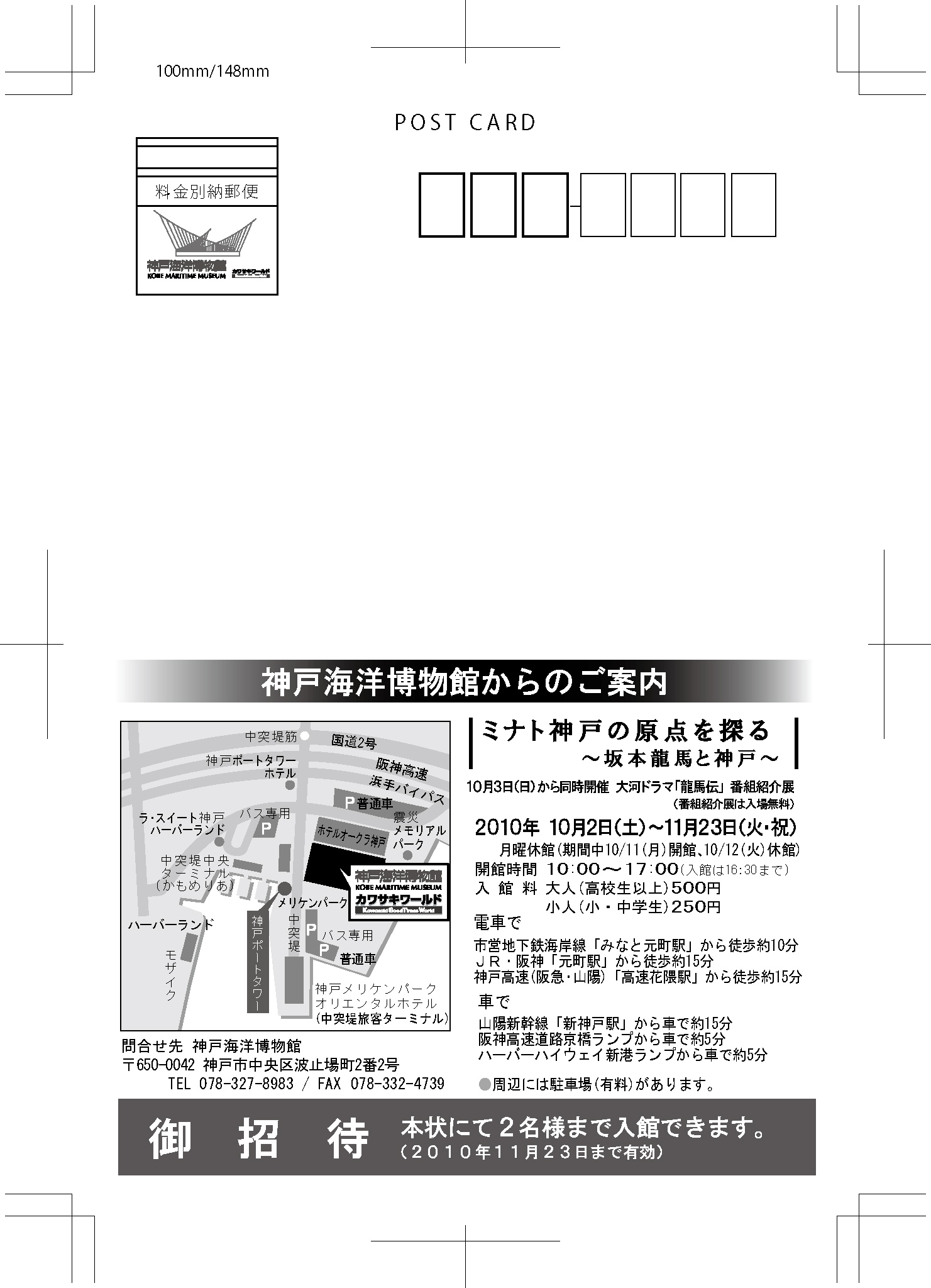 神戸海洋博物館において、平成22年10月2日(土)から同年11月23日(火)まで開催した海と船の企画展「ミナト神戸の原点を探る~坂本龍馬と神戸~」の広報用ハガキ裏面。ハガキサイズ、表4色、裏1色刷り、6,500枚製作。