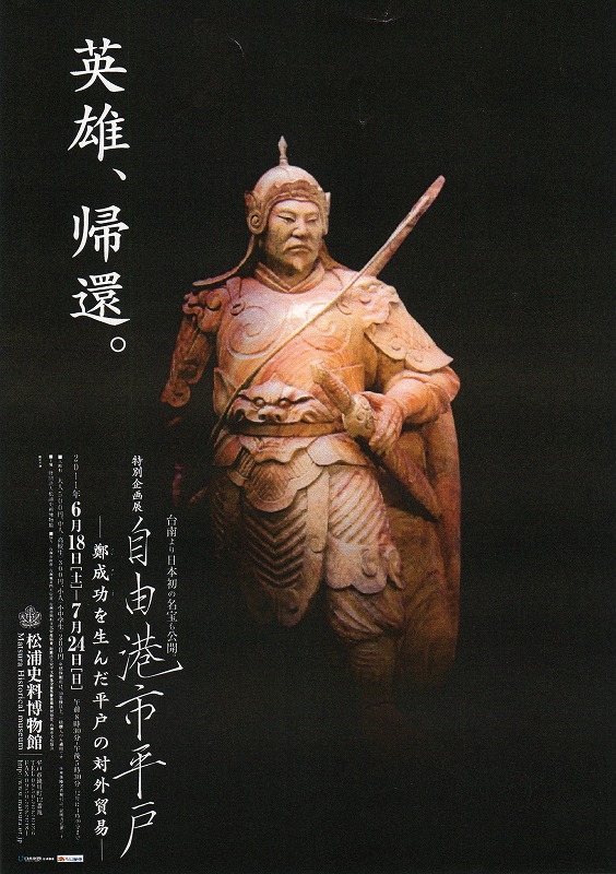 チラシ・ポスター 2011年6月18日(土)~7月24日(日) 台南市立鄭成功文物館をはじめ、台湾内に残る鄭成功関係資料、 平戸市内および当館所蔵の歴史・工芸品を展示し、平戸の対外貿易 の歴史を紹介。 |