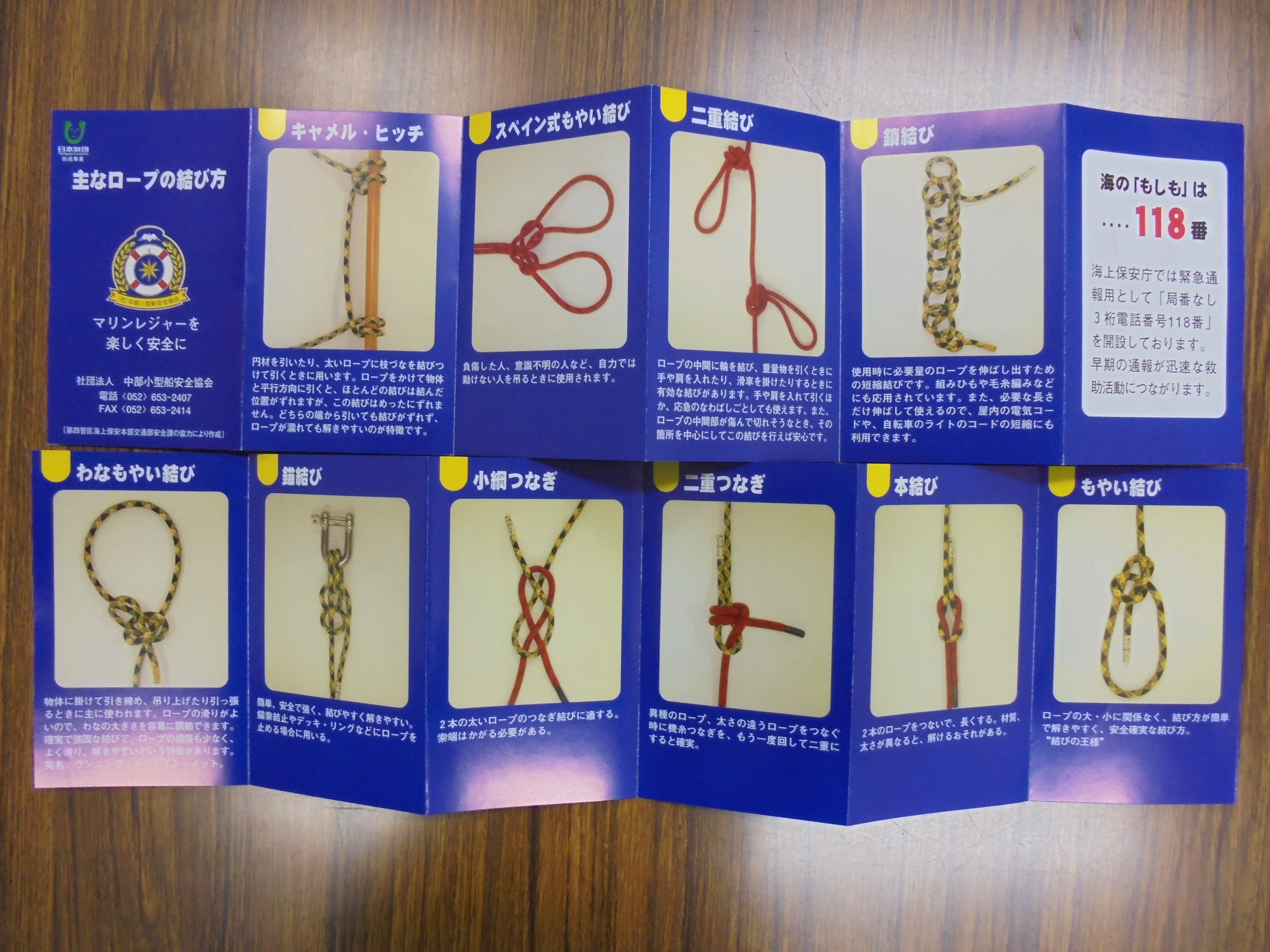 ①開催地区 鳥羽地区(伊勢市大湊.8月8日実施) 実施内容 乗船他体験と講話(海洋安全教室、ヨット体験・講義、海上交通ルール海難防止の講話、ロープワーク、ライフ ジャケット着用実体験見学、手旗信号実演) ②開催地区 名古屋地区(常滑市.8月23日実施) 実施内容 マリーナりんくう~中部国際空港セントレア周辺海域(海洋安全教室 ボート体験乗船、小型船舶 に乗船する際の注意事項・安全知識と準備についての講話、救命胴衣着脱訓練、リーフレットを使用しての ロープワーク体験) ③リーフレット作成 ・「主なロープの結び方」作成部数=300部 ・「観天望気」作成部数=250部 海洋安全教室参加者等に配布した。 |