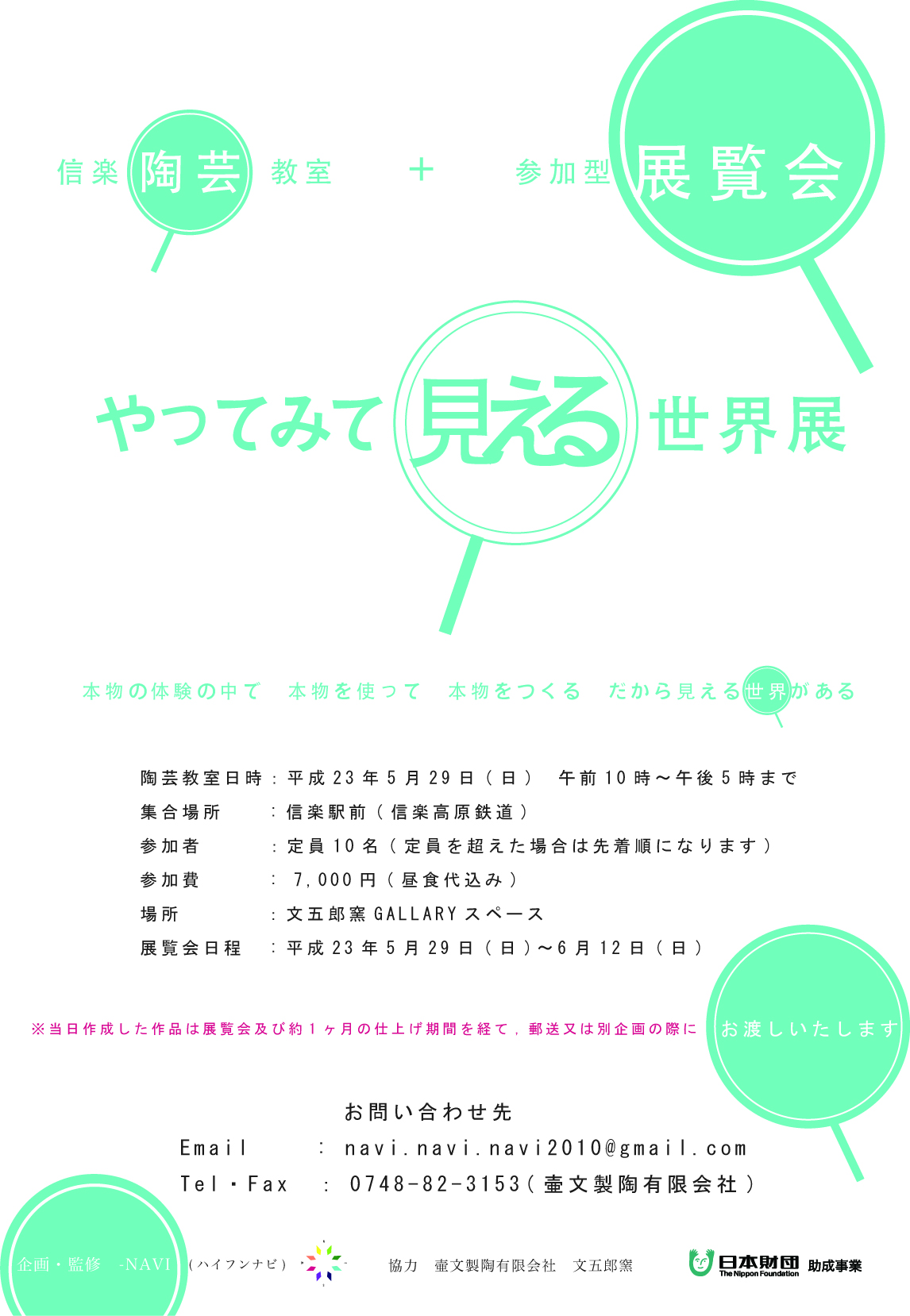 信楽陶芸教室+参加型展覧会「やってみて見える世界展」ポスターです。信楽観光協会などに掲示していただきました。
