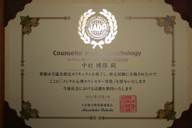 このたび、当NPO法人の中村 博保理事長が、JADP(一般財団法人・日本能力開発推進協会)認定試験「メンタル心理カウンセラー」に合格しました。