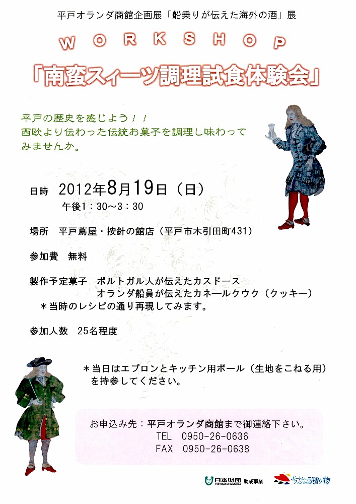 期間 2012年7月21日(土)― 9月2日(日) 酒、茶、コーヒー、たばこは、世界の四大嗜好品として、長い歴史のなかで多くの人びとに楽しまれ、豊かな文化を育んできました。その多くが平戸の対外貿易時代に諸外国より平戸を通して日本に広まりました。ポルトガル人は宗教の道具としてワインを伝え、オランダ・イギリス人たちはビールを平戸で製造し、また西欧の蒸留酒なども平戸に伝えました。この日本に伝わった酒の存在は大航海時代貿易船を出すにあたって重要なアイテムの一つで、船員の募集、航海中の疲労回復や忠誠度を高めるための手段として、また航海中の飲料水代わりともされていました。そこで船乗りたちが愛した酒をテーマに、海事文化との関わりを検証すると共に、日本における洋酒の歴史を紹介しました。 ワークショップ「南蛮スイーツ調理試食体験会」 2012年8月19日(日)13:30~15:30 大航海時代に西欧より酒とともに伝わった伝統のお菓子を調理試食体験。ポルトガル人が伝えたカスドース、オランダ船員が伝えたカネールクゥクを当時のレシピの通りに再現。 |