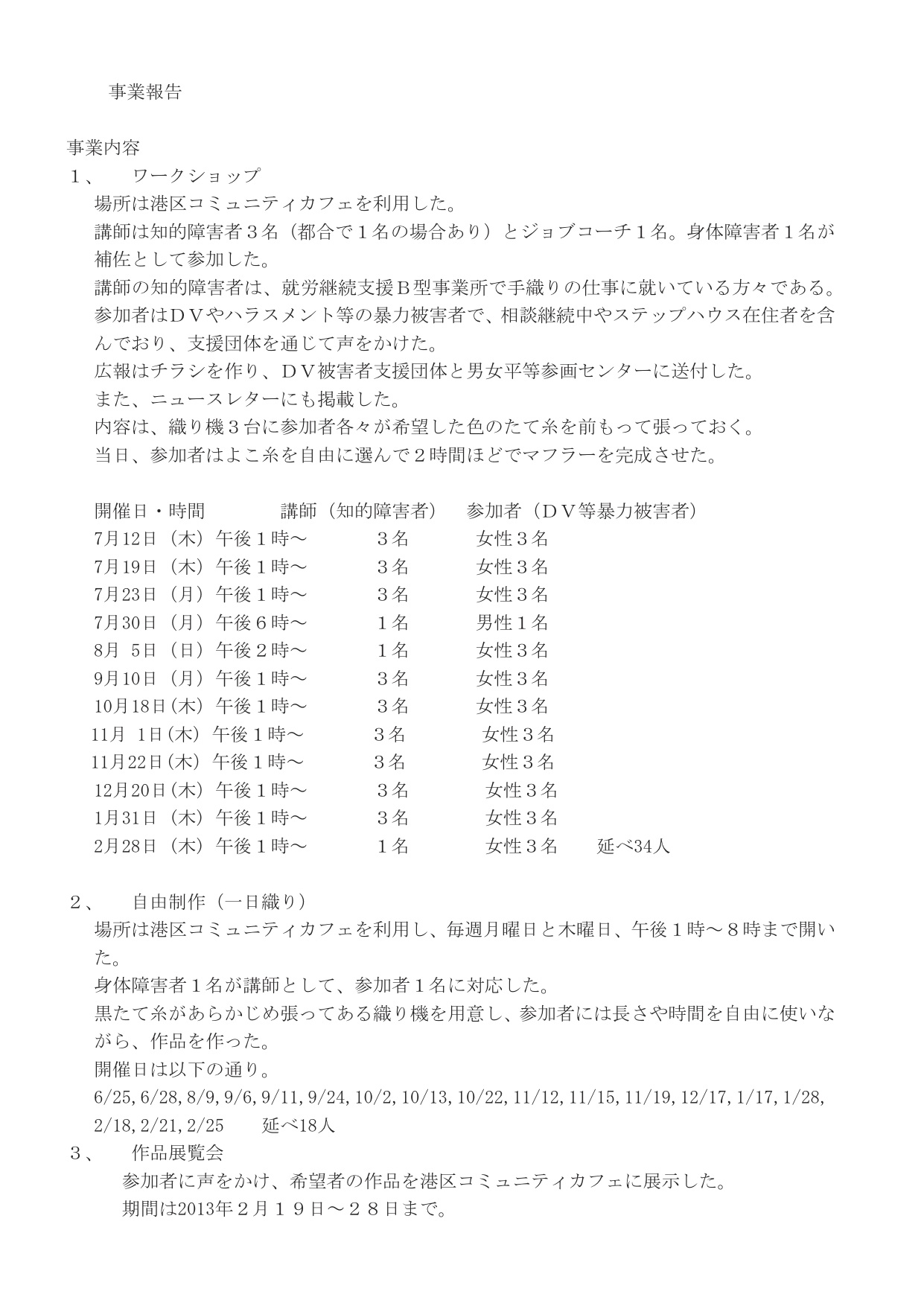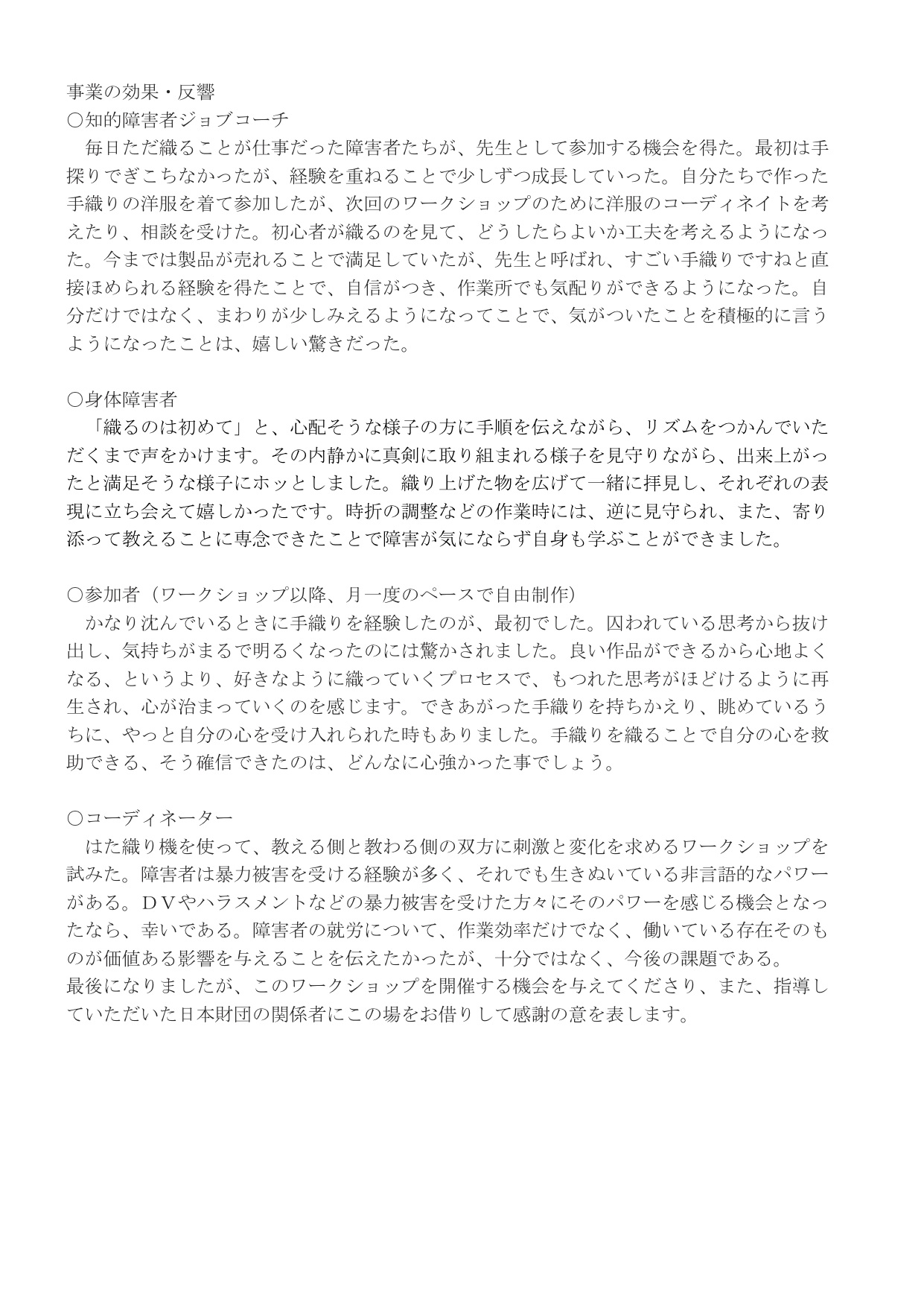 ○事業内容 1、 ワークショップ 2、 自由制作(一日織り) 3、 作品展覧会 ○事業の効果・反響 |