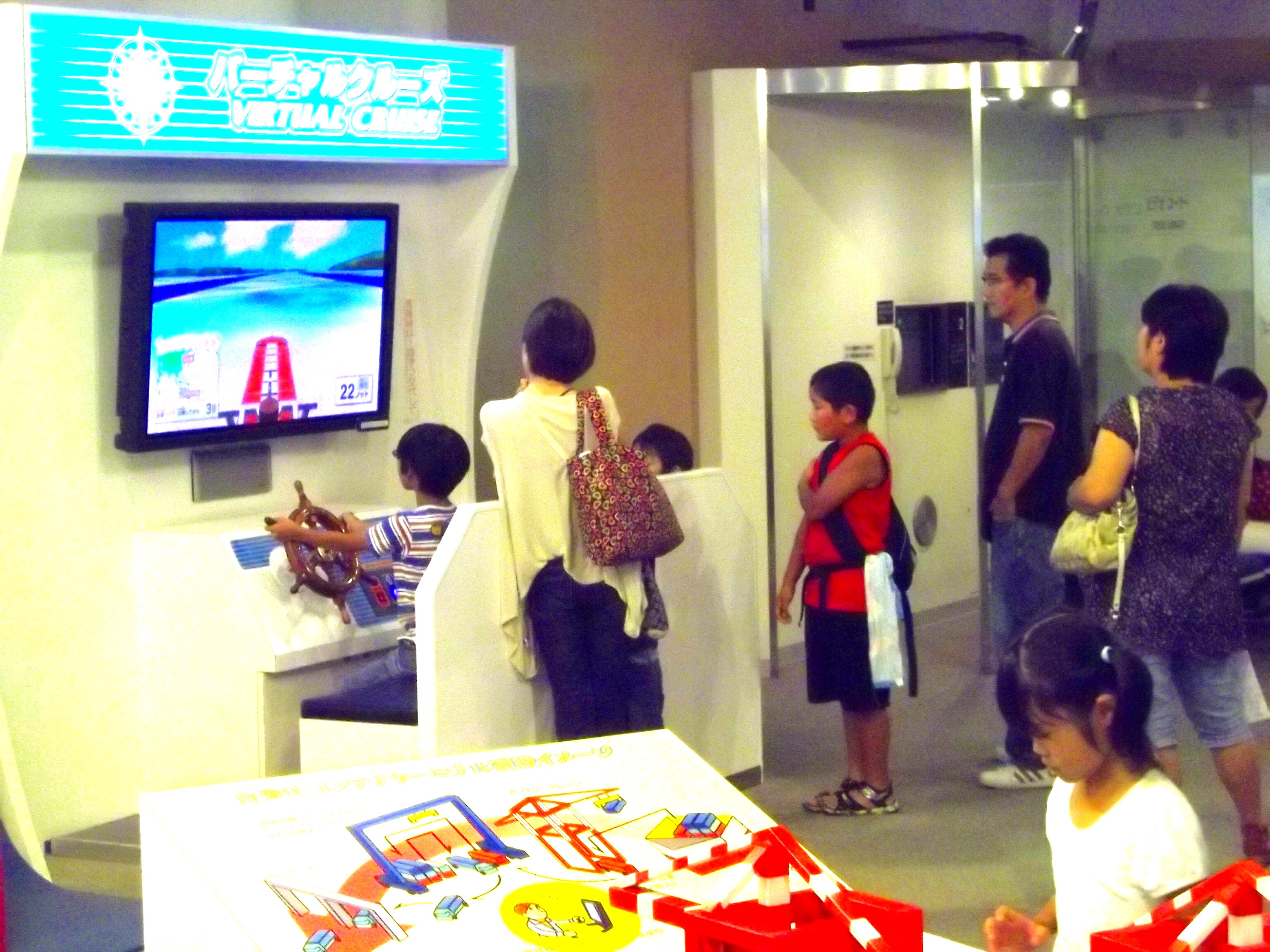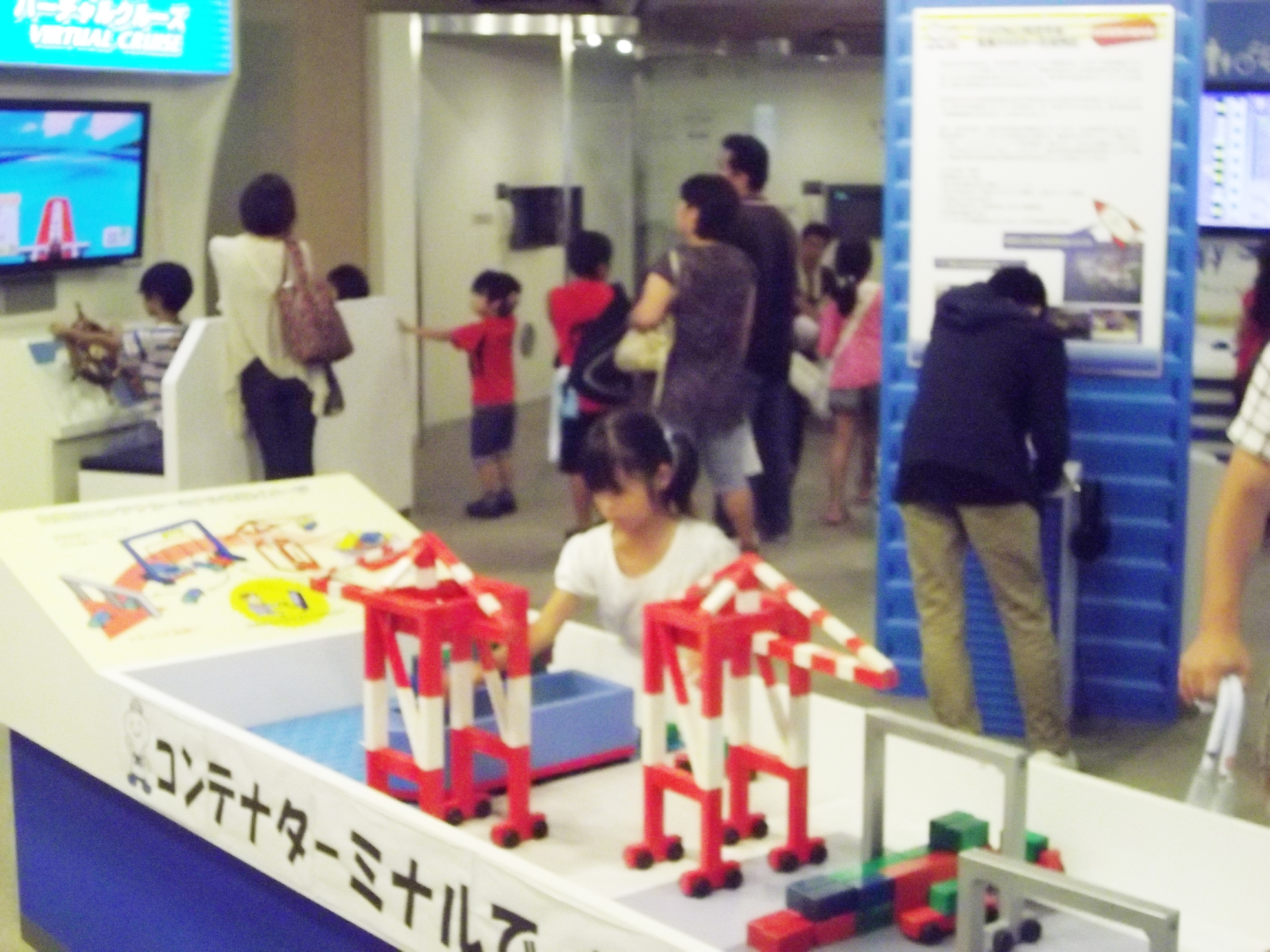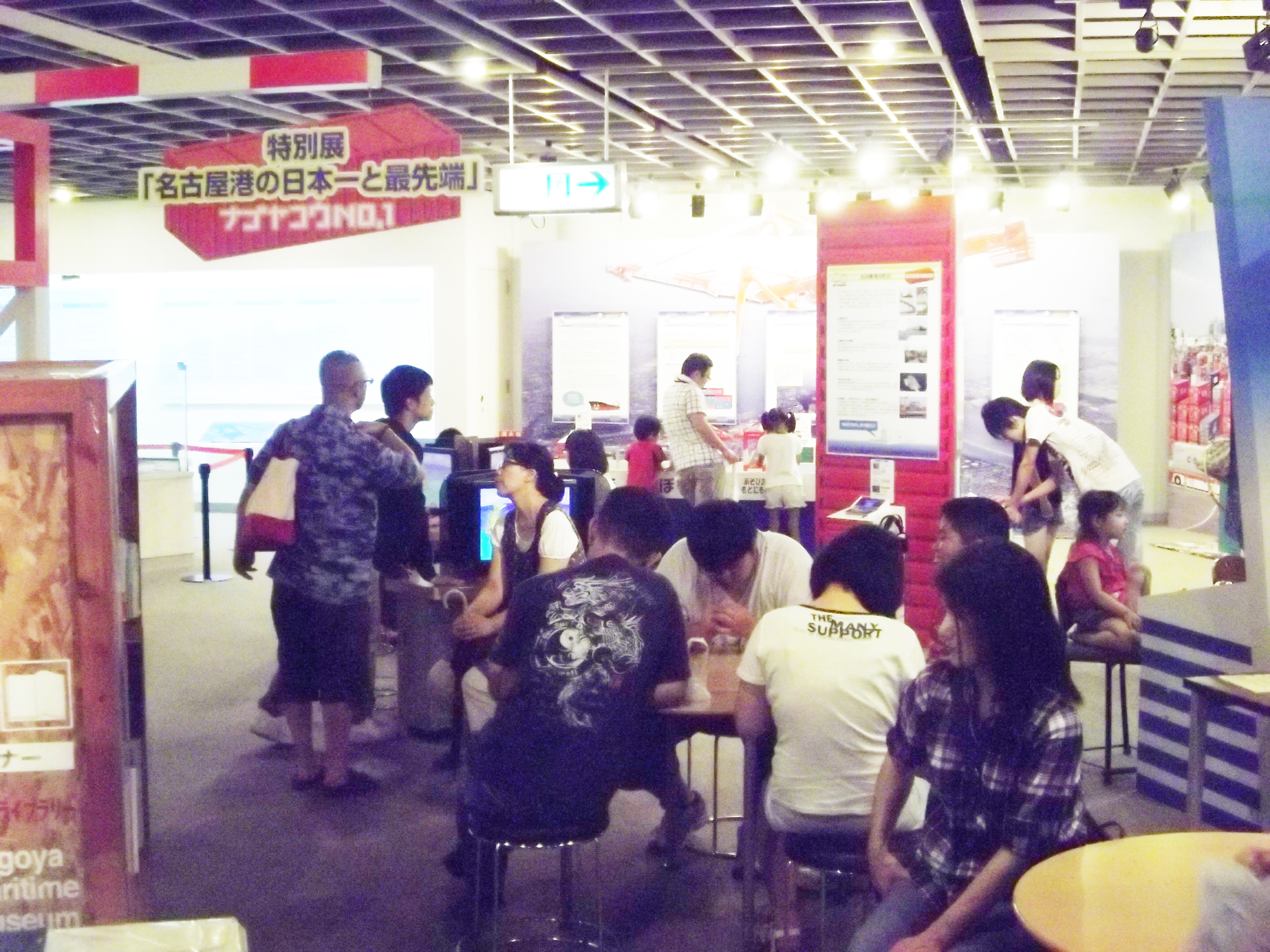 展示構成は、名古屋港の現状について、①概要、②取扱貨物量・貿易額、③陸域面積、④輸入品・輸出品、⑤貿易相手国、⑥飛島ふ頭南側コンテナターミナル、⑦鍋田ふ頭第3バース、⑧アジアNo.1航空宇宙産業クラスター形成特区、⑨国際バルク戦略港、⑩防災の最先端、⑪名古屋港の年表、⑫姉妹港の紹介、⑬名古屋港と取引のある国を紹介し、また海運業界の現状として、①海洋基本法、②日本海運の現状、③船員について、④海賊問題について紹介をしました。 展示の中でも特筆すべきことは、遠隔操作により自働運転されている飛島南側ふ頭コンテナターミナルの様子を積み木で再現し、手で触れることでコンテナが運ばれていく仕組みを理解する展示です。直接のターゲットは子供ですが、コンテナがどのように運ばれていくか、親が説明しながら一緒に遊んでいる姿がよく見かけられました。また解説パネルの内容を再確認してもらえるよう、ニンテンドーDSを利用した音声ガイドシステムを導入し、クイズ形式のコンテンツを作成、会場に10台配置しました。ニンテンドーDSは、一般家庭にゲーム機として普及していることもあり、大人から子供まで幅広く利用されていました。 また、この特別展と並行して、会場に設置されている「バーチャルクルーズ」の内容更新を実施しました。バーチャルクルーズは、既存展示物ですが、平成13年に制作したもので、内容はクルーズ客船を紹介するものでしたが、この特別展を期に既存のシステムを活かしたまま、内容を名古屋港に入出港する貨物船を操作するゲームへと変更しました。さらに、来館者には毎日先着100名に博物館オリジナルシャープペンシルのプレゼントを実施しました。 その結果、期間中の入場者数は22,725人であり、目標の20,000人を大きく上回り、多くの方に名古屋港や海運について興味関心を持っていただくことができました。 |