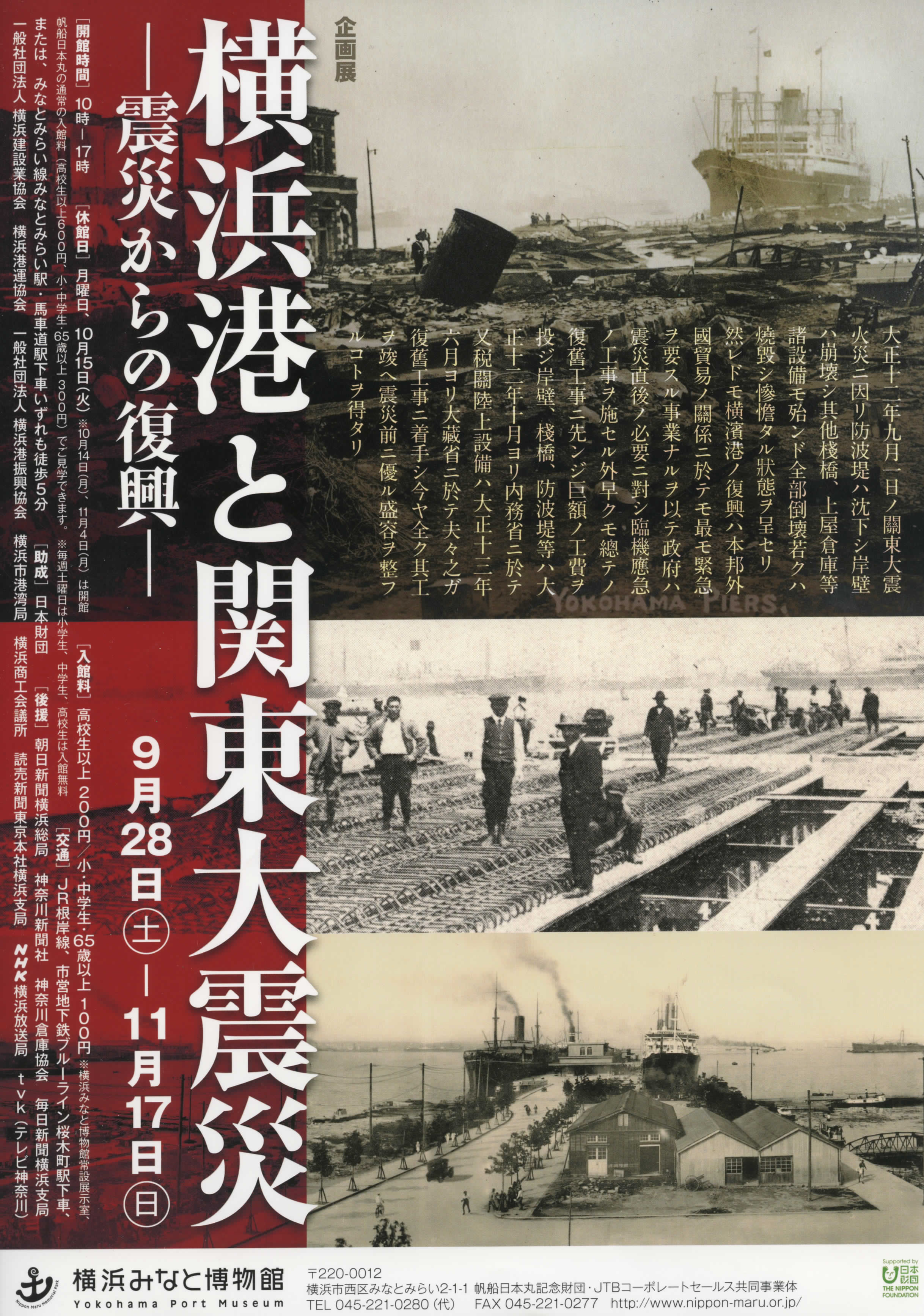 相模湾沖を震源としたM7.9の大地震は、京浜地方を中心とした広い範囲に非常に大きな被害をもたらしました。当時、横浜港は国の直轄港として日本の貿易の中心地となっていました。明治中期からの築港工事を経て東洋一の近代的な設備を誇った横浜港でしたが、震災により、桟橋や岸壁をはじめとした港湾設備はほとんどが灰燼に帰し、貿易の再開が危ぶまれるほどの壊滅状態となりました。しかし、地震発生直後から、横浜港は焼け出され港に避難してきた市民を救助する場となり、地方へ避難していく人々を送り出す場所となりました。また一方では、壊滅した港湾設備の復旧・復興が急がれました。横浜港は日本経済の行く末を左右する重要な港であったため、震災から50日後には復旧工事が開始されました。 震災後、これまで横浜港の独占状態であった生糸貿易が神戸港に移り、外国貿易額も神戸港に抜かれます。震災が横浜港の貿易を大きく停滞させました。しかし横浜市、横浜の経済人、港湾関係者を中心とした復興に向けた活発な動きは、「横浜市復興会」の発足など様々な形で着実に横浜の復興への道筋をつけていきました。開港以来、商業港としての性格が強かった横浜港では、横浜市の描く復興計画「大横浜計画」の下、現在の京浜工業地帯の中心となる市営埋立地が造成され、多くの工場が立ち並びました。震災以降、横浜港は原料を輸入し製品を輸出する工業港の性格を持ち、発展していきます。 関東大震災は開港から150年余りの歴史の中でも特に、横浜港に大きな変化をもたらす契機となりました。 本展覧会では、関東大震災という未曾有の災害から横浜港がどのように復興を遂げ、その性格を変えていったのか、震災発生直後からの港の動きを追うことで考えます。 図録目次 0震災前の横浜港 1関東大震災発生 2横浜港崩壊 3復旧から復興へ 4変貌する横浜港 5現在の横浜港と震災 |