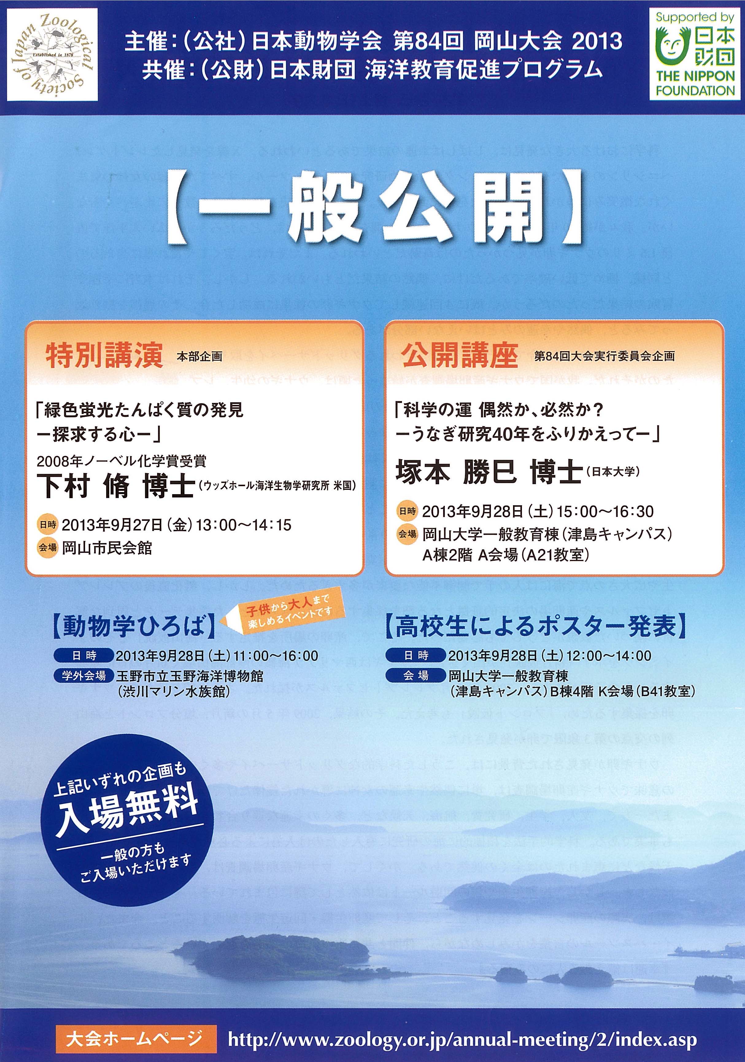 岡山県岡山市で2013年度に開催した海洋教育関連シンポジウム(ノーベル化学賞受賞者の下村脩博士・ウナギの生態学研究の世界的権威である塚本正巳博士による講演会)やイベントのチラシ。