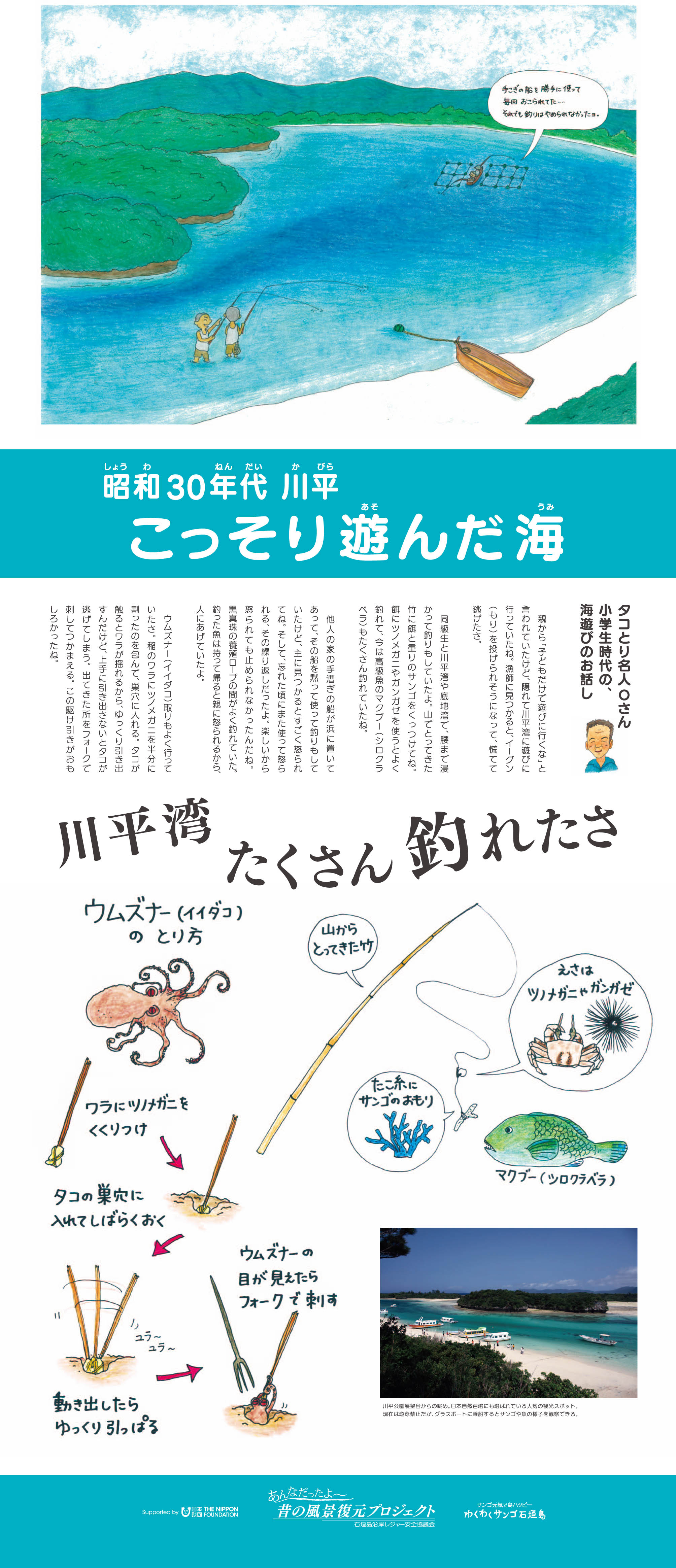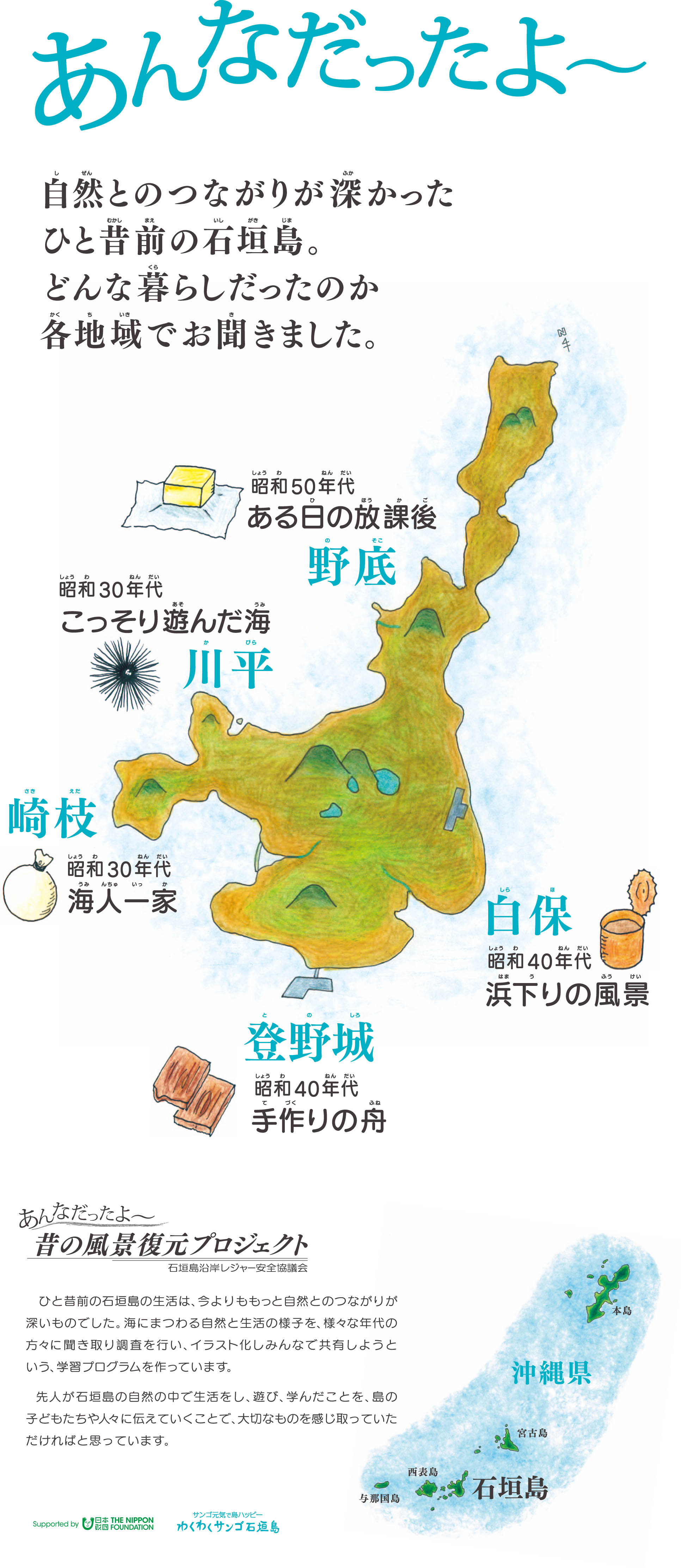 サンゴ礁に関する昔の思い出について聞き取り調査を行い、思い出の中の昔の風景をイラストとして制作。