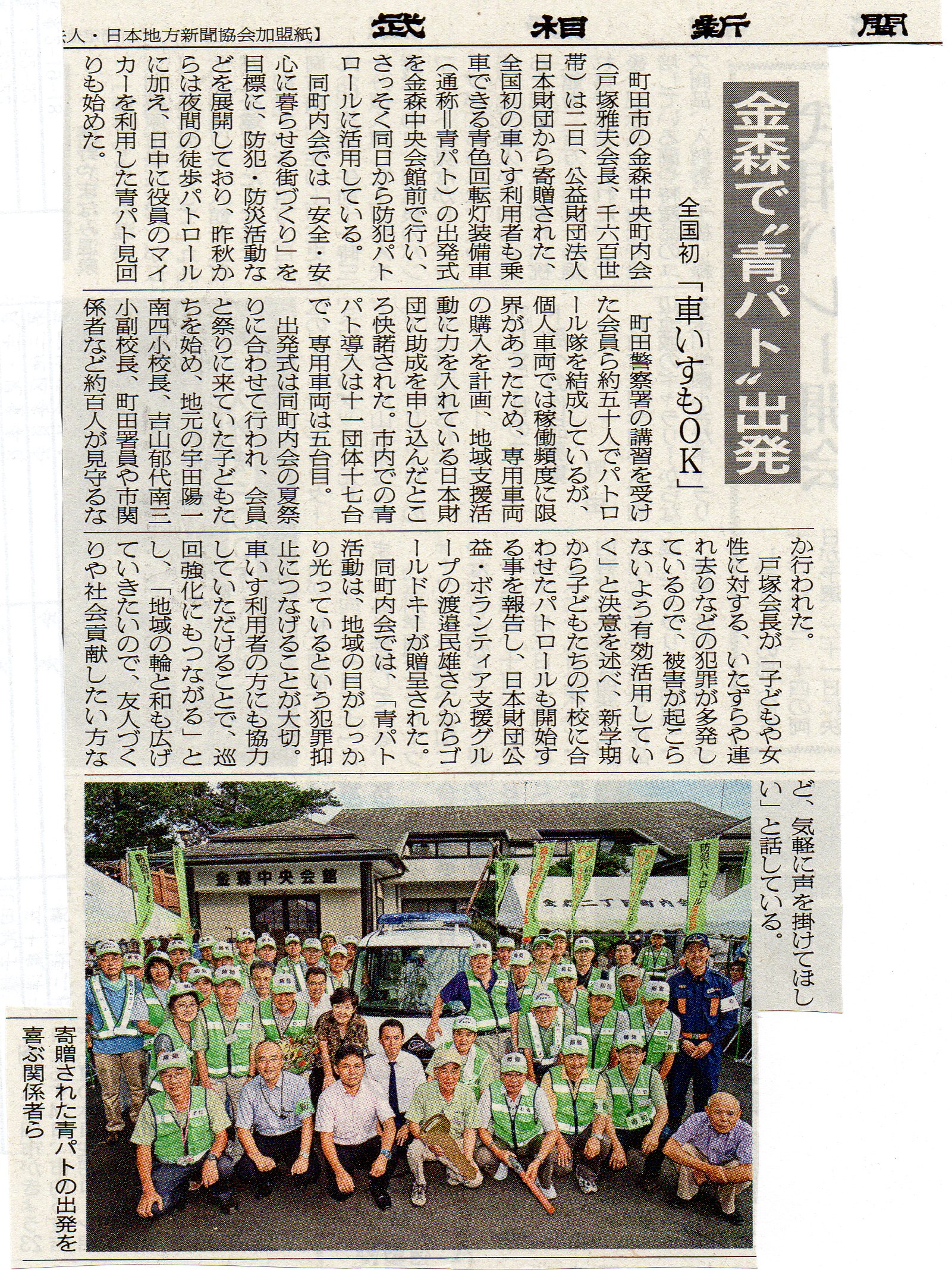 「青パト」で車椅子付きは、日本初だとのことです。 (成果物は、「青パト」稼働の町内会広報版と地元紙の記事です) 当初の計画原案では、日本財団からの貴重な助成金で購入する「青パト」、 毎日1hrパトロール稼働させても、年間総稼働率は3 %程度と低稼働で、余りにも勿体ない・・・との発想で、 空き時間を町内会員が通院や買い物に車が必要な時、車椅子付きレンタカーとして貸し出そう、と云うアイデアで企画したもの。(1回3hr燃料費込み500円で町内会員のみ利用可能と云う設定) レンタカー貸し出し約款や会員規約、諸法規上の課題はクリアしたものの、 実施直前に、所轄の警察署より、警察仕様と同じ「青パト」塗装・装備の車輌の場合は、「青パト」巡回以外の目的には運行しない事、との指導が有り、レンタカーとしての運用は取り止め、 車椅子付き「青パト」として、障害者もパトロール隊員として「青パト」に乗車して貰う事に落着したものです。 今後高齢化進展で、低稼働率のマイカーを手放す人が急増していく中、手軽な500円レンタカーの必要性は、 増すばかりと確信しているので、「青パト」とは別の形で実現したいと、ニッポン初の夢企画を諦めずにplanning中です。 (1,600町内会員のマイカー1,000台の内の約100台くらいの低稼働マイカーを、通院や買い物等でちょっと 車を借りたい人が、ガソリン代+アルファの3hr500円で気軽に借りられる・・・、 町内会員限定のカーシェアリングplan) |