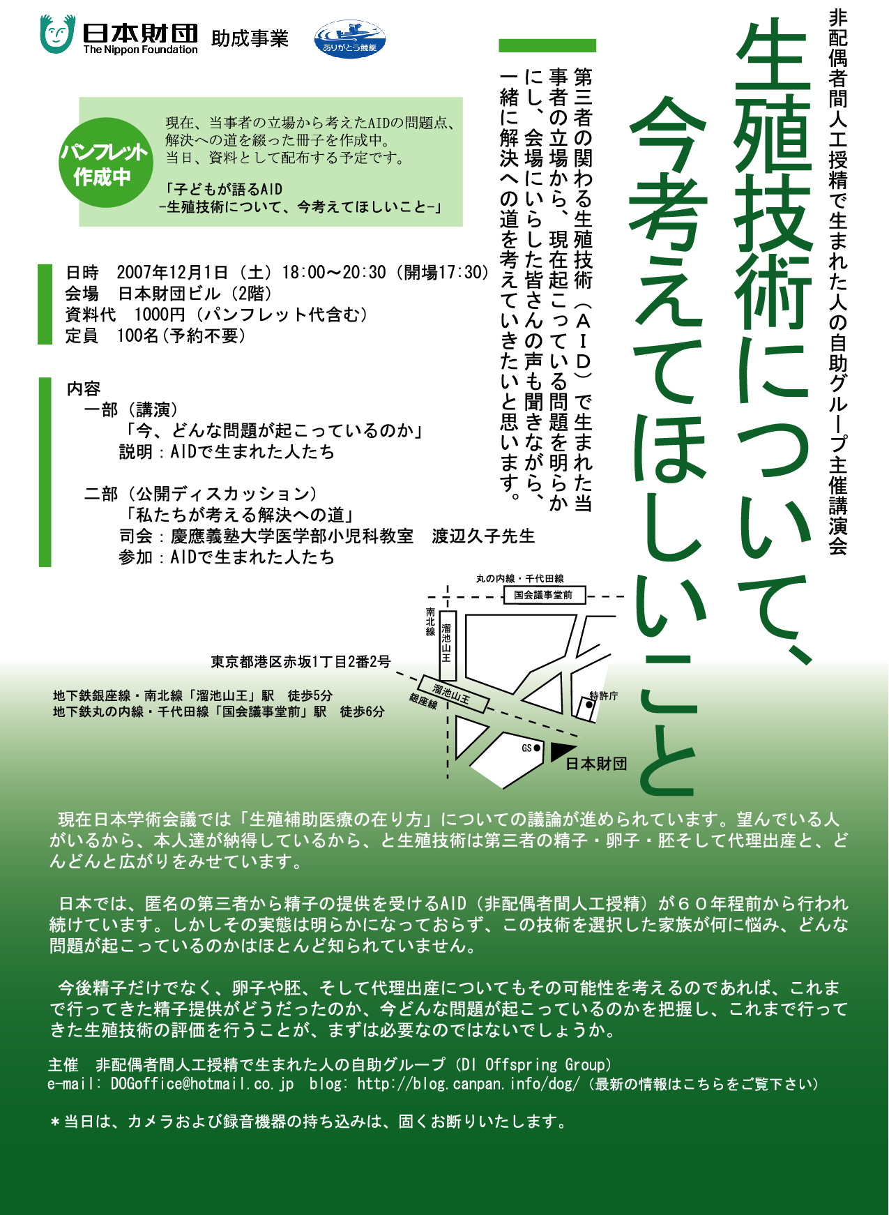 非配偶者間人工授精で生まれた人の自助グループ主催講演会 「生殖技術について、今考えてほしいこと」 日時 2007年12月1日(土) 18:00~20:30 会場 日本財団ビル(2階) 内容 一部(講演) 「今、どんな問題が起こっているのか」 二部(公開ディスカッション) 「私たちが考える解決への道」 |