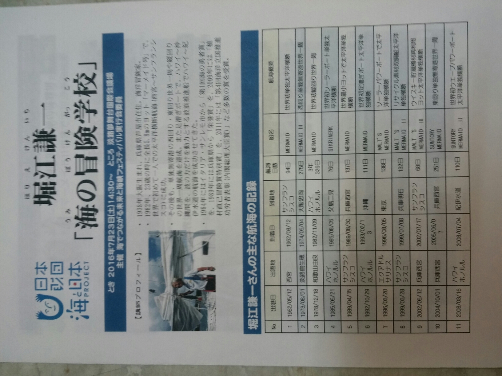 ① 海のお話し会 日 時:平成28年7月9日(土) 13:30~ 場 所:淡路市立アソンブレホール 内 容:神戸大学の川井教授を講師としてお招きし瀬戸内海の生態系、海の環境問題、人間生活と海と の共存、失われた自然の回復などを学びました。 参加人数:約80名 ② 地引網体験 日 時:平成28年7月9日(土) 15:00~ 場 所:淡路市岩屋 田ノ代海岸 内 容:漁業組合協力のもと、地引網の体験を行い、地で獲れる魚介類に直接触れ、それらを持ち帰っ てもらいました。 参加人数:約80名 2.「堀江謙一 海の冒険学校」 ① 堀江謙一講演会 実施日 平成28年7月23日(土) 実施場所 兵庫県淡路市 淡路夢舞台国際会議場/明石海峡 参加者数 明石市と淡路市の小学4~6年生の児童と保護者及び新聞報道で知り参加した一般参加者の 約100名 内 容 日本を代表する海洋冒険家である堀江謙一氏が、世界初となった1962年の太平洋単独横断 「太平洋ひとりぼっち」の航海体験を中心とした内容の講演を行った。 ② 明石海峡クルーズ 明石市・神戸市等の参加者は、明石港から会場の最寄港である淡路交流の翼港まで の往復を、また淡路市の参加者は同港から明石港までの往復を、㈱淡路ジェノバラインの旅 客船「まりーんふらわあ2」に乗船し明石海峡クルーズを体験した。堀江謙一氏も同乗し記 念撮影等に応じた。 参加者数 小学生の参加者32名、その保護者35名、一般参加者36名の計103名 事業効果 堀江謙一氏の体験を子ども達に聞かせたいという意欲の保護者が子供連れで参加した他、 「太平洋ひとりぼっち」を同時代に過ごした高齢世代の参加が多かった。堀江謙一氏の講演 を通して海の素晴らしさを普及する目的は達成された。 3.「海の食とビーチアクティビティ」 日 時:平成28年8月7日(日) 10:00~ 場 所:明石市 大蔵海岸 ①魚のつかみ取り体験 ②魚のさばき方教室とバーベキュー ③ビーチサッカークリニック 事業効果 普段体験することができない魅力的な事業内容が功を奏し、小学生約160名と保護者約140名、計300名もの参加者により事業を実施することができた。 また、魚のつかみ取り体験やビーチサッカークリニックなどを通して、海や魚、砂浜などに触れてもらったことで、海岸環境への興味や好奇心が高まり、さらには環境美化意識の向上に大きくつながった。特に、自分でつかみ取りした魚を自分でさばき、食したことで、海や魚をより身近に感じ海洋資源の大切さを学んでもらうことができた。 【海や魚への関心・好奇心の向上】 多くのこども達は、生きている魚を触ったことがなかったため、魚をつかまえることを怖がっていた。しかし、つかみ取り体験を通して、魚をつかまえては逃げられることを繰り返しているうちに、最後には臆することなく笑顔で魚をつかめるようになった。結果、海や魚へのさらなる関心や好奇心の向上につながった。 【ビーチアクティビティスポーツの振興】 靴を履いて公園でするサッカーとは違い、裸足になって砂浜でするビーチサッカーの楽しさを知ってもらったことで、砂浜や海岸で行うスポーツに対し興味や関心を抱いてもらうとともに、海岸環境の大切さに気づいてもらうことができた。 |