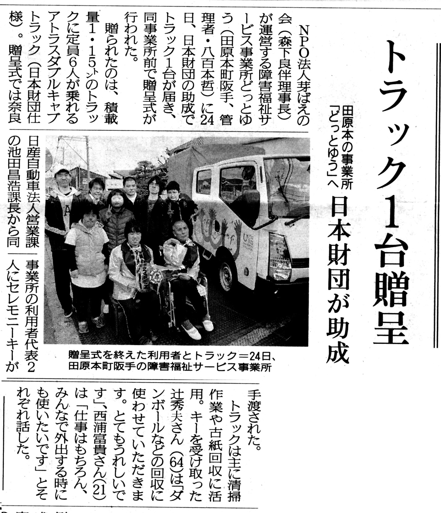 利用者の皆さんにも人気があって、みんなが積極的に参加したいと言ってくださいます。しかし、ダブルキャブトラックが来るまでは、軽バンで実施をしていましたので、一度に積める量も、作業に参加できる人数も限られていました。ダブルキャブトラックを助成いただいてからは、量も参加人数も対応が可能となり、利用者さんのやる気もアップしたように思います。もちろん送迎にも活躍をしてくれています。送迎時に家族の方が回収に協力くださることも多くありますので、その際にはそのまま積んでくることが可能になりました。清掃作業の効率も上がり、安定した受注もいただけるようになりました。この収益で利用者の工賃の向上にさらに取り組んでいきたいと思います。 |