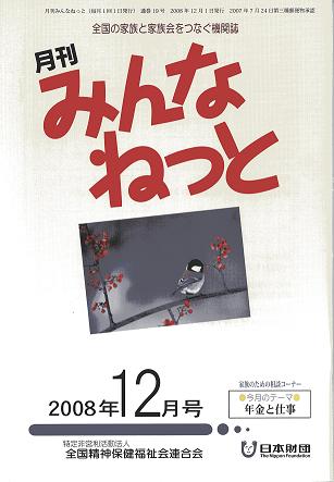 知っておきたい精神保健福祉のうごき ■急ピッチで進められている自立支援法見直し審議 -社会保障審議会障害者部会- ■相談支援について集中的に論議 -今後の精神保健医療福祉のあり方等に関する検討会 ■障がい者権利条約と障害者自立支援法の関係とは? ■学生無年金訴訟 「『初診日』問題のこれから」 お知らせしますみんなねっとのうごき ■盛況のうちに終了-みんなねっと東京大会開催- 家族のための相談コーナー テーマ 「年金と仕事」 Q&A 「障害年金をもらいながら安心して働きたい」 /良田かおり 「年金診断書に日常生活や就労での 『障害』を反映させるために」/池末美穂子 お元気ですか 家族会 「やすらぎの会」(新座市精神障害者家族会)(埼玉県) 街の診療所からのお便り 連載⑳/増本茂樹 「・・・・疲れを取るには『食う・寝る・休む』・・・・」 基礎から学ぶ統合失調症 【講座9】 「薬を変えたとき、家族が注意すること-減薬・薬を止めたとき-」/當間実名雄 わかりやすい制度のはなし その17 「就労移行支援と就労継続支援って?-その違いと特徴-」/松村浩平 みんなねっとのわ 読者の皆さまからの投稿 ・「みんなねっと」への感想 ・日常生活のこと ・イラスト、詩 など お知らせ&ご案内コーナー ・就労セミナーのお知らせ ・NHKハート・フォーラム「統合失調症を知る~症状・治療・回復~」の開催 ・精神保健福祉フォーラム「精神障害を抱える人たちのくらしを考える ~今までの5年、これからの5年~」の開催 ・医学書院スキルアップセミナー「精神科医療者に求められる『薬による身体副作用』の知識」 |
