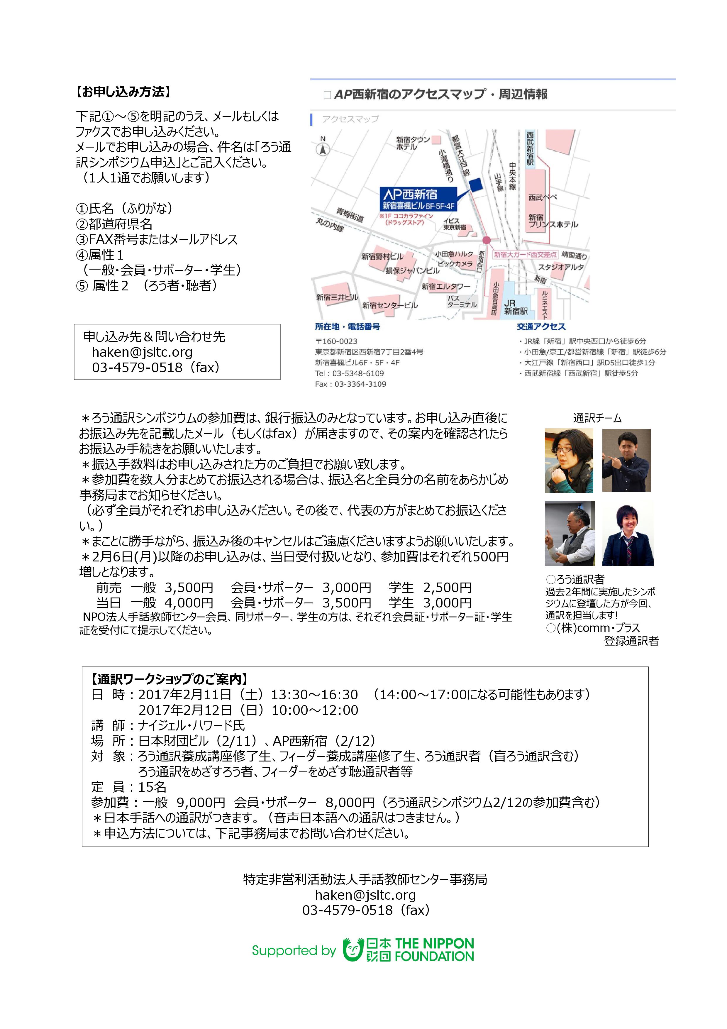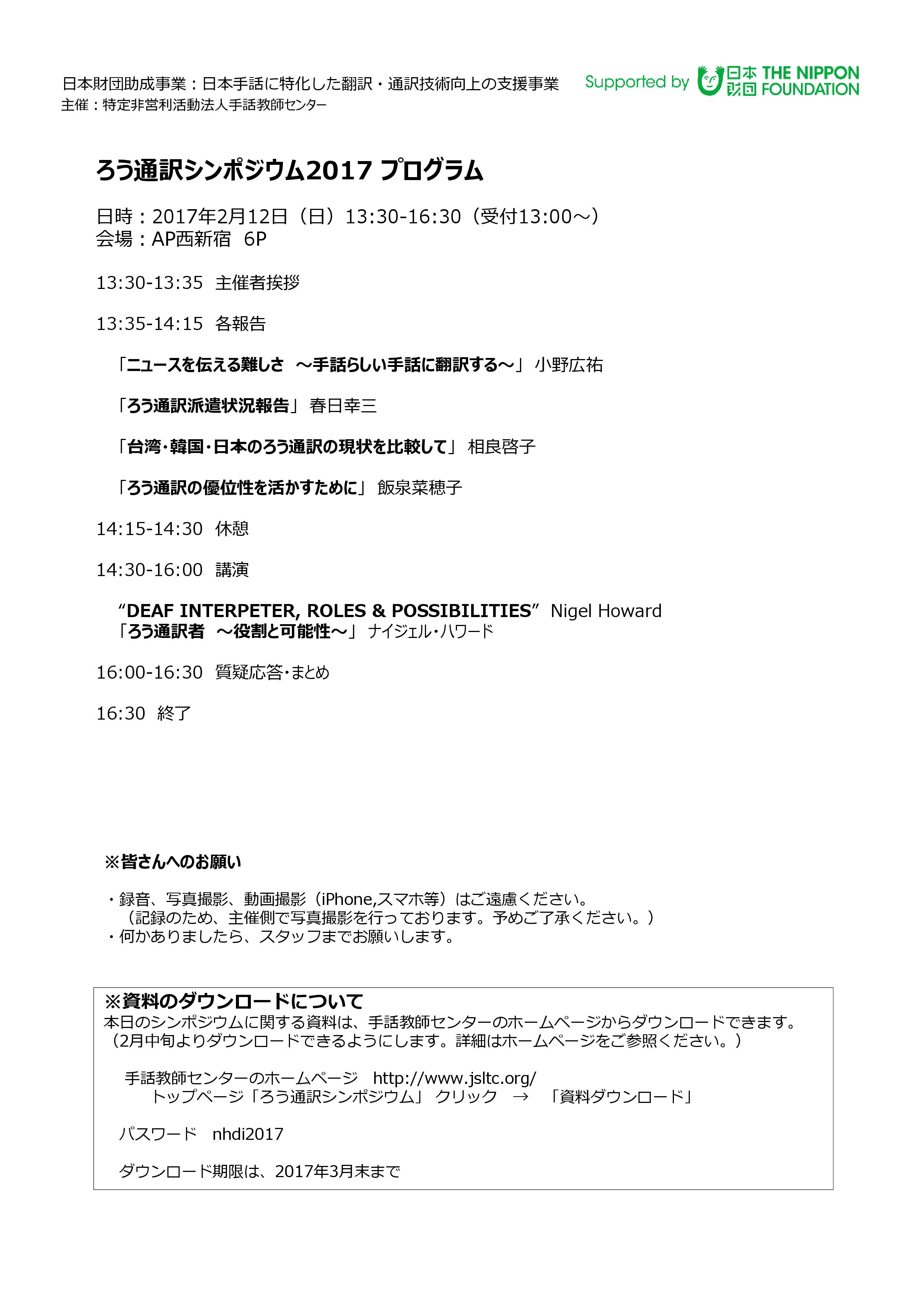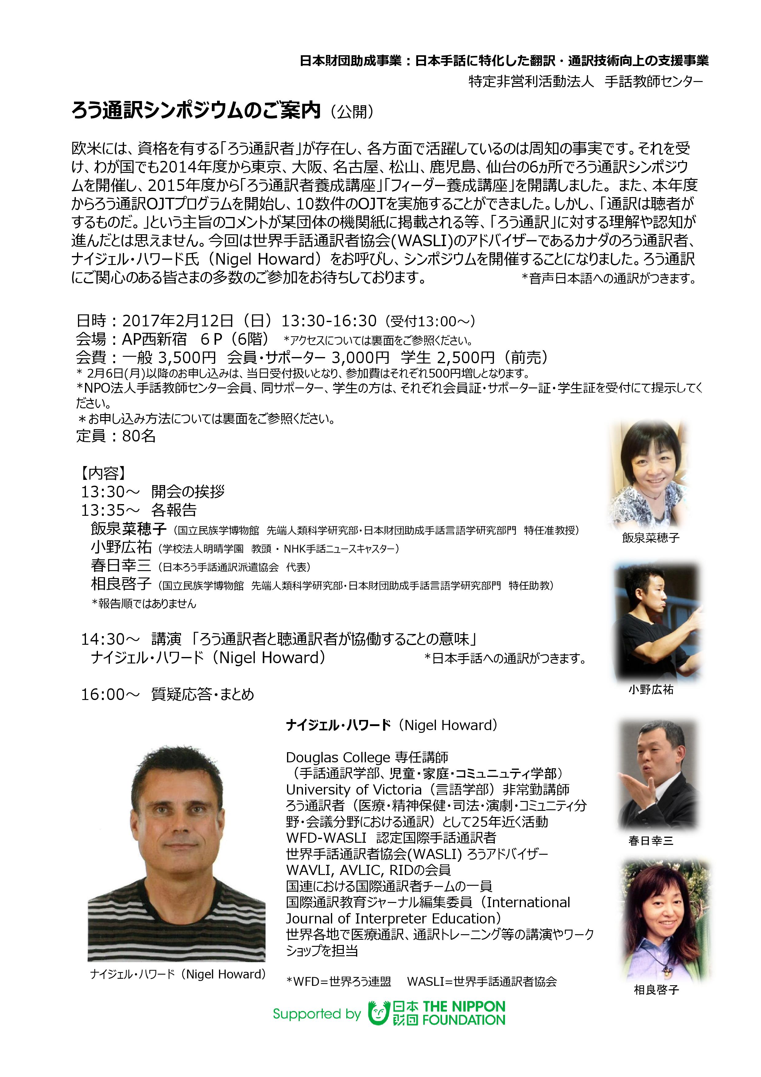(2)場 所:AP西新宿 6P (3)参加者:ろう者・聴者等ろう通訳に関心のある人 77名 (4)内 容:WFD(世界ろう者連盟)及びWASLI(世界手話通訳者協会)の認定通訳者で、国際通訳教育ジャーナル(International Journal of Interpreter Education)の編集委員をしているカナダのナイジェル・ハワード氏による講演のほか、飯泉菜穂子氏(国立民族学博物館)、小野広祐氏(明晴学園)、春日幸三氏(日本ろう通訳派遣協会)、相良啓子氏(国立民族学博物館)による各報告を行なった。 |