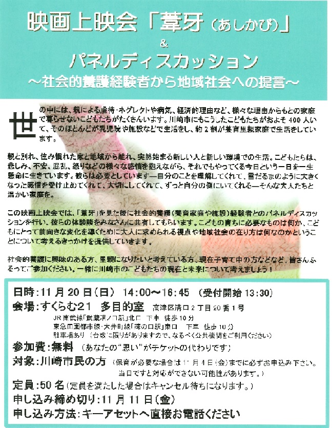 川崎市にお住まいの方に向けて広く養育里親を周知し、社会的養護について考えるきっかけとなるようなイベントとして、映画上映会・パネルディスカッションを開催しました。