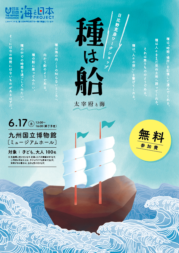 当法人WEBサイト、Facebookで公開 また、YouTubeや日本財団のウェブサイトでも公開されました。 朝顔の種をよく見てみる。 スケッチブックにスケッチしてみる。 遣唐使が運んだものをよく見てみる。(九州国立博物館交流展示室 体験と見学) スケッチブックに気づいたことをメモしておく。 日比野さんといっしょに種の気持ちを考えてみよう! スケッチブックは研究ノートとして作成。 日比野さんのリードで、色とりどりのプラスチック段ボールを使用して、朝顔の種を載せる船型のプランターを各自作成。 植木鉢に土と全国から集まった明後日朝顔の種を植えて、マストを立て、完成。 太宰府天満宮浮殿の堀に浮かべる。 「種には1年間の記憶が詰まっている。 各地に運ばれていき、またそこで新しい記憶を乗せてくる。種はまるで記憶の乗り物みたい…」 こうした発想から、「種は船プロジェクト」の構想はできあがってきました。 古来より、人類は文化や文物を船に載せて伝えてきました。現代アーティストである日比野克彦氏の「明後日朝顔プロジェクト」では、朝顔の種そのものが船となり、その土地の記憶を載せて移動していきます。朝顔の種で繋がった人々が移動することによって生まれる、地域と地域、人と人、地域と人の交流。種を媒介にして、さまざまな関係性が変容していきます。 今回のワークショップでは、古の時代に海から離れた太宰府が海外とどのようにつながっていたのか、九州国立博物館の交流展示室「遣唐使の時代」も見学します。日比野克彦氏のリードで、朝顔の小さな種に詰まった歴史を感じながらアートの楽しさを体験できる。 「種は船プロジェクト」とは? 日比野克彦氏の監修・デザインのもと、2003年から行われている「明後日朝顔プロジェクト」。そこで育てられ、全国を旅する朝顔の種が「人やモノ、地域をつなぐ船のようだ」という着想から、「種は船プロジェクト」に発展しました。 2010年には、京都・舞鶴から「明後日朝顔プロジェクト」の起点である新潟・莇平まで航海することを目標に造船をスタート。延べ5,000人以上の市民が関わって「TANeFUNe」を完成させ、2012年には日本海沿岸の航海が実現しました。 今もなお、「種は船プロジェクト」は継続中です。16年後に舞鶴へ帰郷することを目指し、「TANeFUNe」の航海は続いていきます。 |