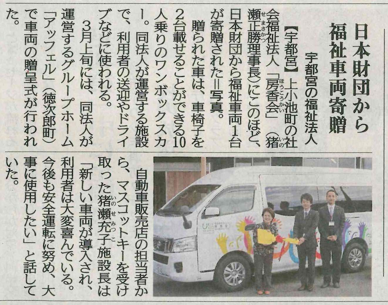 グループホーム(包括型)での活動を主とするので、近隣のお年寄りなどのサポートなどにも、つなげてゆけるよう考えています。 このような問題解決に、車いす対応の最新設備が整った車両を与えて頂きとても感謝の気持ちでいっぱいです。新聞にも取り上げて頂き利用者さんや関係者もとても喜んでいます。 |