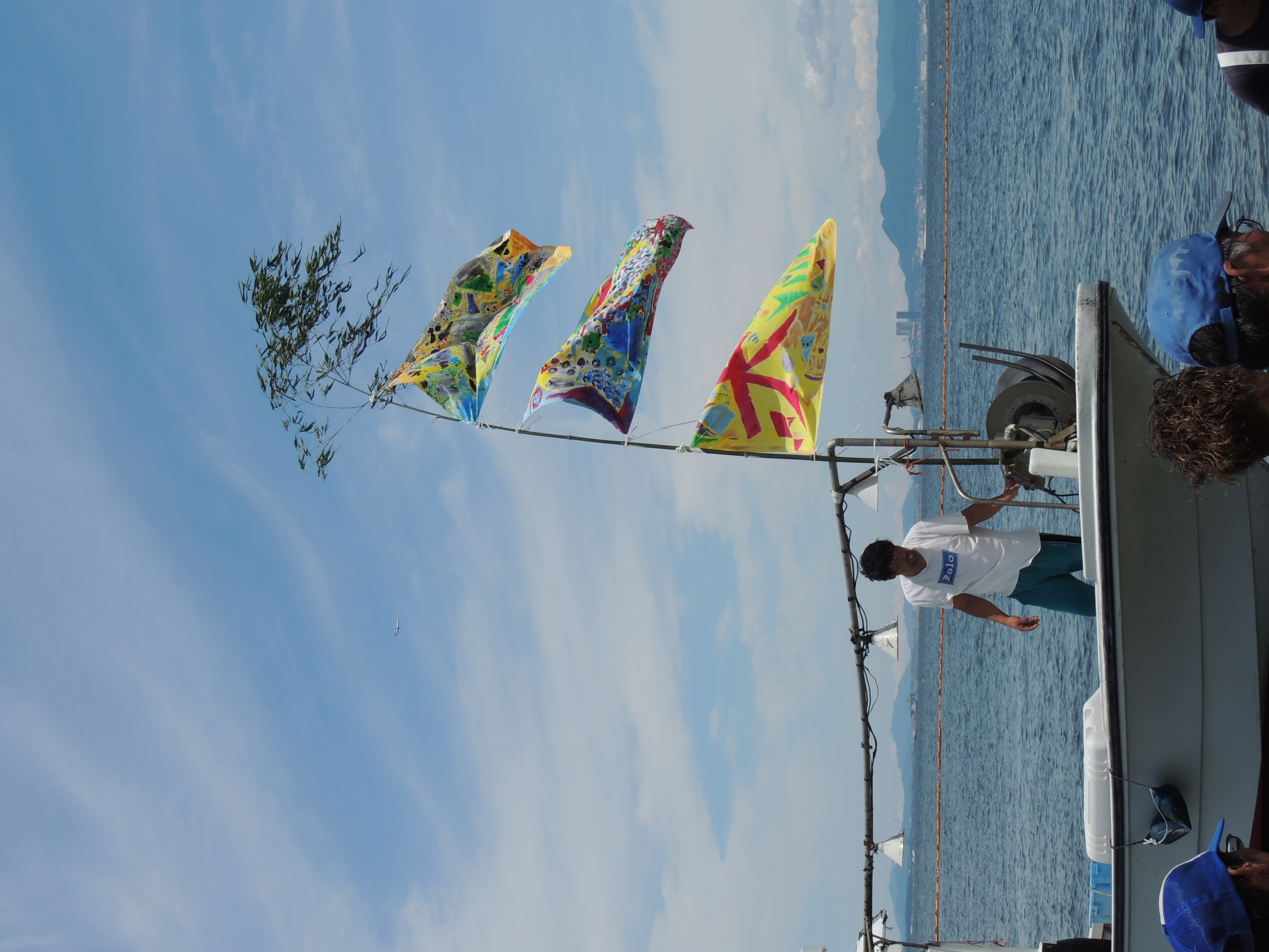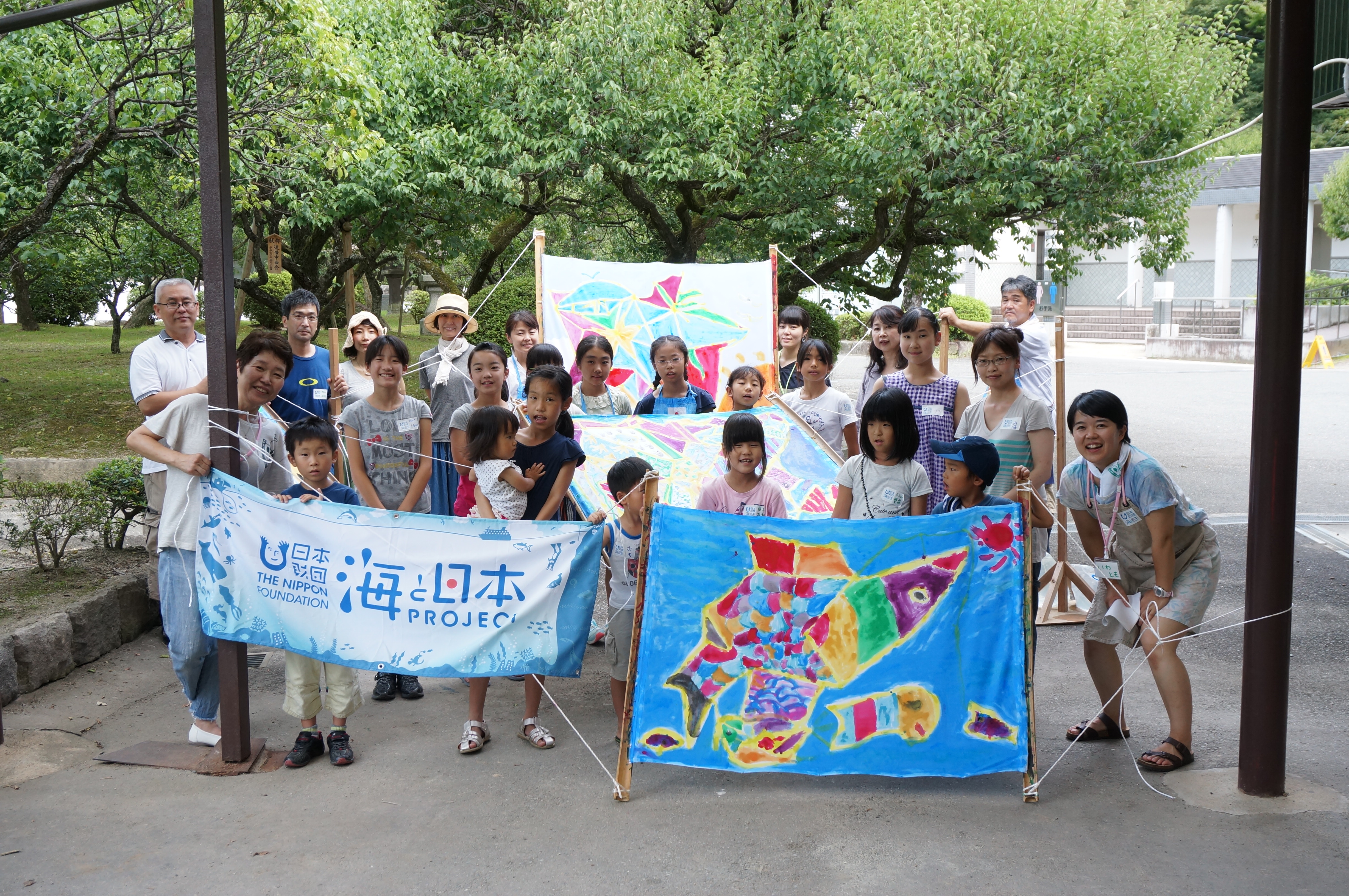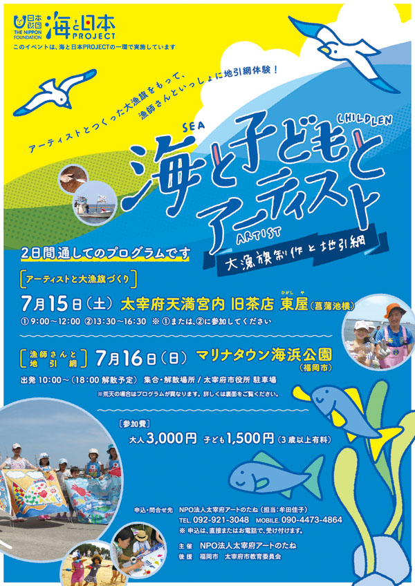 日本財団 海と日本PROJECT 海と子どもとアーティスト 大漁旗制作と地引網 7月15日(土)太宰府天満宮内旧茶店 東屋にて、オリジナル大漁旗づくり 参加者70名 アートユニットANDNA(現代アーティスト 岩田とも子さん・布作家 松田唯さん)のリードで、地引網の漁船に掲げる大漁旗をデザインし、制作しました。 大漁旗に込められた意味やそこに描かれている絵柄や構図の工夫も学びながら、どんなオリジナルの旗を作るか、みんなで考えました。 今回は「つなぐ」をテーマに、点をつないで絵を描いていくことになりました。 スケッチブックでウォーミングアップ。黄色の線は、何の形に見えるかな。 日本古来の染の技法を使って、色を塗っていきます。 とてもかわいい8枚の旗ができあがりました。 7月16日(日)マリノア海浜公園 漁師さんと地引網 参加者75名 福岡市漁協姪浜支所漁師さんたち20名 厳しい自然を相手に仕事をしている漁師さんは、とてもたくましく、優しく温かい方ばかりです。 みんなが作った旗を漁船に掲げて、網を引いてきてくれます。自分で作った旗を見つけて、誇らしそうな子どもたちの笑顔がはじけます。 皆で、力いっぱい網を引き、魚を手づかみで捕まえます。 網には、タイ・イサキ・イカ・フカなどがたくさん!。 ワクワクドキドキ。生きている魚を触るのは、初めてだという子どもたちがほとんど。手の中で跳ねる魚は、命そのもの。 次は、捕まえたばかりの生きている魚をさばきます。漁師さんに教えてもらいながら、魚のうろこを取り、内臓を取り出し、バーベキューや刺身にして食べました。 命をいただきながら生きている自分たちについて考え、「いただきます」に込められた思いを改めて、実感することができました。 2日間通してのプログラムは、アーティストや漁師さんとふれあい、家族での交流も深まりました。 太宰府からは遠く感じる海ですが、その魅力を大いに楽しんでもらうことができました。 これからも海のことを思い、自分たちの住む地域の自然を大切にすることを学ぶこともできました。 子どもたちは、スケッチブックにいろいろな思いを描き、夏休みの自由研究とすることができました。 |