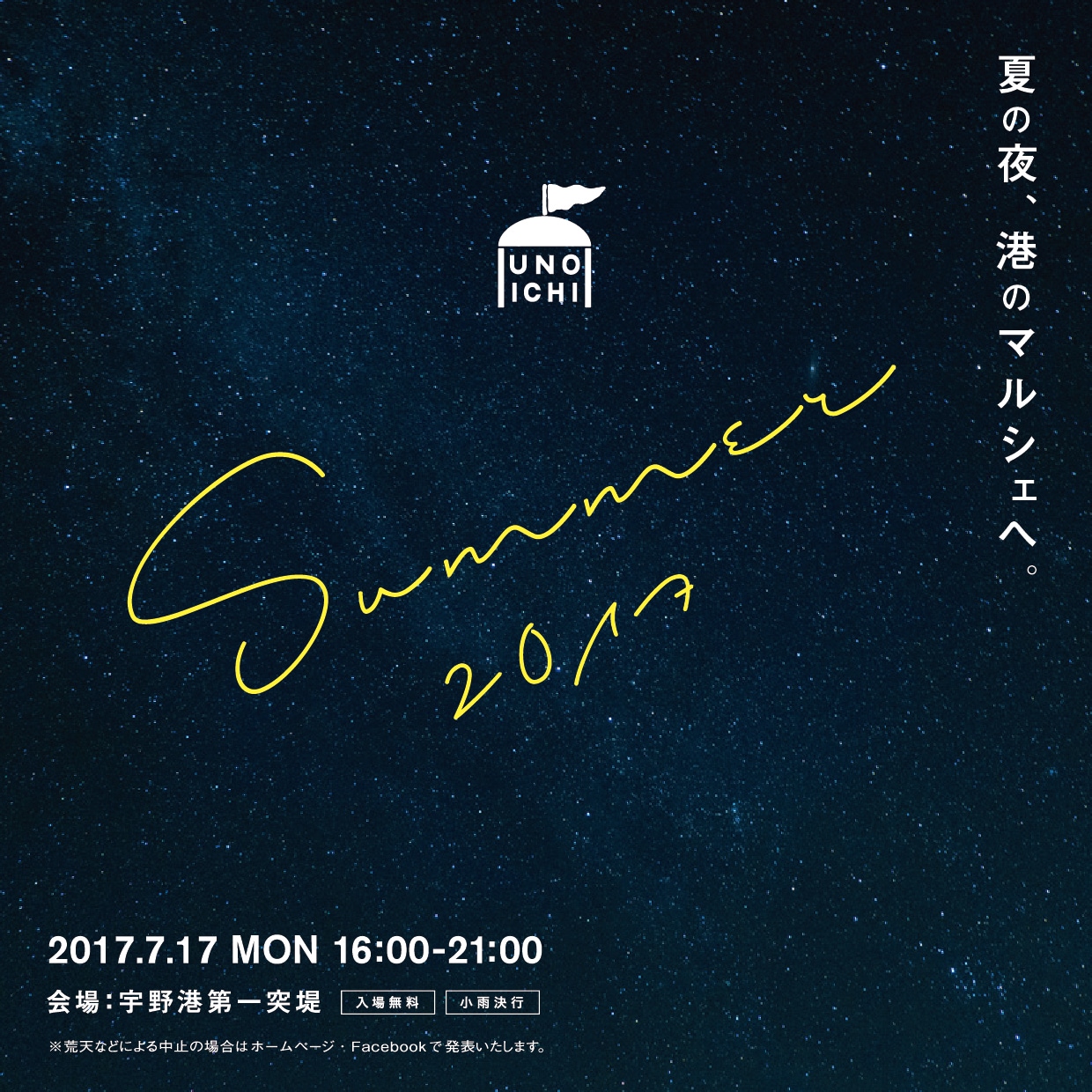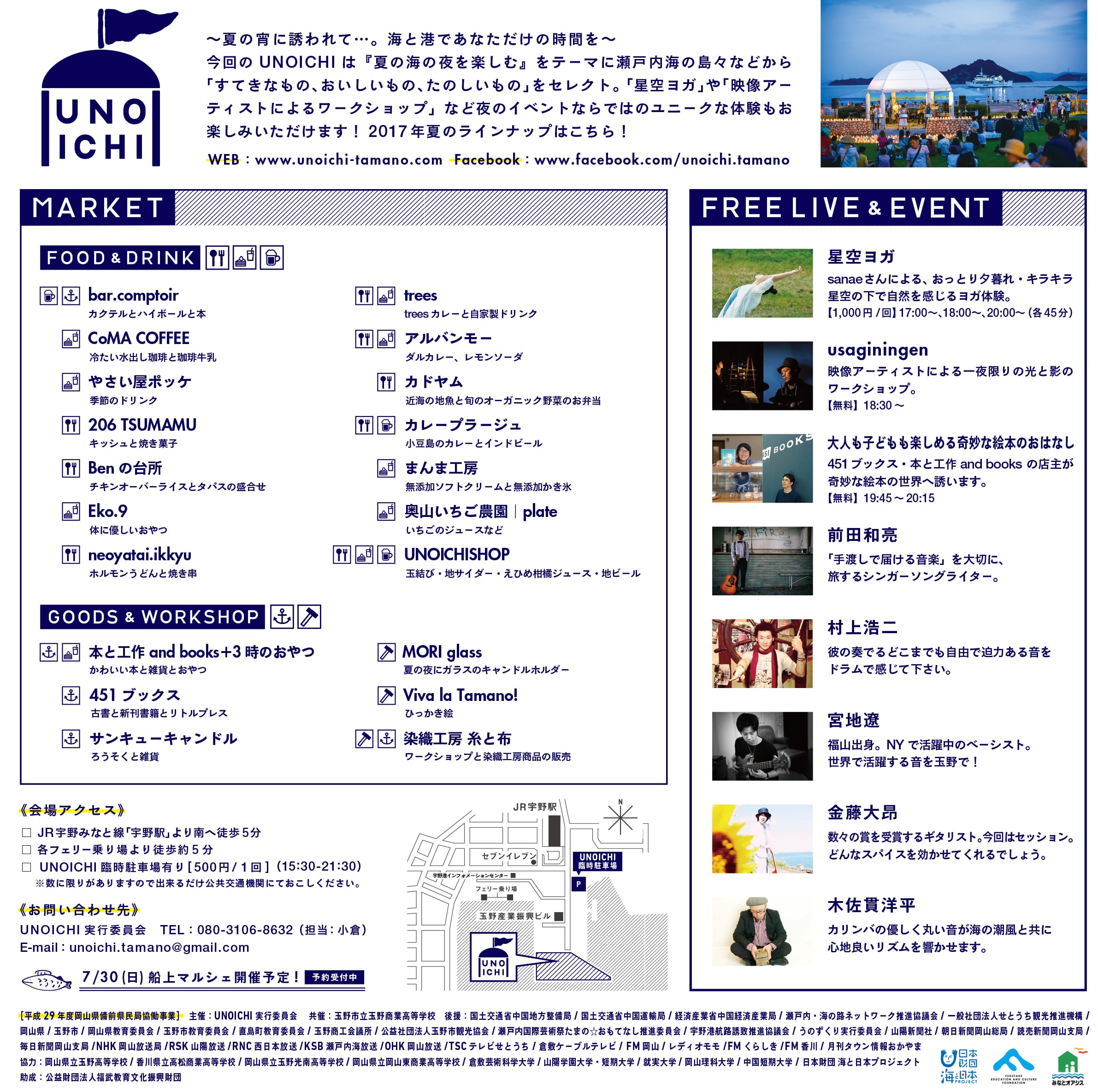 活動を通してもっと海・港を身近に感じよう。#海と日本 または #海ゴミ をつけて世界に発信しよう。 以上を合言葉にクリーン活動を行った。 <実施イベント> 夏の夜のUNOICHI ~夜の海を楽しむマルシェ~ <詳細> ◆タイトル:『夏の夜のUNOICHI ~夜の海を楽しむマルシェ~』 ◆キャッチコピー:「夏の宵に誘われて・・・。海と港であなただけの時間。」 ◆日時:2017時7月17日(月・祝) ◆開催地:岡山県玉野市 宇野港第1突堤 ◆時間:16時~21時 ◆来場目標数:3000人 ◆実来場者数:3500人 <イベント> ◆時間帯ごとに3パターンのヨガ教室!ギラギラ太陽の下でヨガ・夕暮れヨガ・星空の下でヨガ。 ◆真夏の夕べに、光と影を使ったワークショップで参加・・・自作の映像機と楽器を使った、映像と音楽のパフォーマンスユニット、usaginingen(ウサギニンゲン)によるパフォーマンス。 (2016年に活動拠点をドイツ・ベルリンから香川県豊島に移し、豊島ウサギニンゲン劇場をオープン。アナログとデジタルを独特の手法で組み合わせたパフォーマンスは各国で高い評価を得ており、2014年にアイスランドで行われた、Reykjavik Visual-Music Festivalのライブシネマ部門でグランプリを受賞) ◆大人も子どもも楽しめる奇妙な絵本のおはなし・・・親子で大人も楽しめるちょっぴり奇妙な絵本読み聞かせ <出店> ◆岡山県9店舗、玉野市7店舗、小豆島1店舗、高松市3店舗=20店舗 (ドリンク3店舗・フード12店舗・グッズ2店舗・ワークショップ3店舗) ◆初出店。夏夜風と珈琲と・・・CoMA COFFEE ◆食力そそるスパイシーカレー・・・trees ◆自ら夜空を作っちゃおう(ひっかき絵)・・・Viva la Tamano! ◆初出店。甘酸っぱい味が夏にもいい!いちごジュース・・・奥山いちご農園|plate など <アーティスト> ◆UNOICHI史上4名によるジャズセッション!夜空にココロオドル旋律が宇野港に流れます! 自身のプロジェクトや様々なミュージシャンのバンド等で活動中の4人が集う奇跡! 今夜だけのスペシャルな音楽の贈り物。 ・村上 浩二(ドラム奏者・ドラム講師・岡山県笠岡市出身 グラミー賞アーティスト SPEECH(Arrested Development2016年来日ツアー東京サポートを務める) ・金藤 大昂:(1991年生まれ。広島県福山市出身広島県福山市を中心にソロ活動の他、様々なアーティストのサポート演奏、ラジオ出演、レコーディング、ギター講師を務めている。) ・木佐貫 洋平:(鹿児島県出身。6歳よりクラシックピアノを。14歳からエレキベースをはじめる) ・宮地遼(岡山県出身。NY在住。高校卒業後、2012年より甲陽音楽学院に入学し、様々なジャンルでメジャーアーティストへのサポートも含め音楽活動を始める。) |
