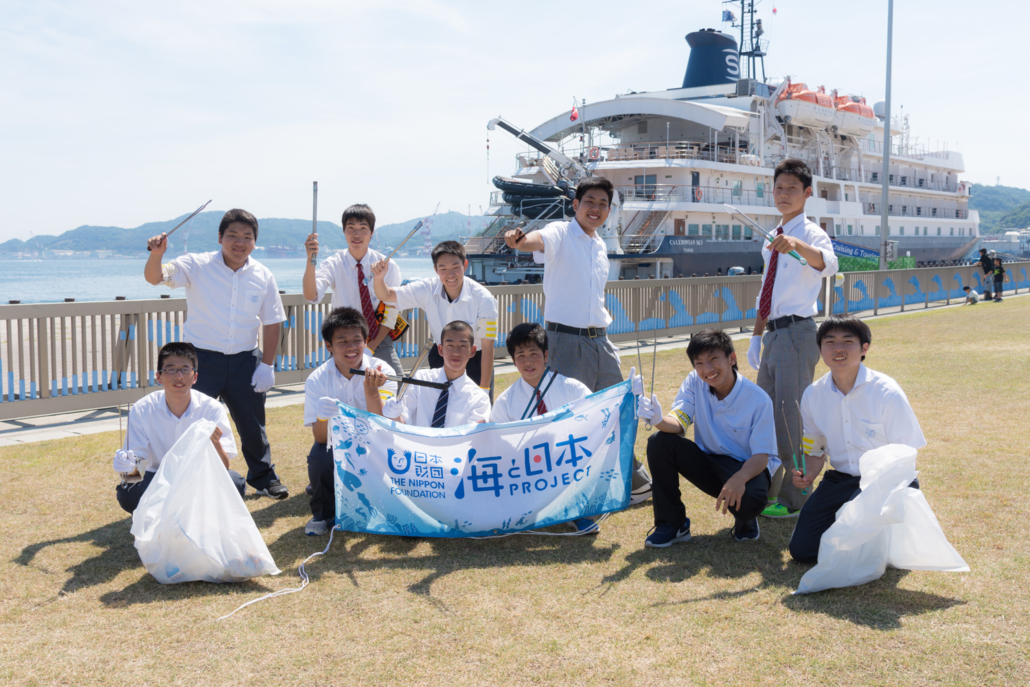 活動を通してもっと海・港を身近に感じよう。#海と日本 または #海ゴミ をつけて世界に発信しよう。 以上を合言葉にクリーン活動を行った。 <開催概要> ◆タイトル:客船入港イベント『Ship`s log 2』 ◆日時:2017年6月18日(日)14時~17時 ◆場所:宇野港第一突堤緑地 ◆概要: ・客船「カレドニアン・スカイ」乗船客をはじめとする海外の方との交流、おもてなし ・岡山県唯一客船が入港出来る港、宇野港のPR ・宇野港発のクルージング誘致 ・若い世代主導による企画実施を行ない、岡山県&香川県の魅力発信 ◆内容: ・テーマ:探検船として名高い、英国のクルーズ客船『カレドニアン・スカイ』を若い力が歓迎! 学生が日本のおもてなしと休日の家族の過ごす場を提供いたします。 ・出店:玉野市立玉野商業高等学校:UNOICHI公式フード!玉野の特産品で作ったおむすび「玉結び」UNOICHI SHOP:2種類のノンアルコールカクテルとみかんジュース! ・地域:岡山県内の高校生、専門学校生、大学生 ・企画:玉野高校吹奏楽部による演奏+玉野の地踊り「かっからか」+しゃぼん玉+スケッチ 来場目標300人に対して793名の来場があった。 客船クルーも一緒にクリーン活動を行ってくれた。 |