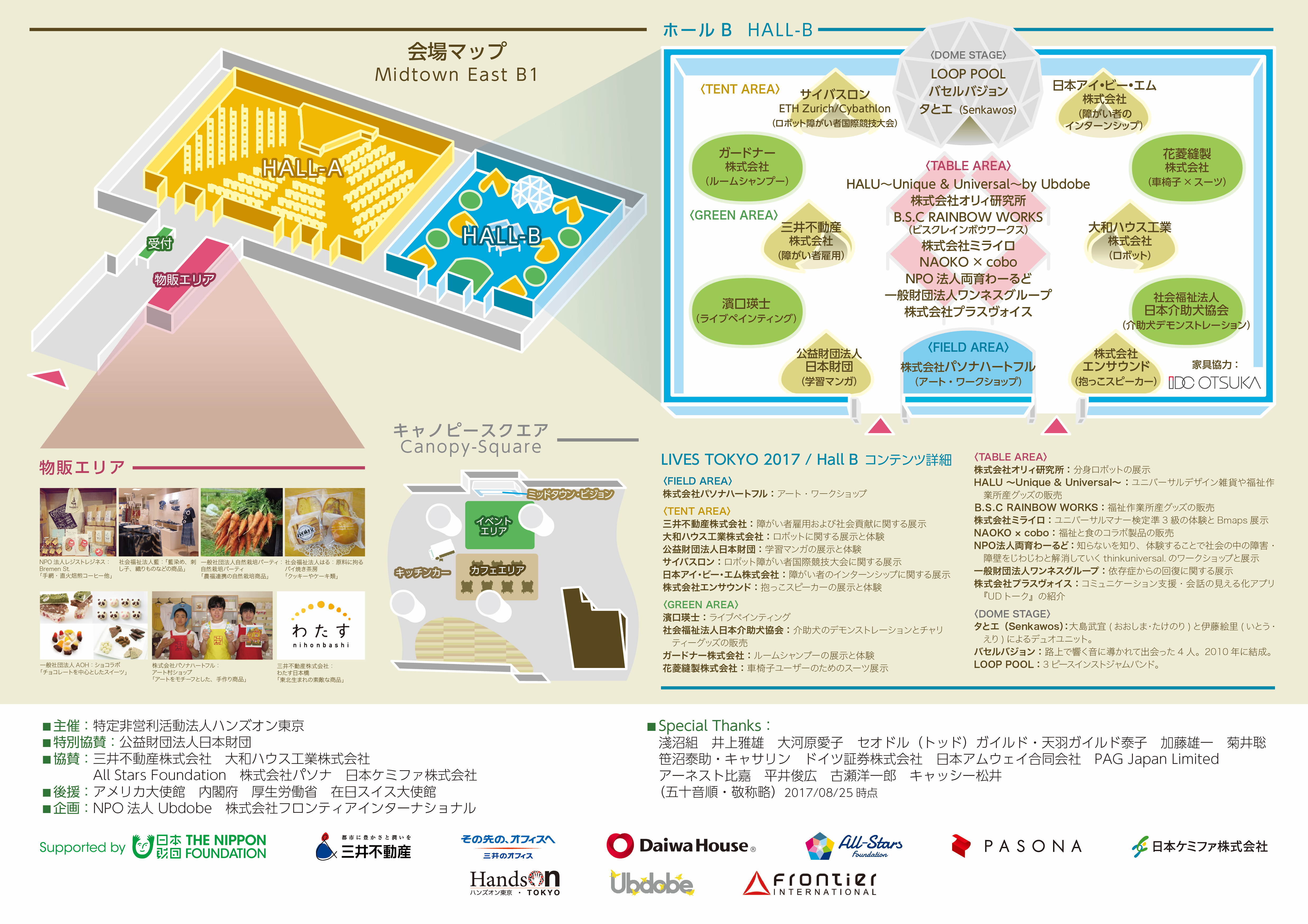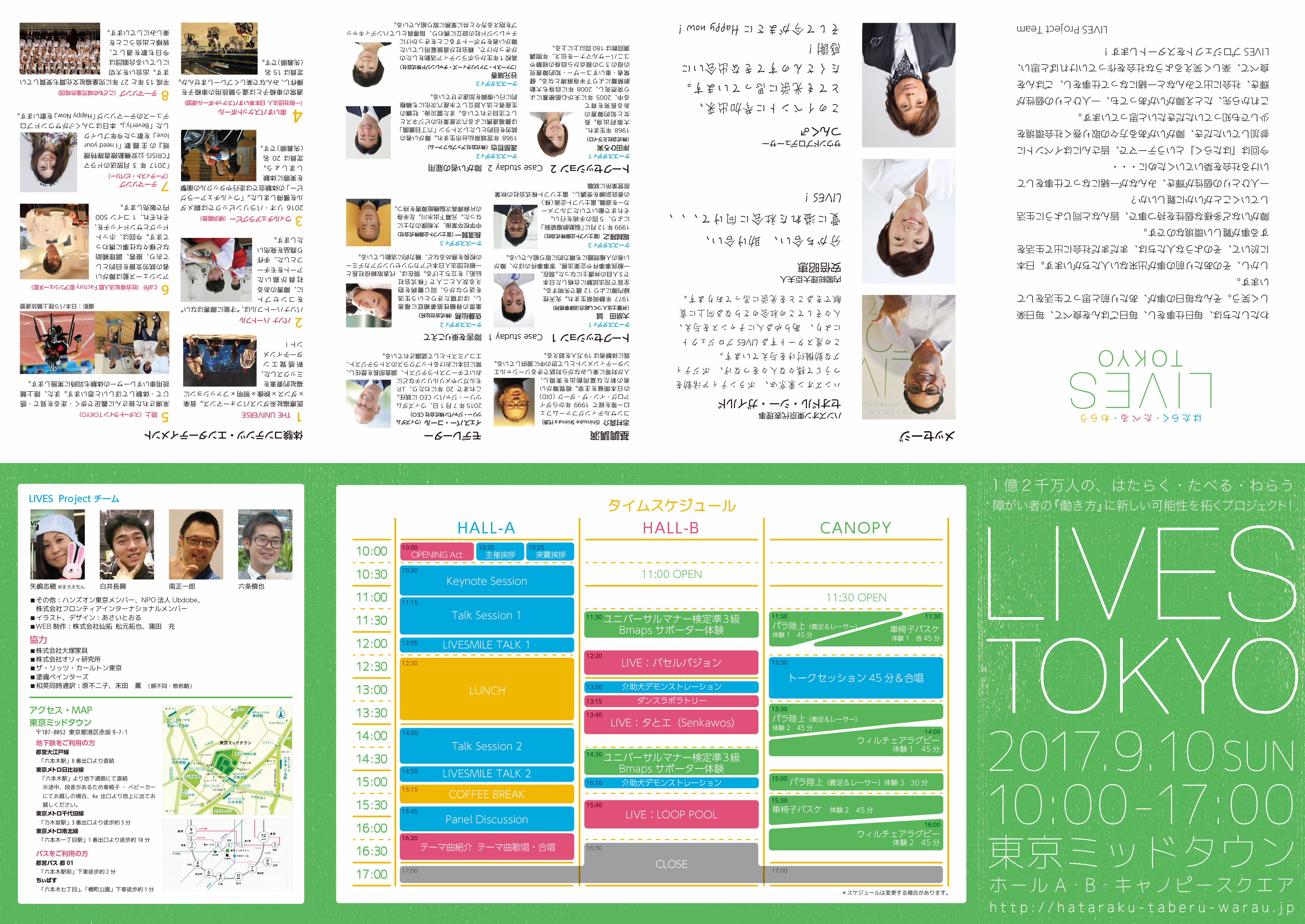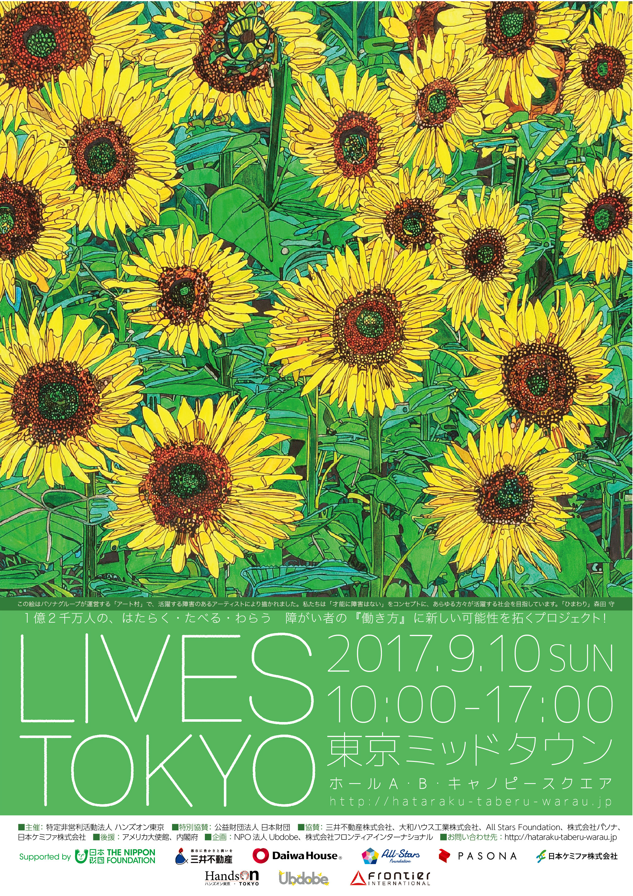 LIVESプロジェクト:障がい者との共同プロジェクト LIVES TOKYO 2017 「はたらく・たべる・わらう」の開催 2.成果物概要 ①パンフレット ②チラシ ③ポスター ④Webサイト ⑤LIVES TOKYO 2017報告動画 ※①~④はプロのディレクションの元、障がい者が作成した。 3.LIVES TOKYO 2017概要 ホールAでは、障がい者のパフォーマー集団The Universeや、つんく♂さんがサウンドプロデュースした歌をBeverlyさんが熱唱したエンターテイメントステージや、障害当事者や障がい者を雇用する企業によるトークセッション、そして「私の理想の社会とは」というテーマで当事者が3分間で想いを伝える【LIVESMILE TALK】を行いました。 ホールBでは、三井不動産株式会社による障がい者雇用に関する展示や、スイス大使館の協力で実現したサイバスロンの紹介など、先進的な企業・団体・個人によるブース出展を展開し、参加者も途切れることなく終了しました。 キャノピー・スクエアでは、パラスポーツ体験やパラアスリートによるトークセッション、障がい者が運営するカフェ、義足体験、そして こどもの城児童合唱団による合唱を行いました。 また物販・展示スペースでは、就労継続支援事業所で作られた魅力的な製品及び食品の販売や、株式会社パソナハートフル所属のアーティストによる絵画を展示しました。 様々なコンテンツが東京ミッドタウン内で展開され、一度に多くの体験や学びの機会を参加者に提供することができました。 4.参加人数 登録参加者(ミッドタウンホール HALL A):705名 一般参加①(ミッドタウンホール HALL B):1718名 一般参加②(ミッドタウン キャノピースクエア):557名 ・参加ボランティア:100名 〈合計〉3050名 トークセッションとエンターテイメントステージを行なったホールAは、入れ替えもありながら常時満席状態となった。ホールBは従来の福祉展示会とはイメージの異なる人工芝を敷いたオープンなスペースでの展示会となり、参加者や展示出店者からの満足度も高く、参加者が途切れることがなく開催できた。キャノピー・スクエアで展開したカフェやパラスポーツ体験・トークセッションも全てのコンテンツを大勢の参加者とともに成功裏に終了した。 5.PR効果 告知: オフィシャルWeb: http://hataraku-taberu-warau.jp Facebook: https://www.facebook.com/livesproject/ 告知ムービー https://youtu.be/JOTKX-claIs 駅広告:六本木、恵比寿 掲載 TV:3件、ラジオ:3件、新聞8件、雑誌3件、WEB:128件 広告換算額 合計¥91,594,902- |
