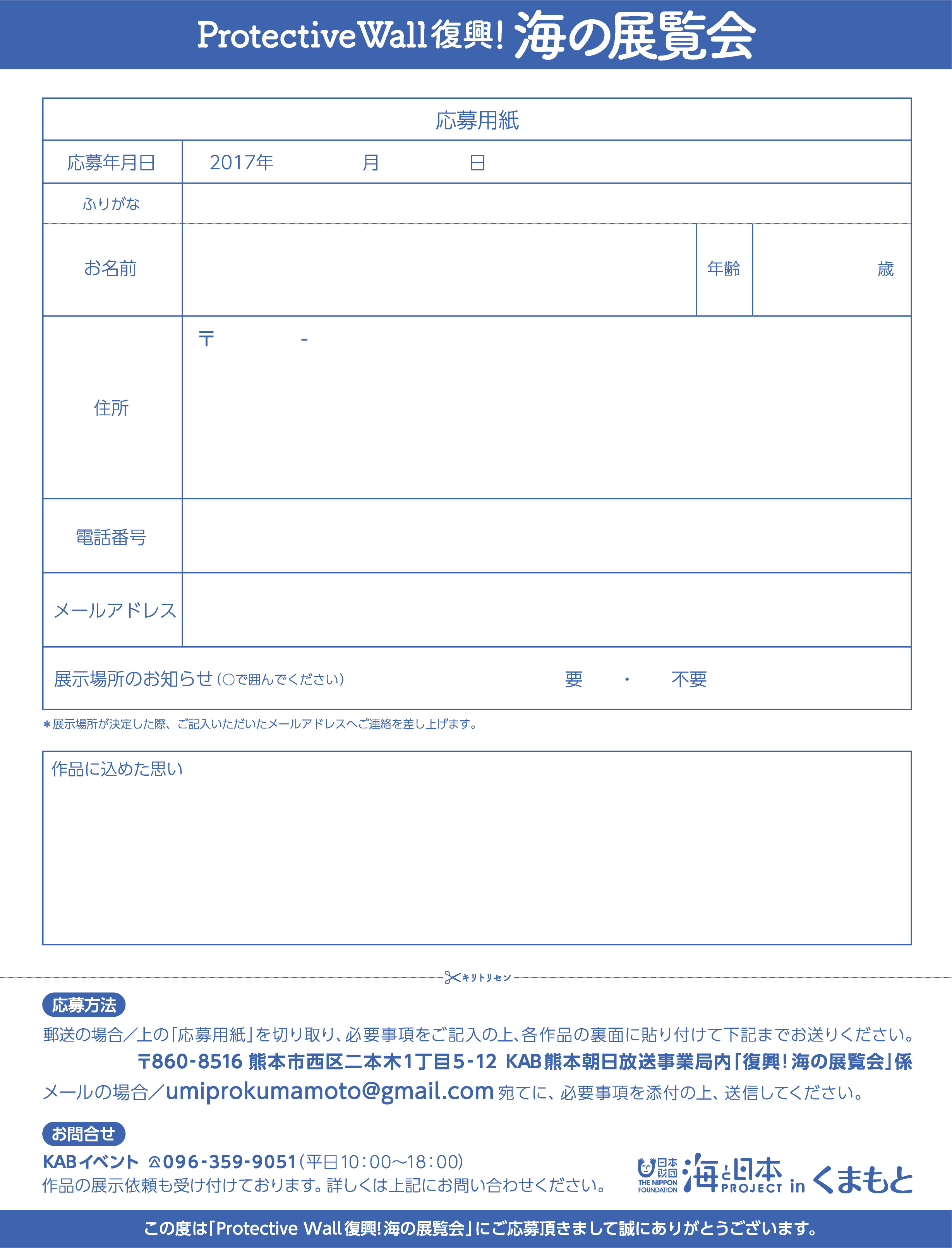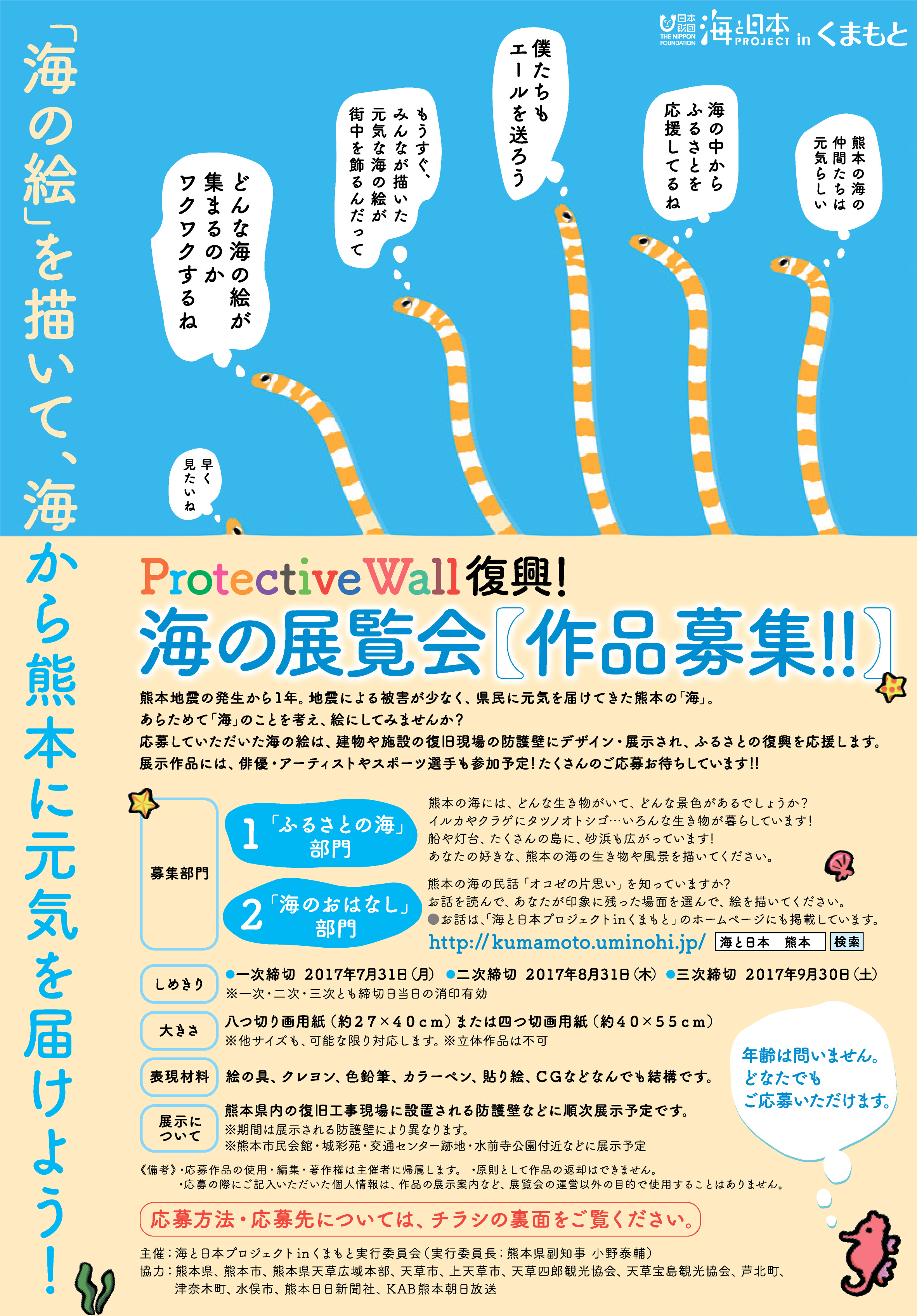 1.熊本県内71の企業・団体を事業の推進パートナー登録、5つの企業・団体と連携事業を実施 2.公式ウェブサイトにて、県内の海に関するニュースを105本発信 3.熊本県内の海に関するイベントやアクティビティー等を紹介する2~3分の動画を30本制作・放送 4.熊本県内の海に関するムーブメントの熱源となりうる10人のキーパーソンを紹介する15秒の動画を10本制作・放送 5.キーパーソンの活動内容を紹介し、海への危機意識や活動の背景にある想いを訴える2~3分程度のインタビュー動画を10本制作・放送 6.海と日本プロジェクトにて全国展開する事業(ニュースプロジェクト、ゴミ拾い、紙芝居・ダンス、さばける塾等)とのコラボイベントの実施 7.オリジナルイベント「ProtectiveWall復興!海の展覧会」の実施 |