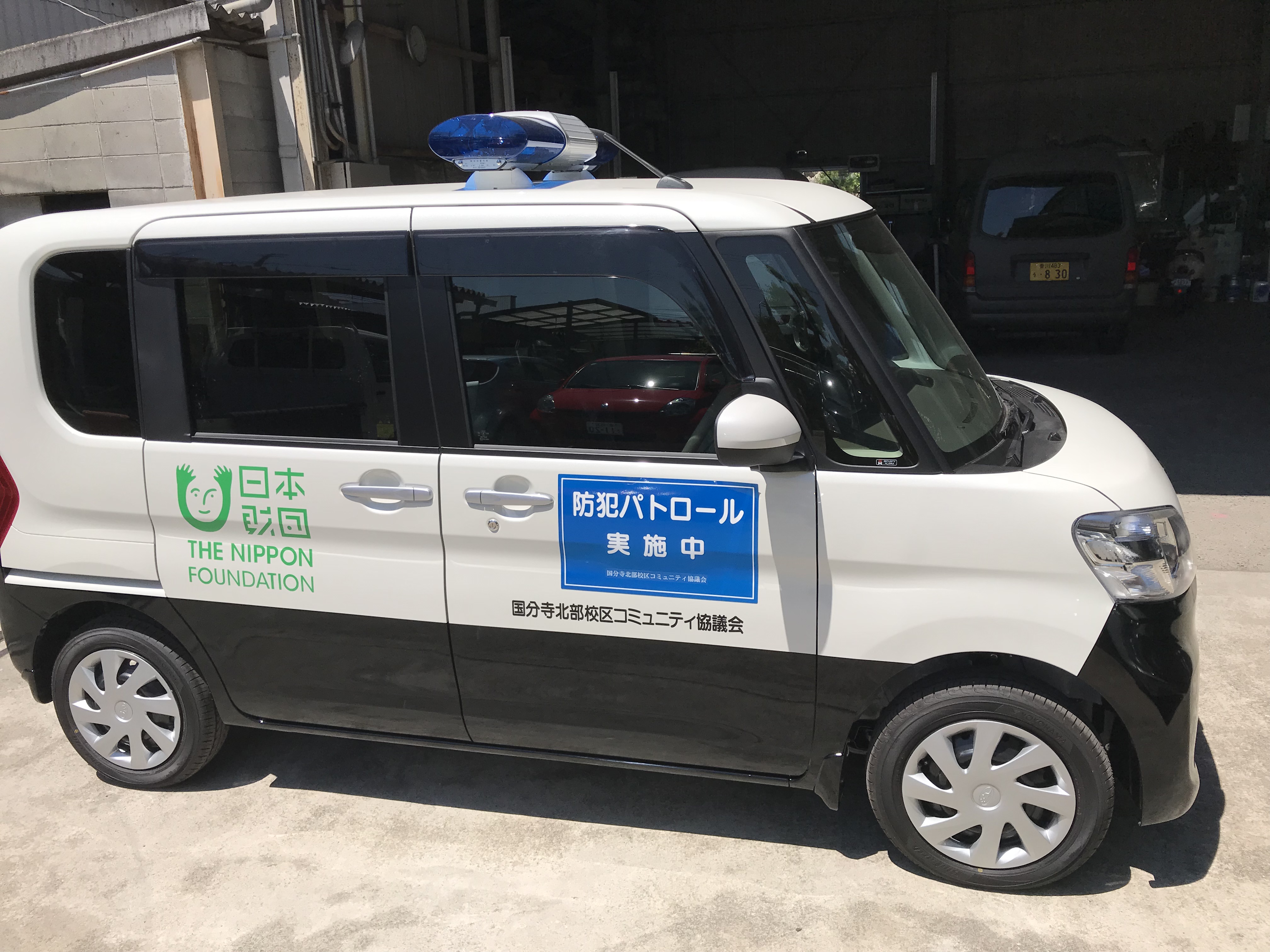 国分寺北部校区コミュニティ協議会では、環境問題に取り組み成果をあげていますが、地域生活を取り巻くさまざまな問題に拡充して取り組む必要があるとの声があがり、平成25年度より安全・安心な地域生活を実現していくために「わがふるさとのくらしは地域全体でまもる。」を合言葉に、青色回転灯を装備した自動車を使用し(通称:青パト)自主防犯パトロールを行っております。