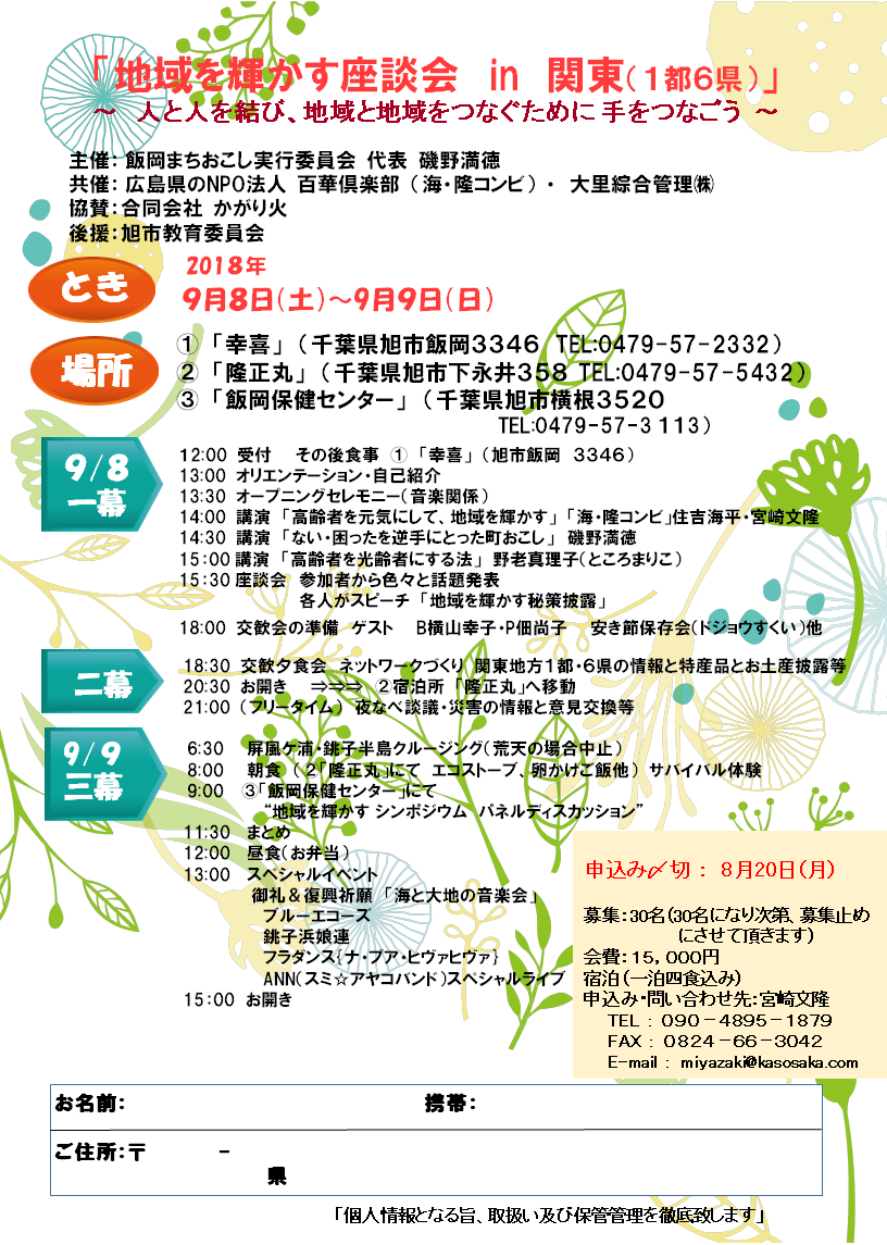 日本は少子高齢化により、地域社会は元気をなくして、輝きを失って来ています。地域を輝かす方法は 色々ありますが、今回は「高齢者(60歳以上)」に絞って「高齢者を元気にして、地域を輝かす」を テーマにシンポジウムを行いました。 「高齢者」を元気な輝きのある「光齢者」にして、「地域を輝かす」ための方法を考えるために、 関東地方の1都6県の皆さんに集まっていただき、ネットワークを構築して、新しい視点や角度そして 発想を話し合いました。 【プログラム(1泊2日)】 1.日 時 2018年(平成30年)9月8日(土)~9日(日) 2.場 所 ①「幸喜」(千葉県旭市飯岡3346 TEL:0479-57-2332) ②「隆正丸」(千葉県旭市下永井358 TEL:0479-57-5432) ③ 「飯岡保険福祉センター」(千葉県旭市横根3520 TEL:0479-57-3113) 3.参加費 15,000円(1日夕、2日朝昼の一泊三食) 4.主催者 飯岡まちおこし実行委員会 代表 磯野満徳 5. 共 催 NPO法人 百華倶楽部 ・ 大里綜合管理㈱ 6.協 賛 合同会社カガリ火 7. 後援 旭市教育委員会 ・大衆日報社 ◆2018年9月8日(土) 【1幕目】 12:00 受付 その後食事 ① 「幸喜」 (旭市飯岡 3346) 13:00 オリエンテーション・自己紹介 13:30 オープニングセレモニー(音楽関係) 14:00 講演 「高齢者を元気にして、地域を輝かす」 「海・隆コンビ」住吉海平・宮崎文隆 14:30 講演 「ない・困ったを逆手にとった町おこし」 磯野満徳 15:00 講演 「高齢者を光齢者にする法」 野老真理子(ところまりこ) 15:30 座談会 参加者から色々と話題発表 各人がスピーチ 「地域を輝かす秘策披露」 18:00 交歓会の準備 ゲスト B横山幸子・P佃尚子 安き節保存会(ドジョウすくい)他 【2幕目】 18:30 交歓夕食会 ネットワークづくり 関東地方1都・6県の情報と特産品とお土産披露等 20:30 お開き ⇒⇒⇒ ②宿泊所 「隆正丸」へ移動 21:00 (フリータイム) 夜なべ談議・災害の情報と意見交換等 ◆ 2018年9月9日(日) 【3幕目】 6:30 屏風ケ浦・銚子半島クルージング(荒天の場合中止) 8:00 朝食 (②「隆正丸」にて エコストーブ、卵かけご飯他) サバイバル体験 9:00 ③「飯岡保健センター」にて “地域を輝かす シンポジウム パネルディスカッション” 11:30 まとめ 12:00 昼食(お弁当) 13:00 スペシャルイベント 御礼&復興祈願 「海と大地の音楽会」 渡辺音楽教室アンサンブル (小学生、中学生の皆さん) 銚子浜娘連 フラダンス{ナ・プア・ヒヴァヒヴァ} ANN(スミ☆アヤコバンド)スペシャルライブ 15:00 お開き |