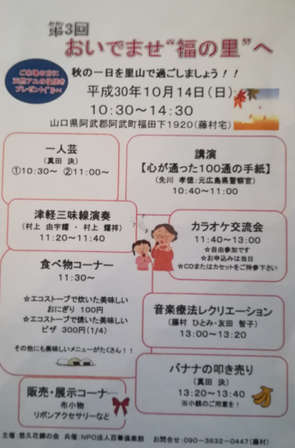 ・山口県の阿武町福田で、講演・津軽三味線演奏・1人芸・音楽療法レクリエーション などを鑑賞し、エコストーブで炊いたおにぎりやピザをいただきながら、地域の皆さんと コミュニケーションを図り、秋の一日を里山で過ごしました。 ご参加の方々には天然アユの塩焼きをプレゼントしました。 ◎日程 ・2018年10月14日(日) 10:30~14:30 ◎場所 ・山口県阿武郡阿武町福田下1920 ◎講演 ・演題:「心が通った100通の手紙」 ・講師:先川孝徳氏(元広島県警察官) ◎参加人数 ・55人 ◎主催 ・悠久花郷の会 ◎共催 ・NPO法人百華倶楽部 |