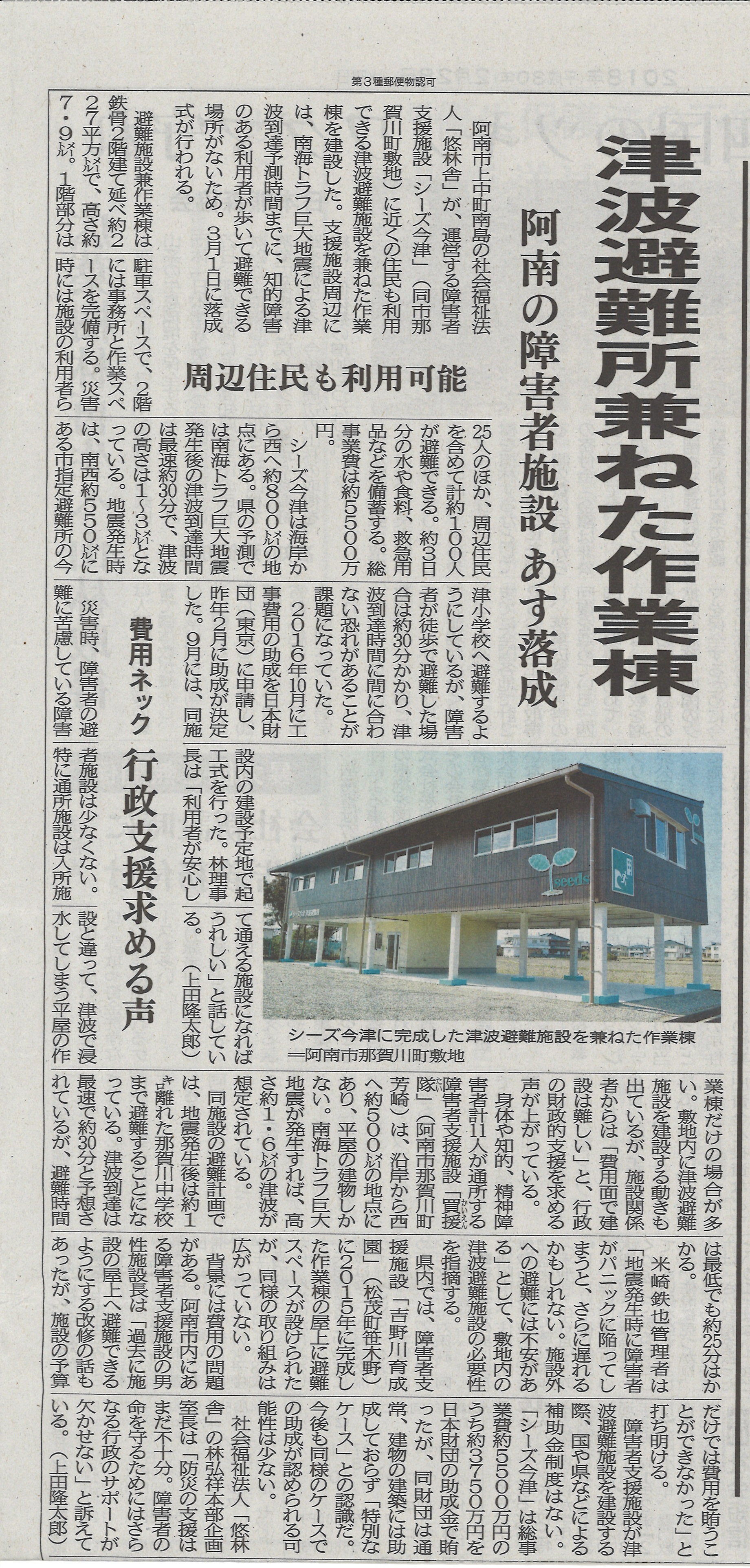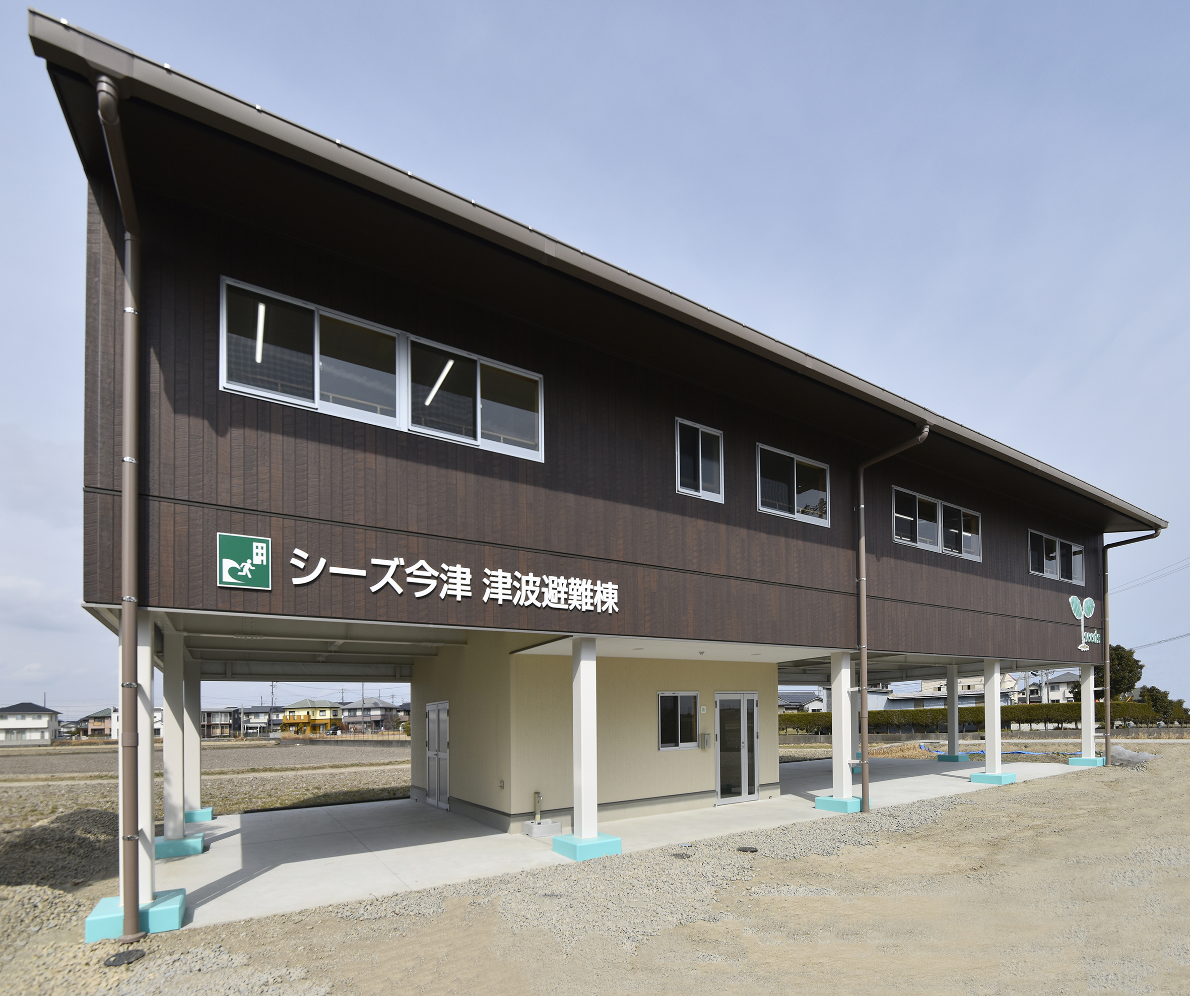 また、災害時には津波発生時にも活用できる強度を持った避難所として地域住民すべての方に開放される。 工事内容 津波避難棟の建設 施設名称 シーズ今津 津波避難施設 整備場所 徳島県阿南市那賀川町敷地庫ノ内139-1、140-1 面 積 1F 38.43m2(ピロティー含まず)、2F188.37m2 延床面積 226.8m2 構 造 1F鉄骨造、2F木造 施設概要 倉庫、事務室、作業室、トイレ 定 員 30名 |