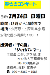 餅つきのあと、コーラスグループの合唱やシニアバンドの演奏で会場が盛り上がりました。 昼食にはジビエカレーをいただき、楽しい時間を過ごしました。 【日時】2019年2月24日(日)13:00~15:00 【場所】小河原・上深川集会場(広島市安佐北区小河原町160-1) 【出演者】コーラスグループ「千の風」・シニアバンド「ジャガバンブー」 【主催】コミサポひろしま NPO法人 百華倶楽部 FU・YOU倶楽部 |