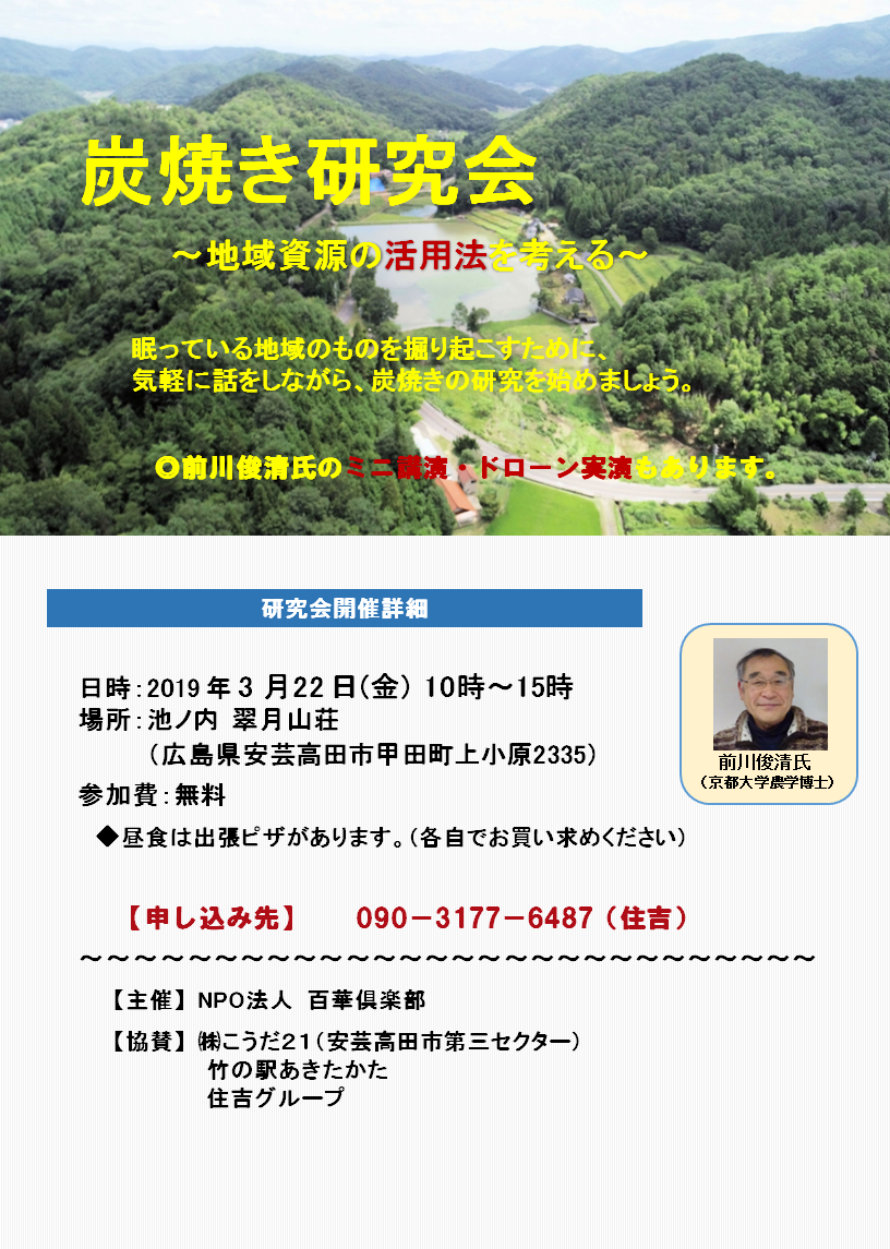 をしながら炭焼きの研究をしました。 ドラム缶で作った炭焼き器を使って、炭焼きの説明を聞きながら参加者が体験する 形で炭焼きを実施。 また、話し合いの中から改良する点などの案が出てきて、次回につなげることが できました。 昼食は薪で焼いた手作りピザをいただきながら交流会を行いました。 午後から、前川俊清氏のミニ講演があり地域資源を掘り起こすための学習を しました。 またドローンの実演を行い、開催地域の里山の様子を参加者全員で鑑賞しました。 【日時】2019年3月22日(金)10:00~15:00 【場所】広島県安芸高田市甲田町上小原2335 池ノ内翠月山荘 【参加費】無料 【参加人数】30名 【主催】NPO法人百華倶楽部 【協賛】㈱こうだ21(安芸高田市第三セクター) 竹の駅あきたかた 住吉グループ |