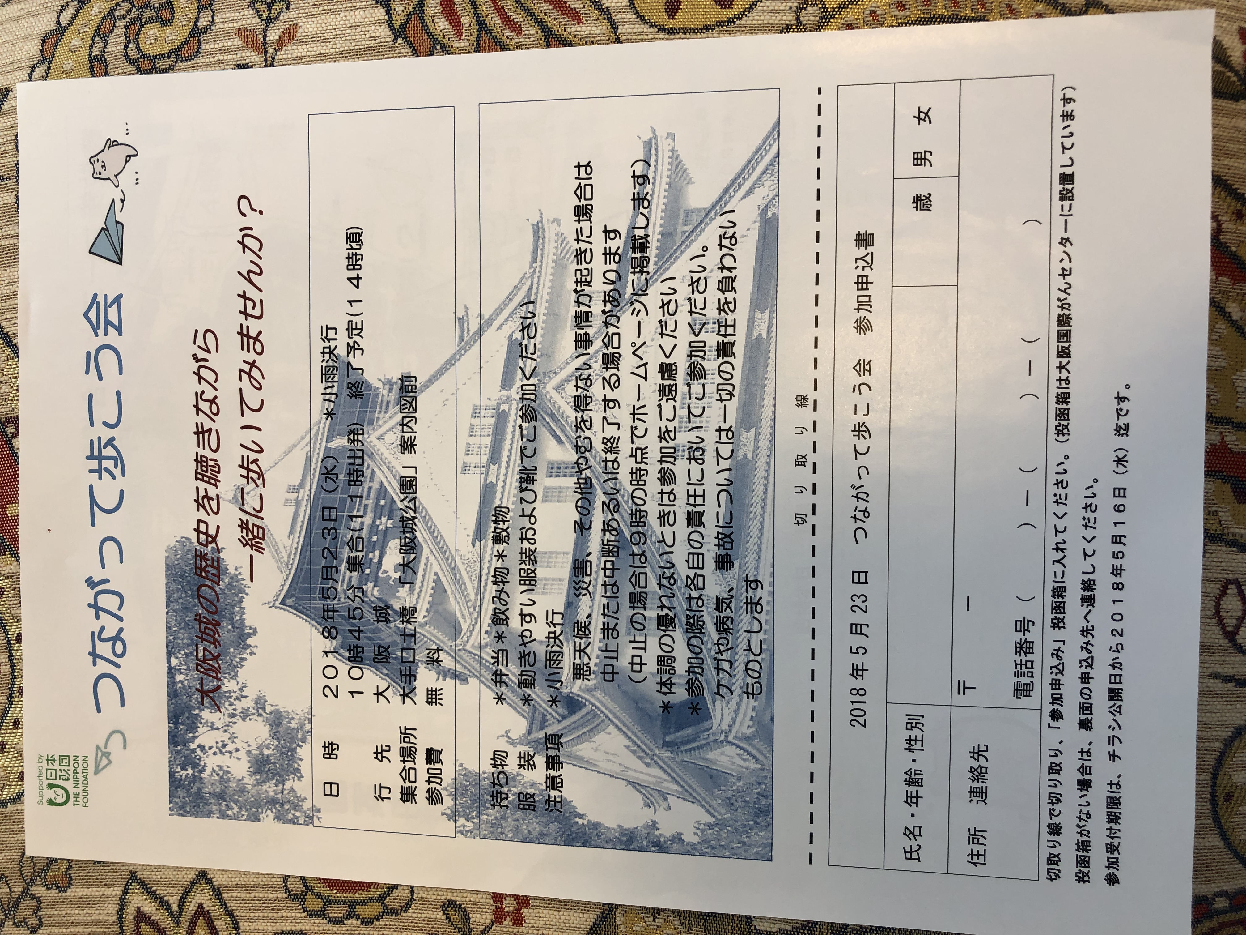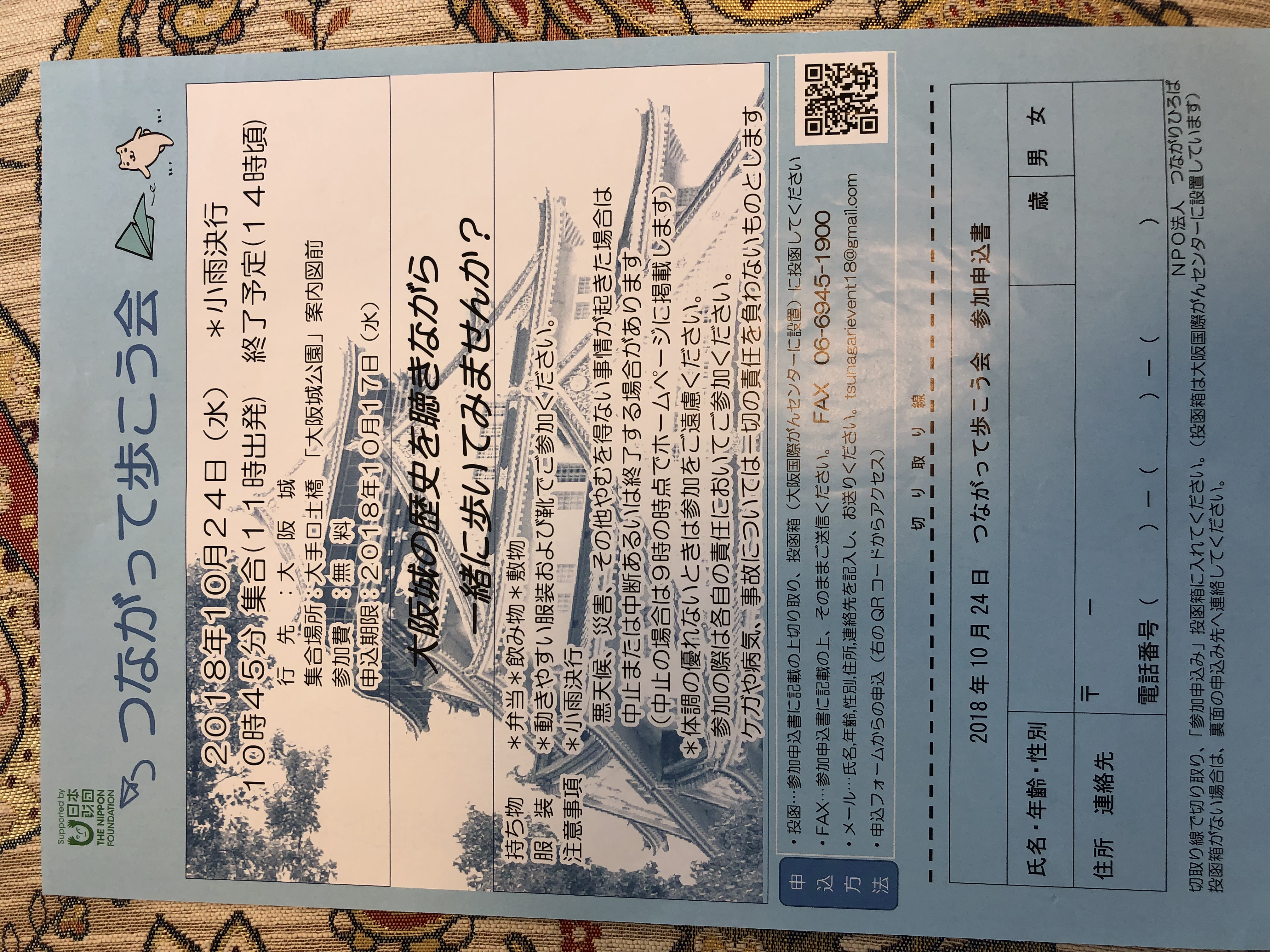 つながって歩こう会 2018年10月24日(水)大阪城公園において「大阪城の歴史を聴きながら一緒に歩いてみませんか?」と呼びかけ、歩こう会を開催した。参加者は9人であった。大阪観光ボランティア協会の方の説明で大阪城の知らない歴史を知ることができ、参加者からは驚きと感嘆の声が聴かれた。1時間30分程度を散策し、西の丸庭園で昼食会と情報交換会を行った。参加者全員ががん患者で、抗がん剤の副作用で靴が履けない患者やすい臓がんと診断され治療が開始された直後で、表情が硬く全く話さない患者もいた。天気のいい日に気分転換の散歩という取り組みは仲間作りにも役立った。 【成果物】・ちらし・写真 |
