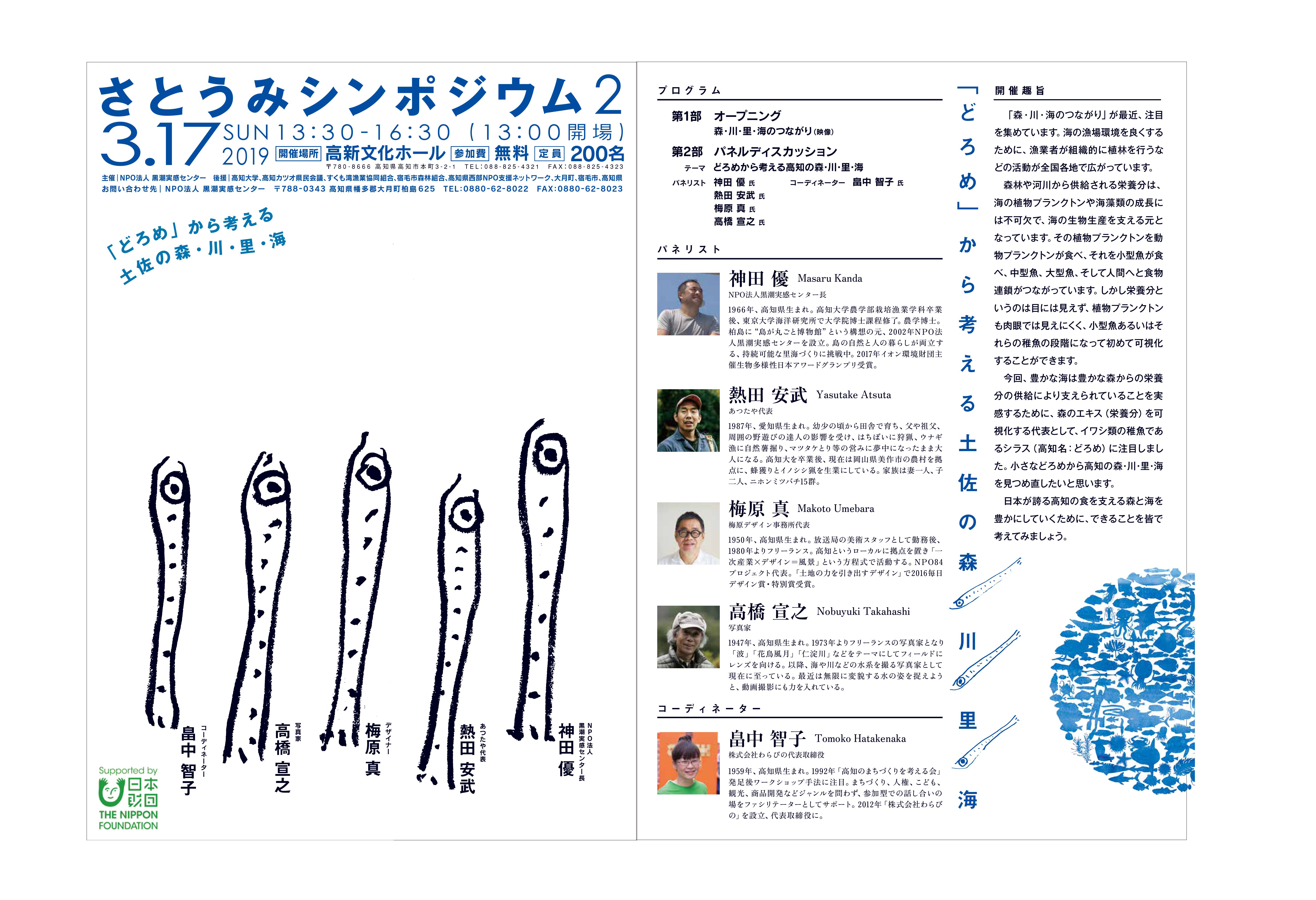2019年3月17日に開催した「さとうみシンポジウム2 どろめから考える土佐の森・川・里・海」のポスター並びにチラシ。