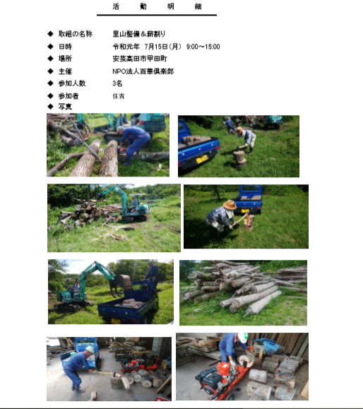 等、地域が一体となって、里山の未利用材をバイオマス燃料として活用するための 仕組みづくりに向け、その準備事業として作業を開始した。 【日時】 令和元年7月15日(木)9:00~15:00 【参加人数】3名 【主催】 NPO法人 百華倶楽部 |