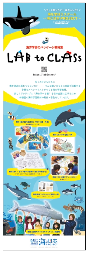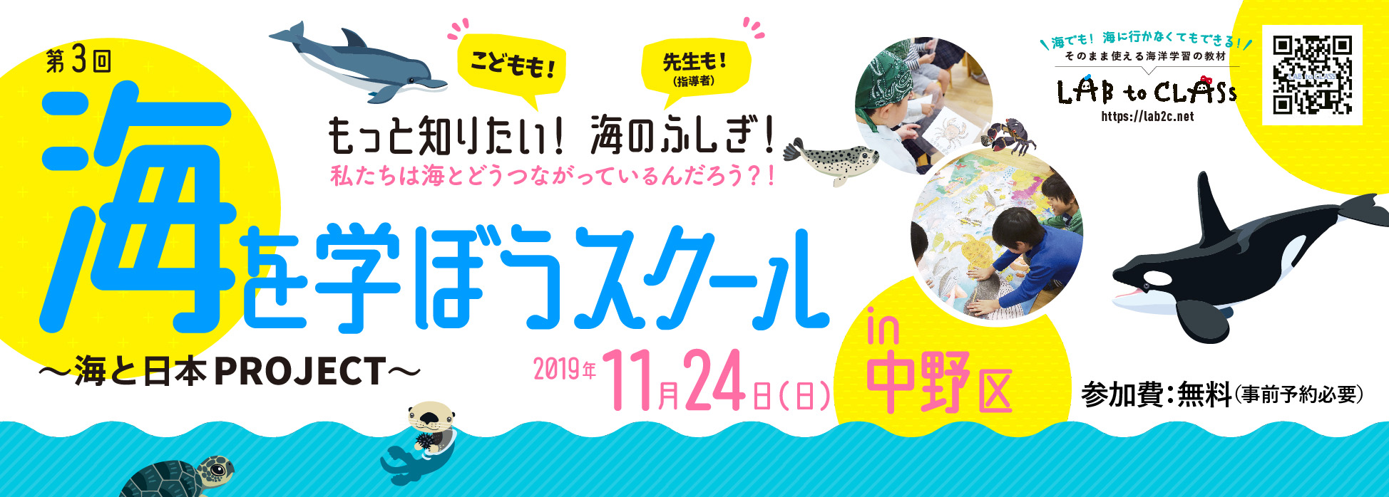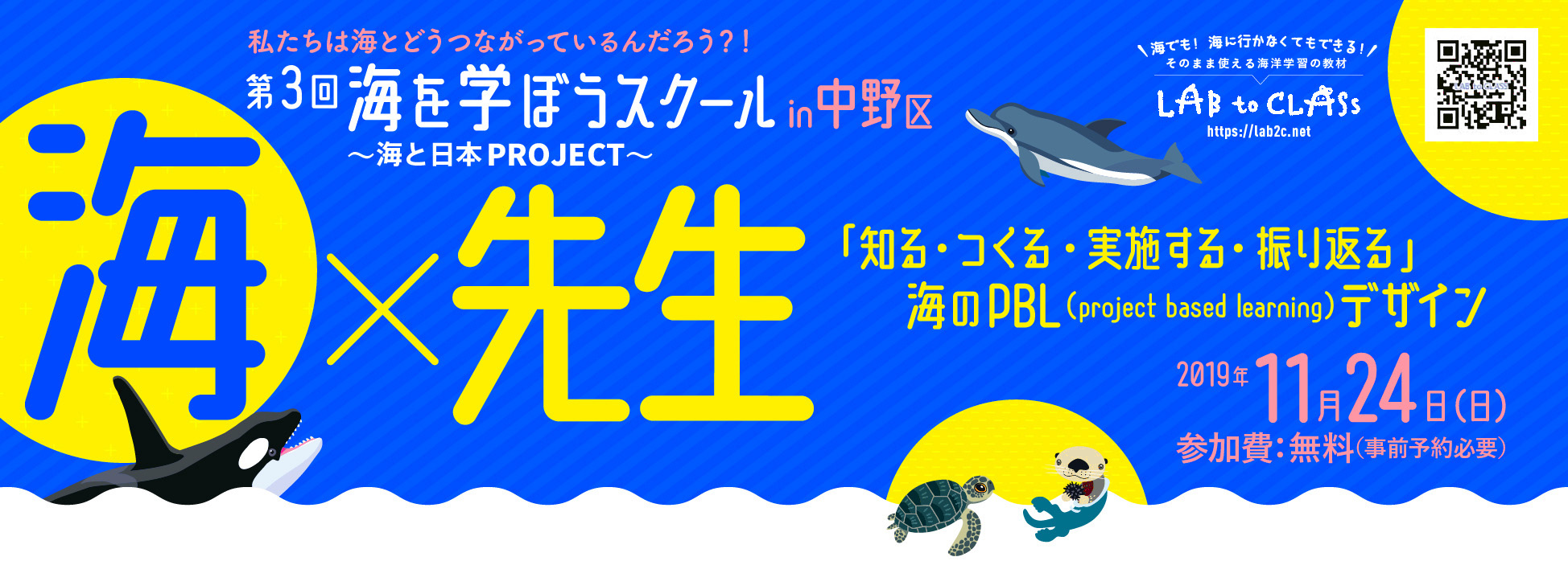 2019年度に全3回実施した「海を学ぼうスクール~海と日本PROJECT~」の広報用ツール(WEB用バナー、掲示用イベントバナー)です。 「海を学ぼうスクール」とは、どこでも!楽しく!安全に!できる<海洋学習教材LabtoClass>を活用した、小学生&教育関係者向けのワークショップです。子供達向けの、<海の生きものKIDSワークショップ>、学校教員・指導者等向けの、<海×先生>ワークショップを、同日同場所で開催しました。