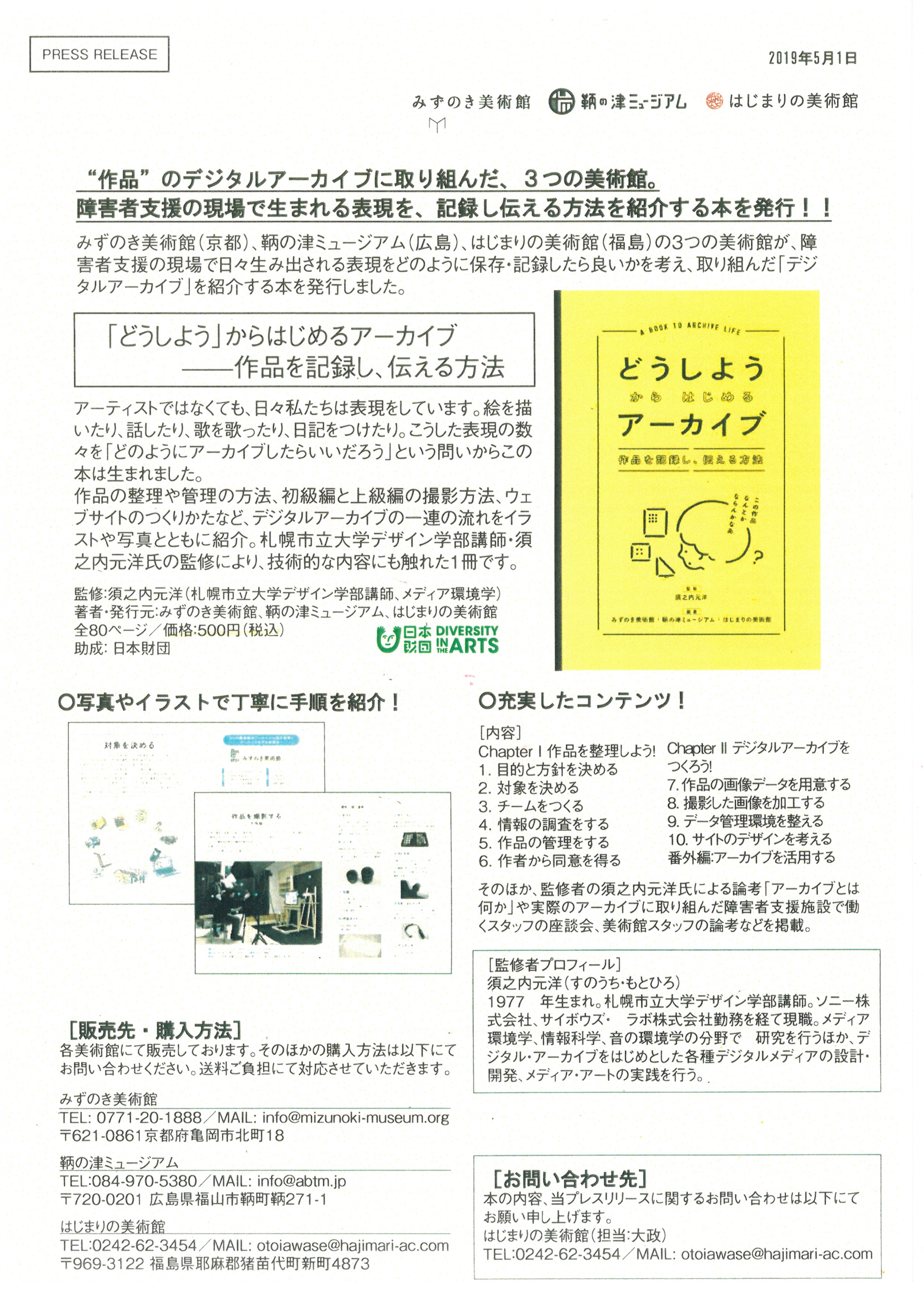 監修|須之内元洋 編著|みずのき美術館・鞆の津ミュージアム・はじまりの美術館 編集|佐藤恵美、はじまりの美術館 無料ダウンロード https://www.diversity-in-the-arts.jp/admin/wp-content/uploads/2019/12/archive_forweb-1.pdf |