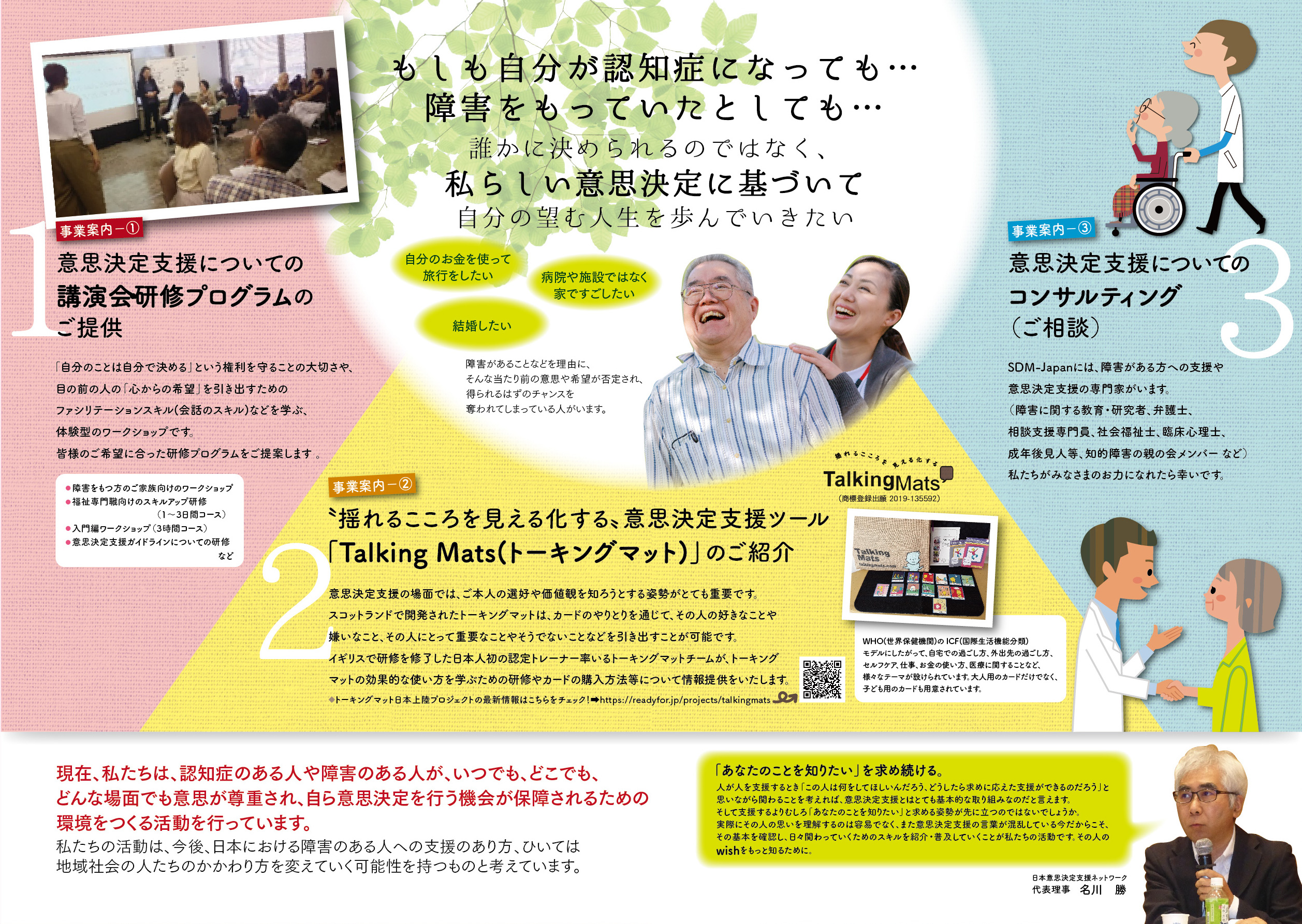 日本意思決定支援ネットワーク(SDM-Japan)の基本的な考え方、めざすところ、事業内容などをわかりやすく紹介する。二つ折り、4ページ。