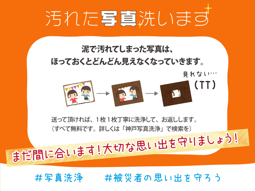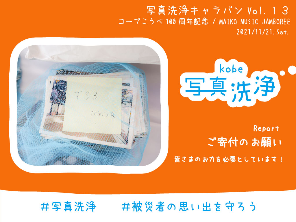 活動報告書_2021年度_11月 被災支援ボランティア団体 「おたがいさまプロジェクト」 被災支援ボランティア団体「おたがいさまプロジェクト」の 2021年11月の活動報告になります。 被災者の大切な思い出を守るため、地元神戸で、泥で汚れた写真を 1枚1枚丁寧に洗浄しました。 ※新型コロナウイルス感染拡大防止対策を徹底しての活動となりました。 活動場所被災地情報 西日本豪雨被害状況(2018年7月) 平成30年7月豪雨により、西日本を中心に、広域的かつ同時多発的に河川の氾濫、がけ崩れ等が発生。これにより、死者223名、行方不明者8名、家屋の全半壊等20,663棟、家屋浸水29,766棟の極めて甚大な被害が広範囲で発生。 岡山県倉敷市の被災状況 小田川(倉敷市真備町)では、洪水浸水想定区域と実際の浸水範囲がほぼ一致にもかかわらず、51名が死亡。特に死者の約8割が70歳以上。ハザードマップで示された想定浸水区域とほぼ一致する区域が浸水。 一番被害の多かった倉敷市真備町では未だ、約100人の被災者が建設型住宅での暮らしを余儀なくされている。 ・令和元年台風19号による被害等(2019年10月) 台風19号では、死者90名、行方不明者9名、住家の全半壊等4,008棟、住家浸水70,341棟の被害が。栃木県では死者4名、住家の全半壊等1,264棟、住家浸水13,200棟の被害。 <台風19号被害の特徴> ・年代別の犠牲者を近年の災害と比較すると、60代以上の被害が多い。また、屋外で犠牲になった比率が高い。洪水関連の犠牲者が多い。 ・「洪水」「河川」犠牲者の5割強が浸水想定区域内。 ・ここ5年間の水害・土砂災害の中で死者数・行方不明者数が2番目に多い。 <栃木市において> 栃木市では、台風後人口が大幅に減っており、特に浸水被害が大きかった地区では100人以上も減少。高齢化も著しく、自治会関係者らからは「コミュニティーを維持できなくなる」と不安の声が漏れている。 1.写真洗浄 日時/場所 ボランティア数 11月06日(土)10:00~12:00 @ 科学技術高等学校 / 述べ46名 11月13日(土)13:00~15:00 @ コープこうべ桜塚ふれあいセンター / 述べ25名 11月21日(日)13:00~15:00 @ 舞子公園 / 述べ46名 11月27日(土)10:00~12:00_13:00~15:00 @ ボランティアルーム / 述べ23名 受益対象者地域受益対象者数 作業枚数 倉敷市真備町(西日本豪雨)/ 栃木県栃木市(令和元年台風18号) 約136名 556枚 支援・協力団体 真備町写真洗浄@あらいぐま岡山(作業指導等) 追手門学院大学 社会福祉部(協力)、神戸市立科学技術高等学校(協力) コープこうべ第6地区本部・大阪北地区本部 内容 ①写真洗浄 ②プチ防災セミナー その他 コープともしびボランティア振興財団の助成事業になります。 詳細 ① 写真洗浄- ※写真洗浄とは 「写真洗浄」とは、自然災害の中でも、主に水害によって汚れてしまった写真を、1枚ずつ丁寧に洗浄する復興支援活動です。 具体的には、汚れてしまった写真はバクテリアが周りから浸食して白くなり、やがて写っているものが見えなくなっていくため、水とエタノール水溶液を使って洗浄します。 この活動は、現地に向かわずとも被災者に寄り添えることができ、また力仕事に自信がない方やボランティア初心者に特に向いています。 <活動の成果> 1.被災者の思い出を守り、復興支援への後押しをする事ができた。 2.写真洗浄ボランティアを世間に広める一助となった。 3.被災地ではない地域で、復興支援を行えた。 4.過去の文化財(写真)の遺失を防ぐことができた。 5.写真洗浄を通して被災地の現状を伝える事ができた。 6.被災地の現状を伝えることで、災害の風化を防ぐ一助となった。 7.地元の支援団体や学校と協同することで、防災への連携強化に繋がった。 遠方でも出来る復興支援 体力には自信が無かったり遠方で行けなかったりするが、「被災地の役に立ちたい」 という多数の声を伺い、地元で復興支援が出来ないかと本企画を立ち上げたところ、 ご年配の方も含め、多少の障害を持っている方や親子連れの参加もあり十分な手応え を感じおります。※活動にあたり、写真洗浄の第一団体である「真備町写真洗浄」様 に写真提供やアドバイスを頂いております。 学生と手を取り合って 2年越しに神戸市立科学技術高等学校の文化祭において出張の写真洗浄を行うことができました。コロナ禍において学生のみの文化祭となりましたが、生徒会の方が率先してサポートして頂いたおかげで、30人の学生の方に写真洗浄を通じて、復興支援や防災・減災について考えていただける時間をご提供できました 地域と手を取り合って コープこうべさまとは昨年から写真洗浄場所のご提供を頂いており、100周年のイベントの一環ではオンライン配信で当団体を紹介していただきました。今月は大阪北地区本部下の写真洗浄、そして100周年イベントのひとつである、音楽フェスタ「MAIKO MUSIC JAMBOREE」を舞子公園で実施され、当団体の写真洗浄を出店させていただきました。 当日は写真洗浄をご存じない方が多く、特に家族連れの方に写真洗浄を知っていただく大切な機会とな